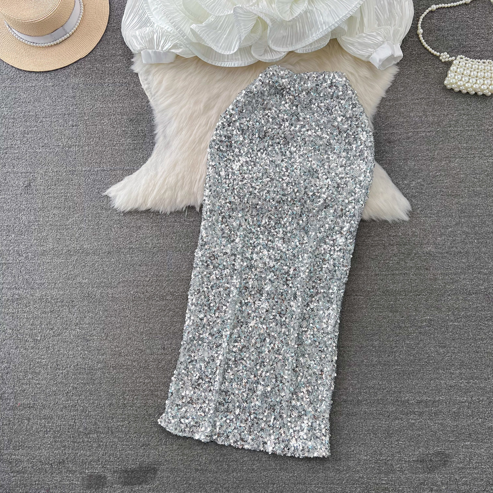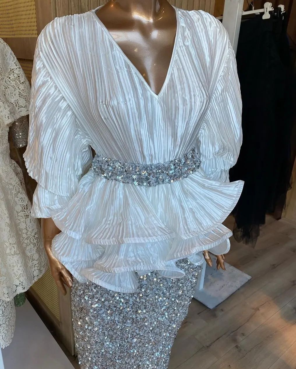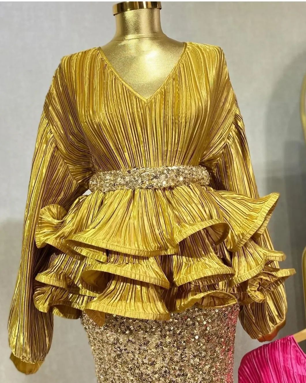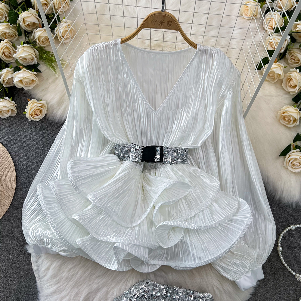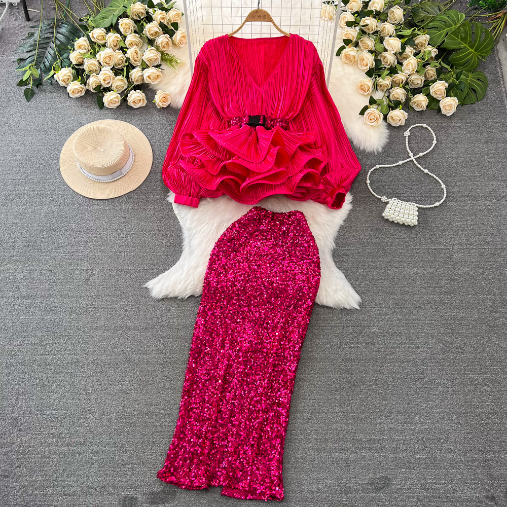 유행 세트 여성 사교계 우아한 등불 긴팔 V 넥 로터스 잎 밝은 셔츠 여성의 높은 허리 스퀸 스커트