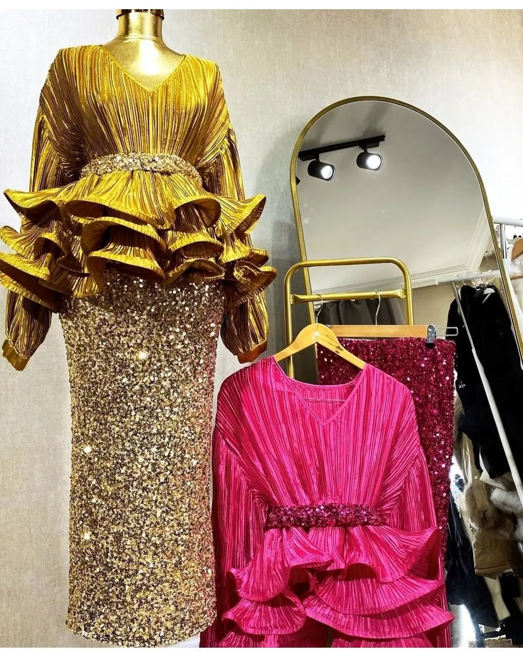 유행 세트 여성 사교계 우아한 등불 긴팔 V 넥 로터스 잎 밝은 셔츠 여성의 높은 허리 스퀸 스커트스토어 가기