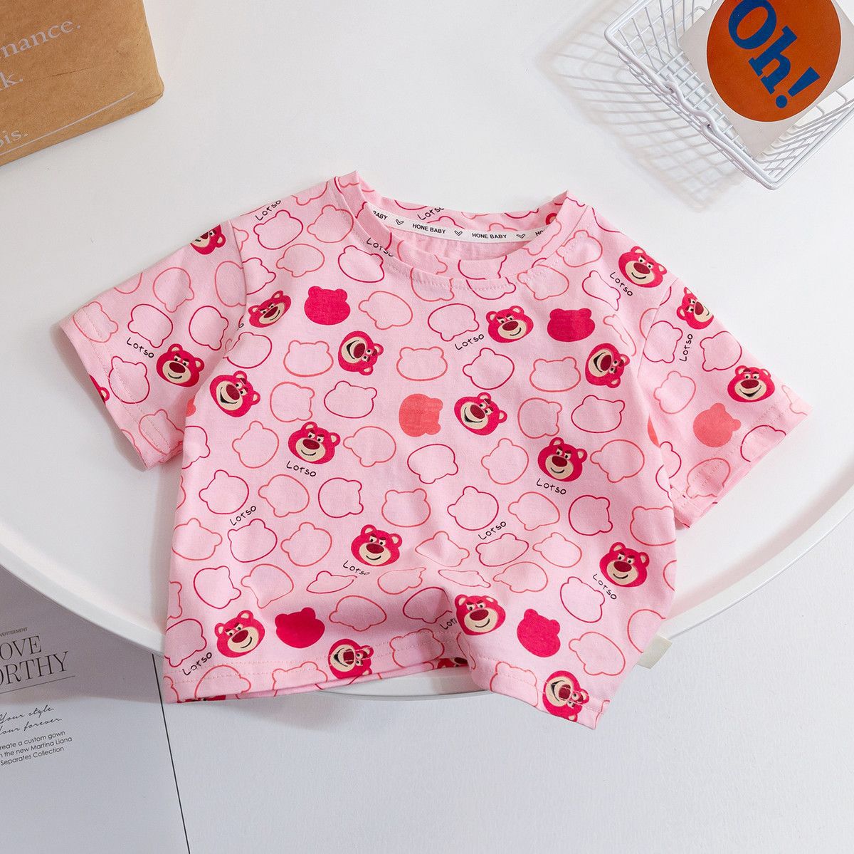 2024 여름 새로운 아동복 티셔츠 소년 소녀 패션 서양 스타일 귀여운 만화 전체 인쇄 딸기 곰 유행스토어 가기