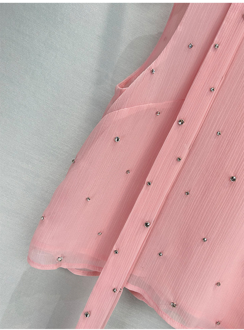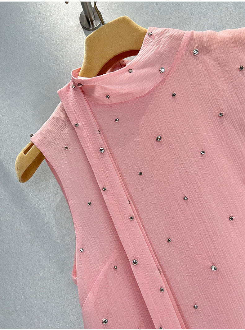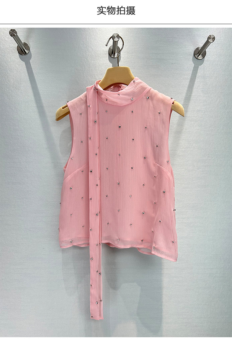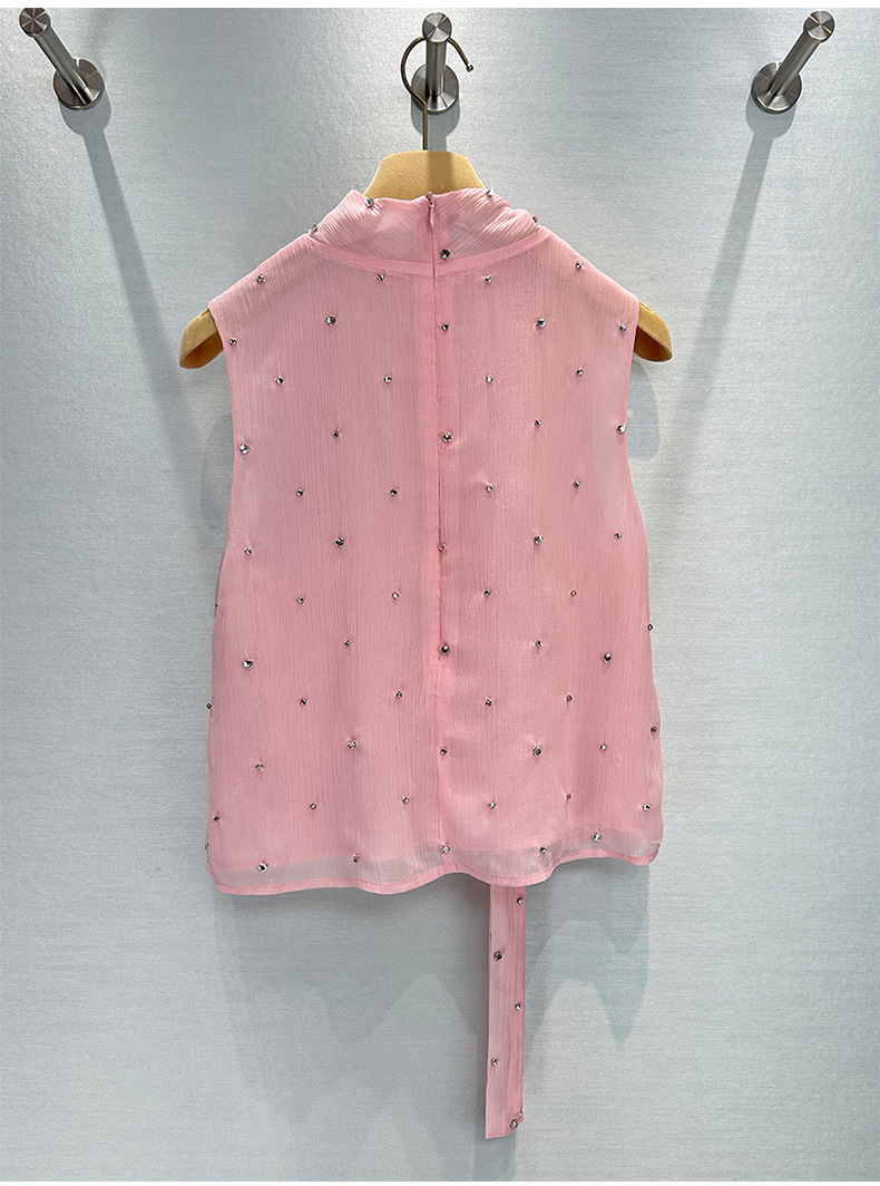 Miu 스타일 핑크 다용도 민소매 셔츠 핸드메이드 다이아몬드 레이스 업 스위트 디자인 풀오버 셔츠 여성 여름 탑