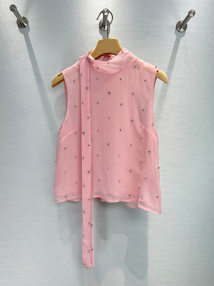 Miu 스타일 핑크 다용도 민소매 셔츠 핸드메이드 다이아몬드 레이스 업 스위트 디자인 풀오버 셔츠 여성 여름 탑스토어 가기