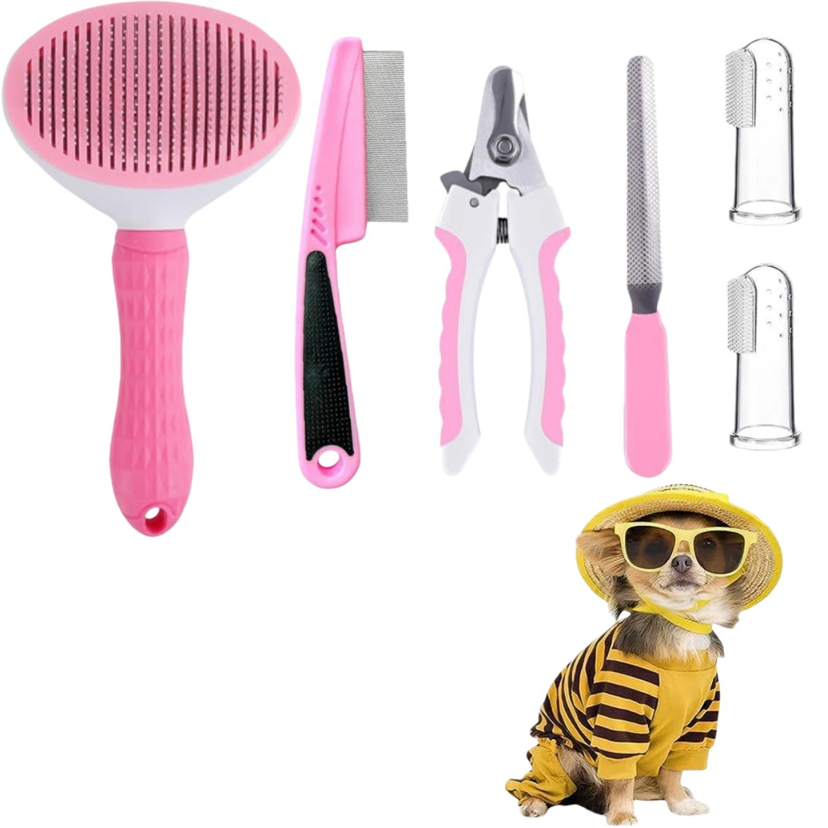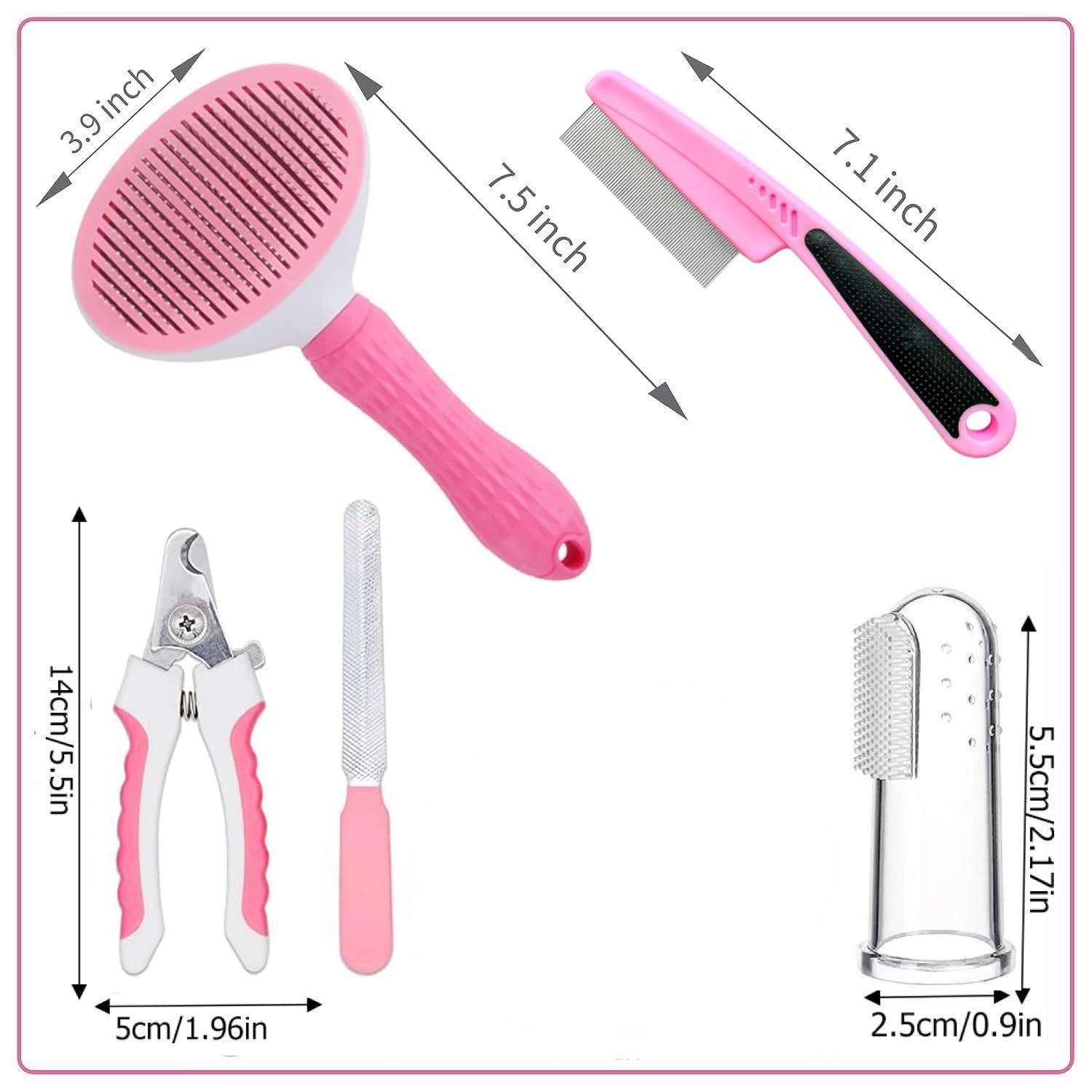7 피스 세트 개 손질 세트 머리 제거 빗, 벼룩 빗, 네일 커터, 목욕 브러시, 손가락 커버 라벨