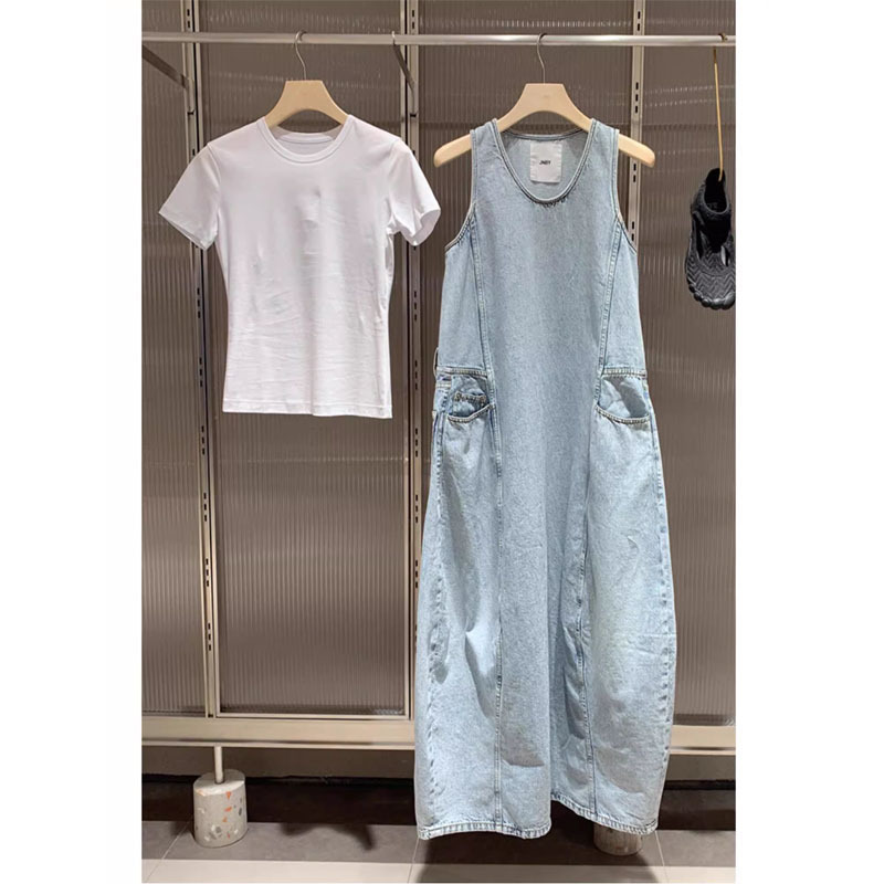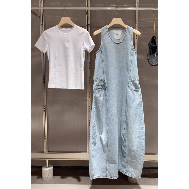 올해 인기 작은 패션 튀김 거리 반팔 티셔츠 라이트 블루 데님 서스펜더 스커트 세트 여성 여름스토어 가기