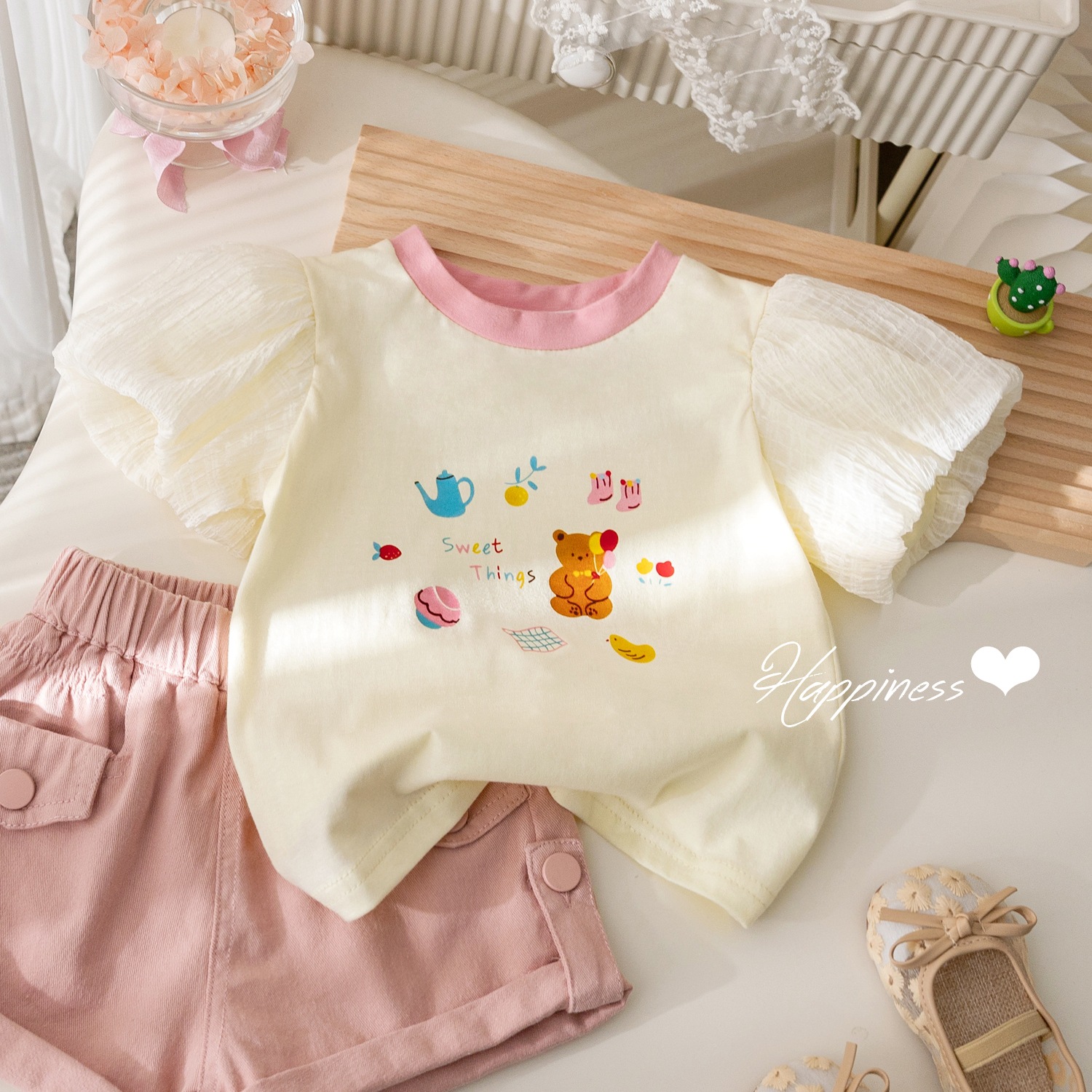 여자 반팔 티셔츠 한국식 꽃 봉오리 소매 최고 여름 새로운 도착 여성 아기 서양식 버블 소매 바닥면스토어 가기
