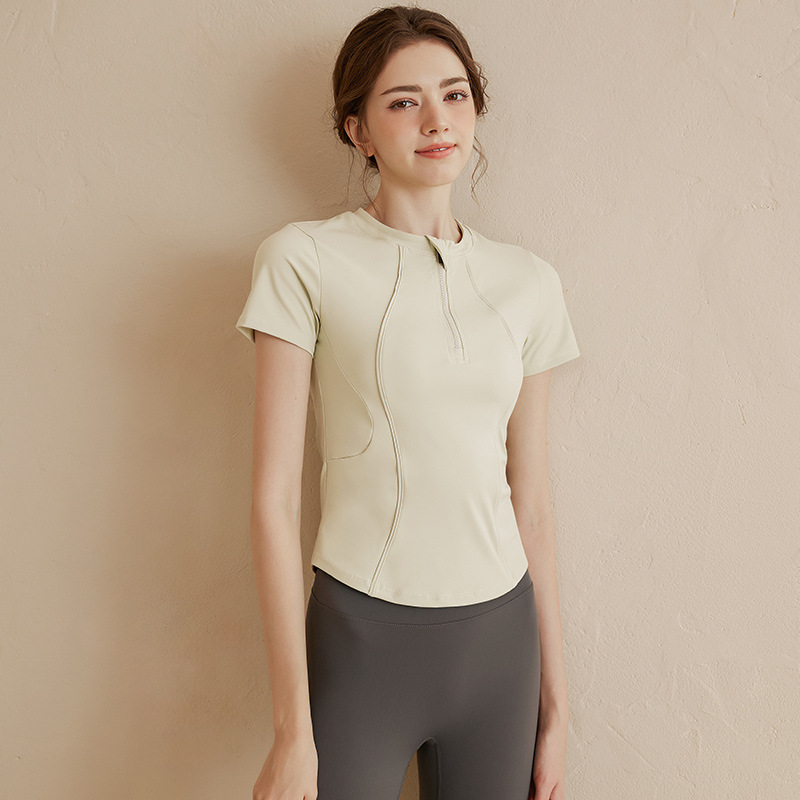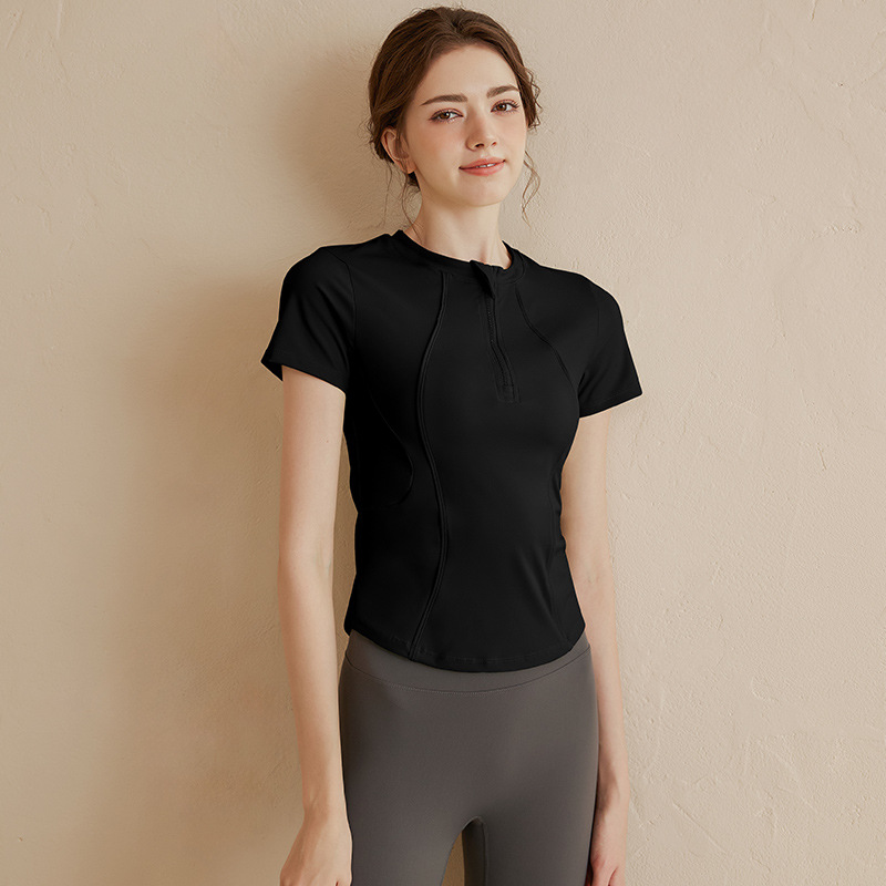 피트니스 탑 여성 여름 스트레치 반 지퍼 얇은 슬림 빠른 건조 스포츠 티셔츠 달리기 단단한 요가 옷 짧은 소매