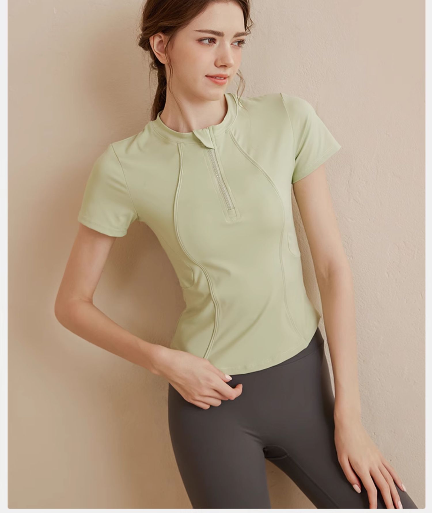 피트니스 탑 여성 여름 스트레치 반 지퍼 얇은 슬림 빠른 건조 스포츠 티셔츠 달리기 단단한 요가 옷 짧은 소매스토어 가기
