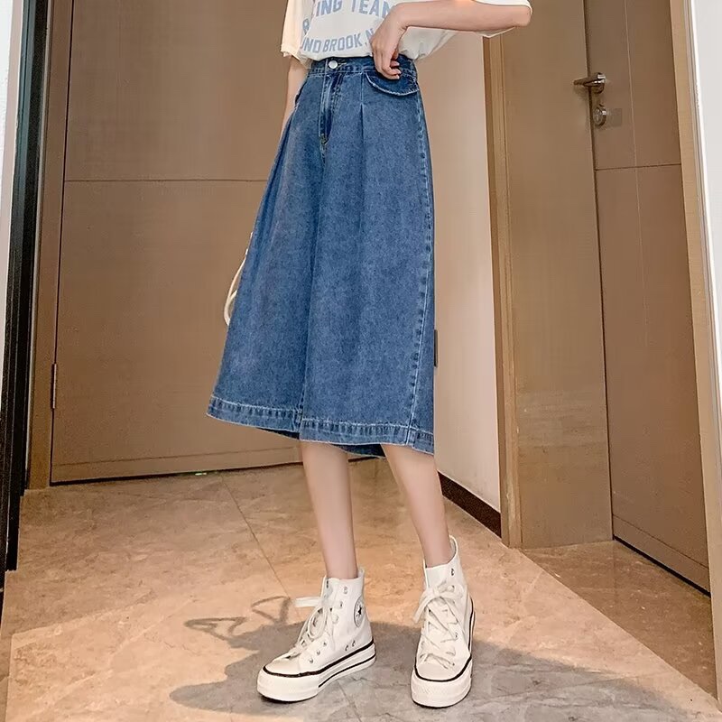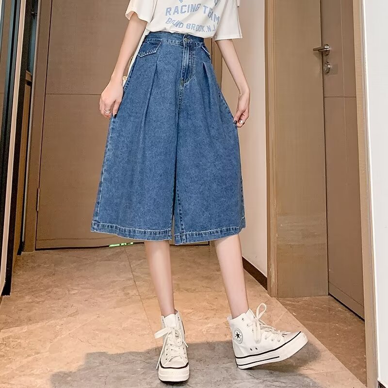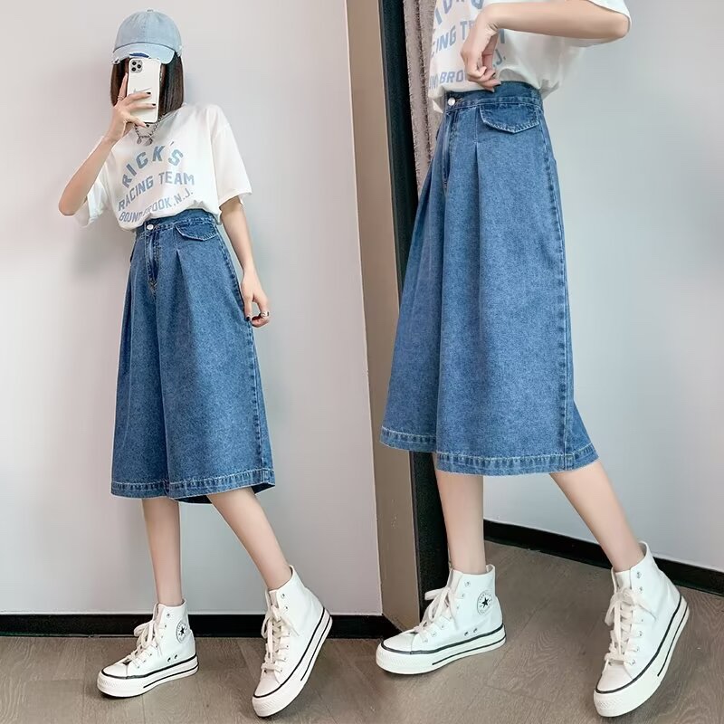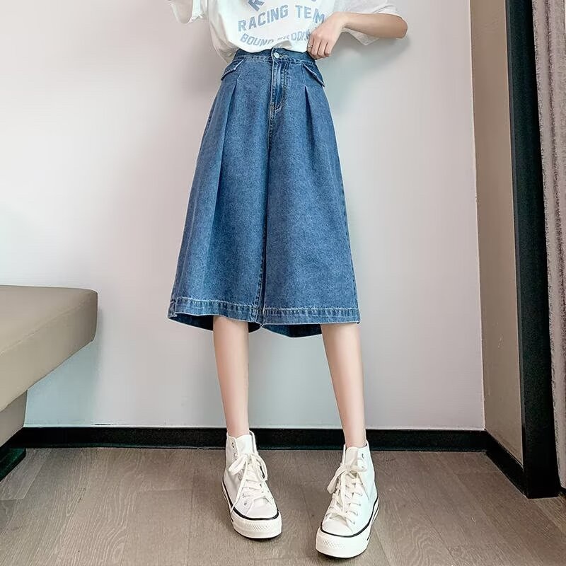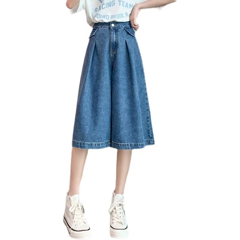 플러스 사이즈 패션 자른 데님 넓은 다리 바지 여자 2024 년 여름 새로운 높은 허리 느슨한 슬리밍 올매치 스트레이트 바지스토어 가기