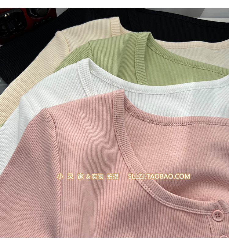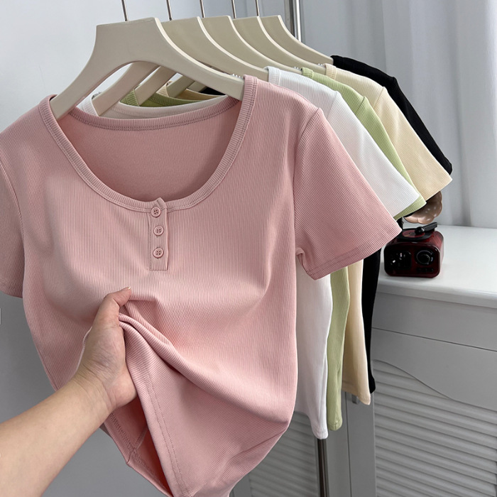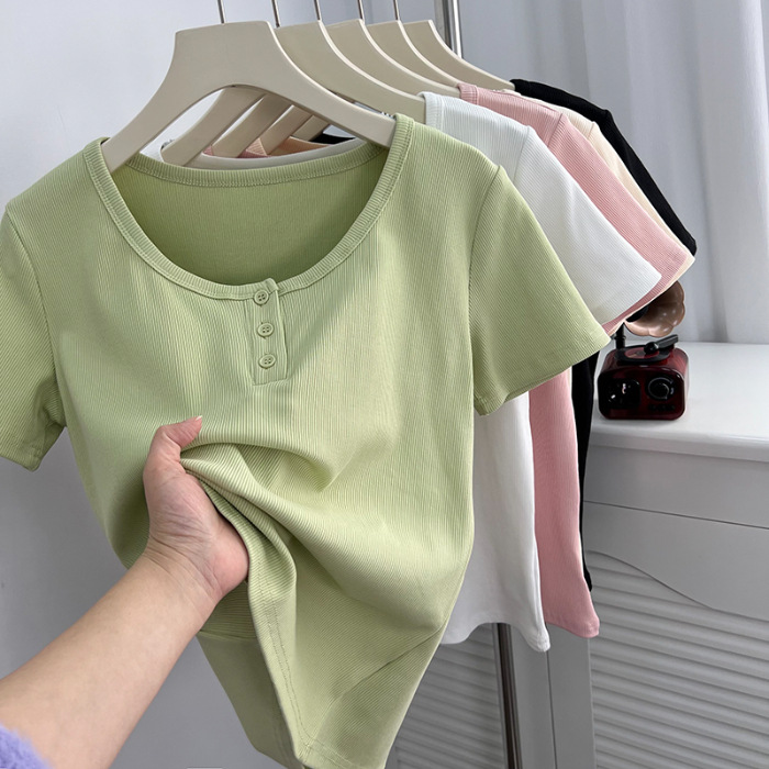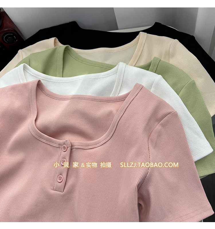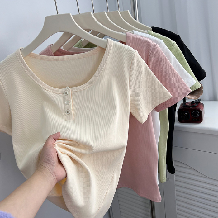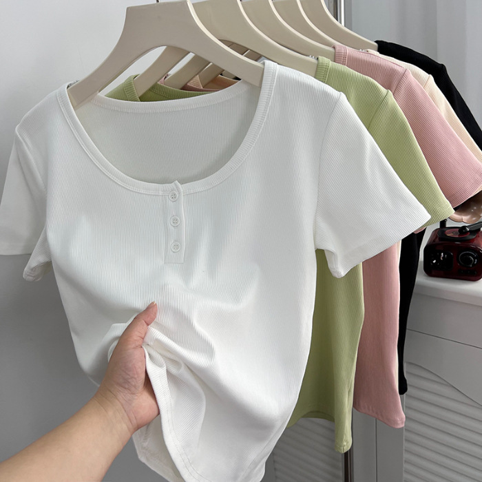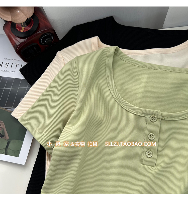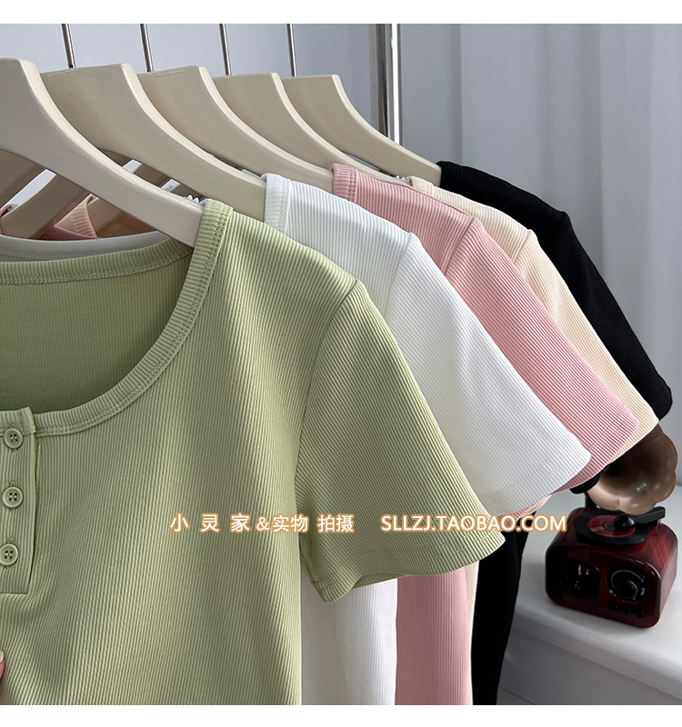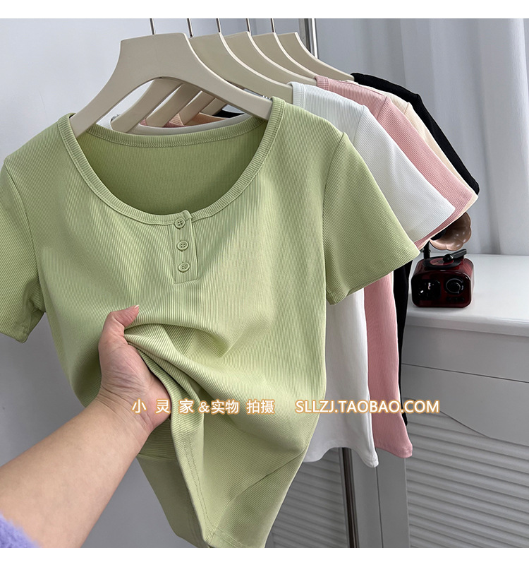 u领锁骨修身正肩短袖t恤女夏纽扣设计感短款小个子纯欲螺纹棉上衣