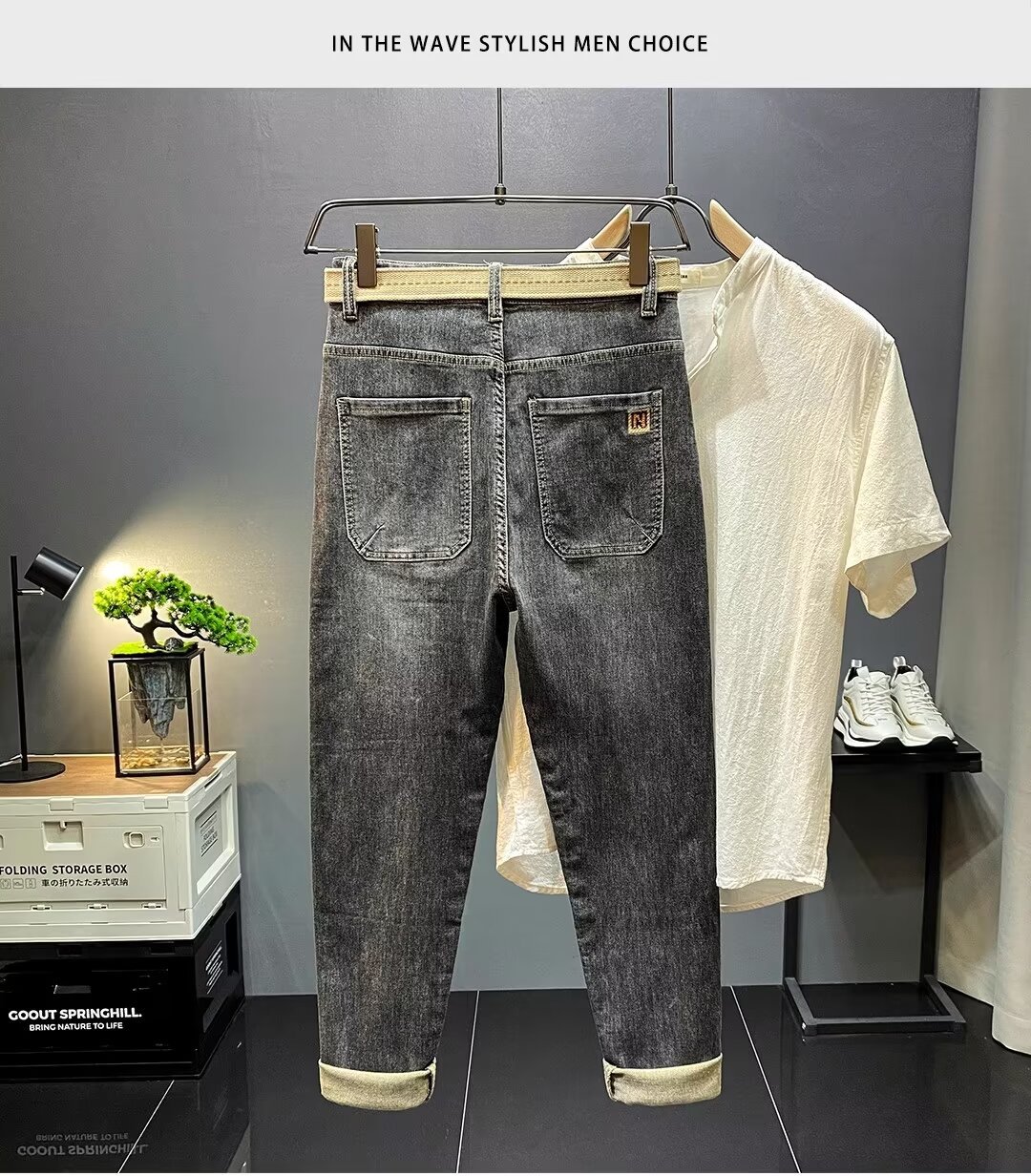 청바지 남자 2024 년 여름 새로운 유행 브랜드 연기 그레이 올 매치 경사 캐주얼 슬림 핏 크롭 팬츠