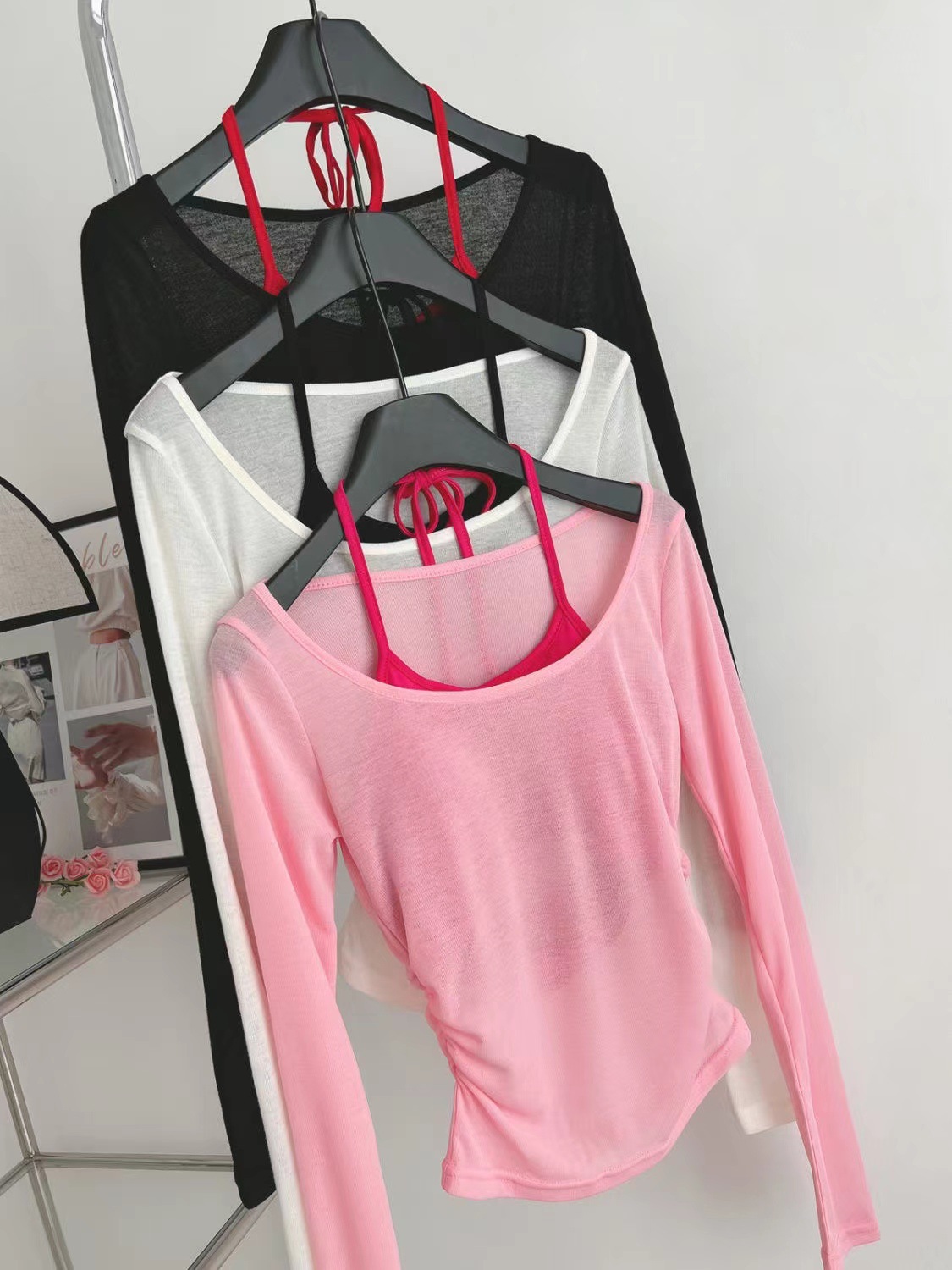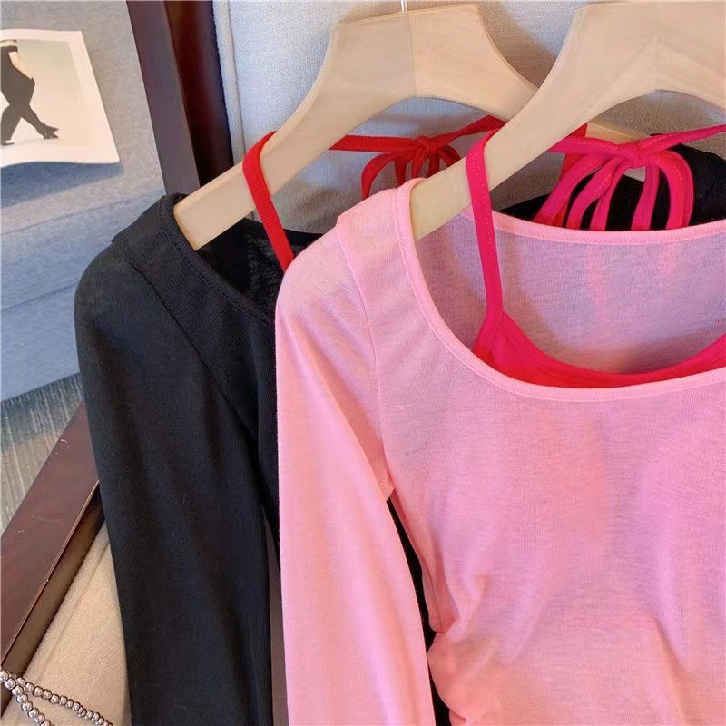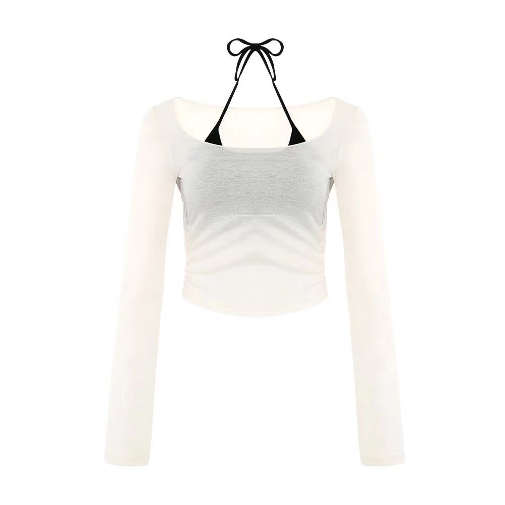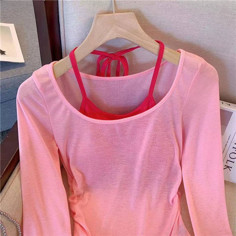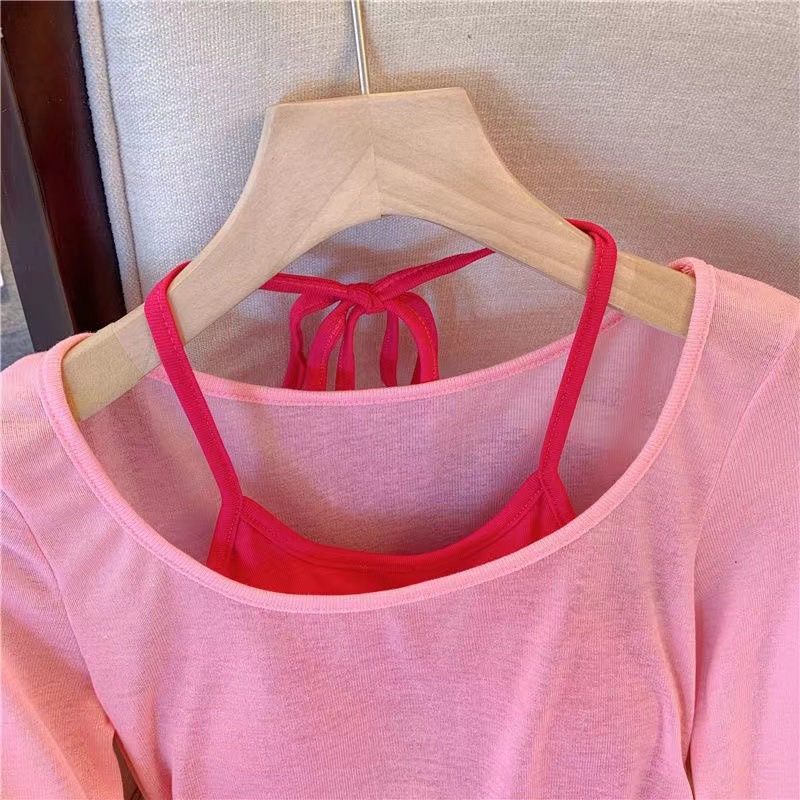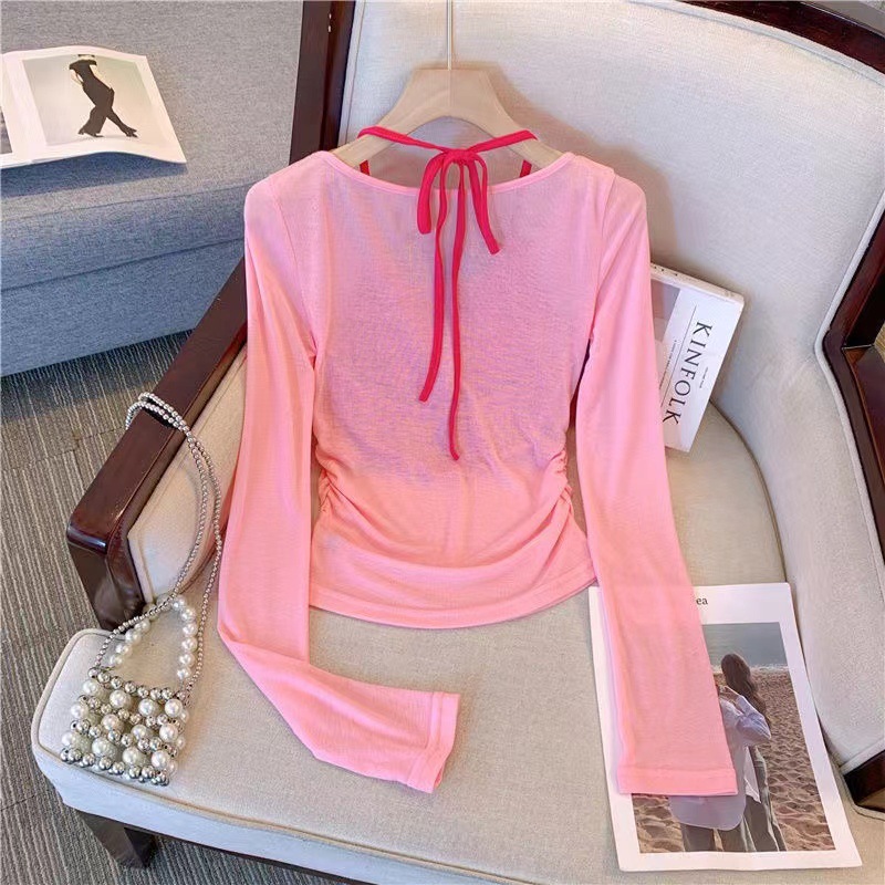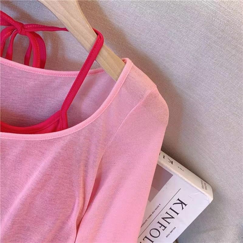 핑크 도파민 자외선 차단 홀터넥 니트 여성 투피스 세트 디자인 감각적인 인기 얇은 긴팔 상의 여름스토어 가기