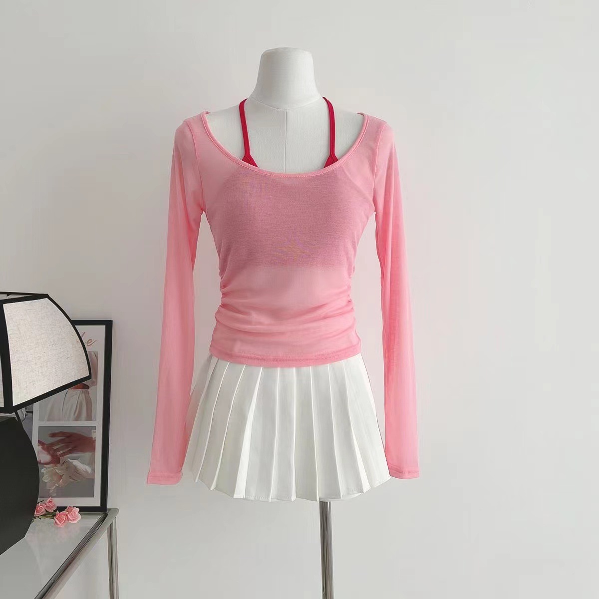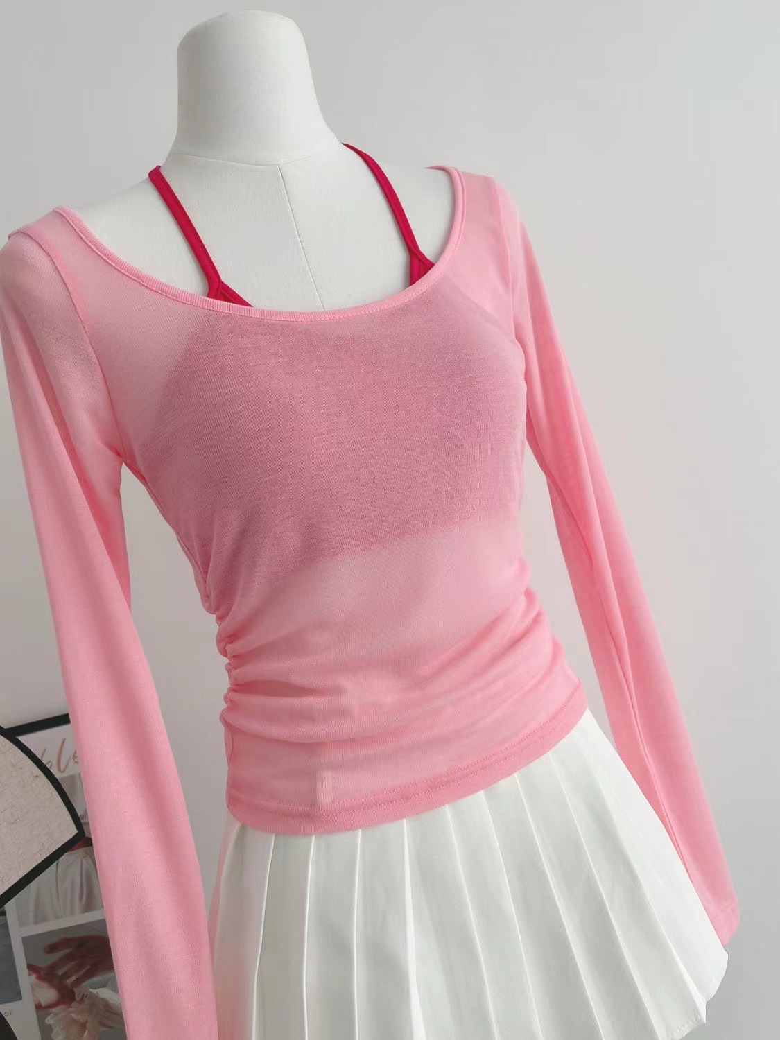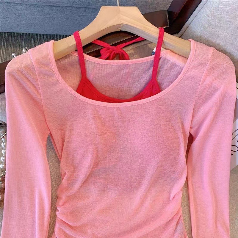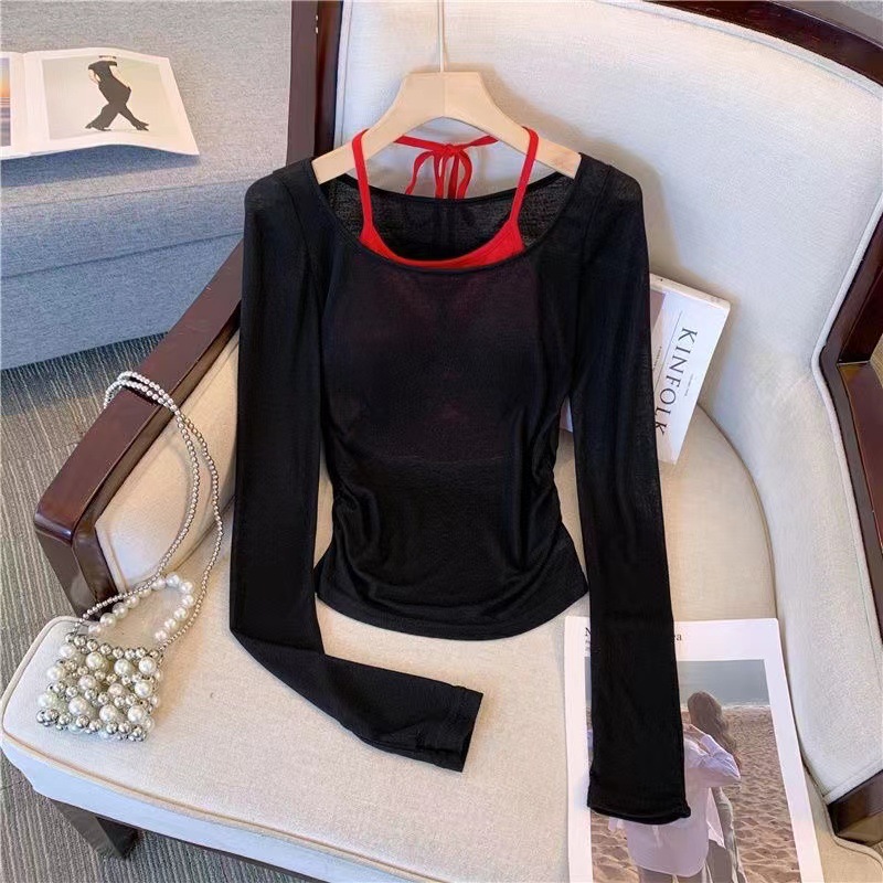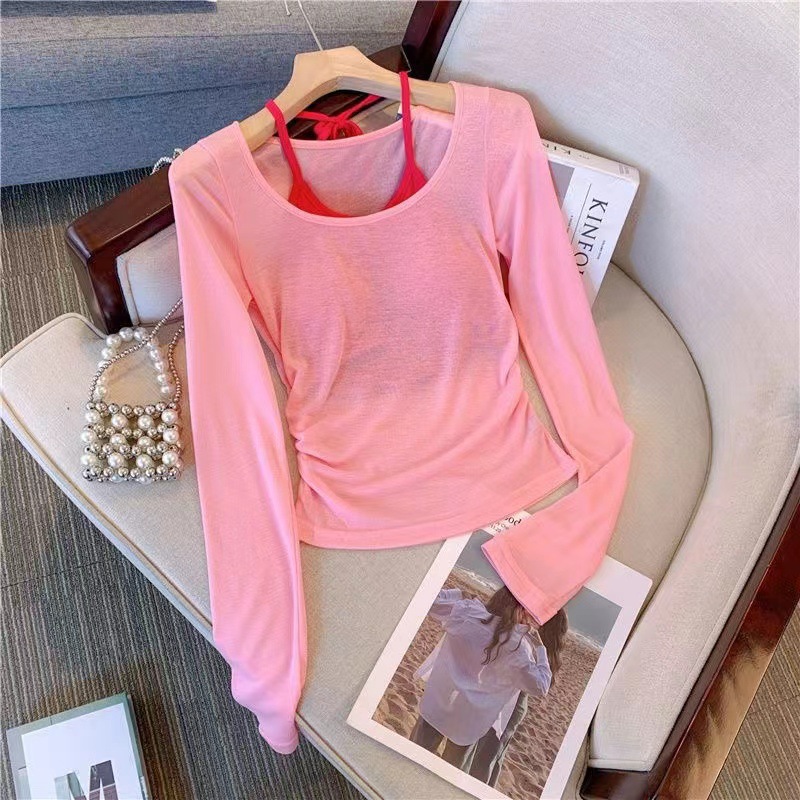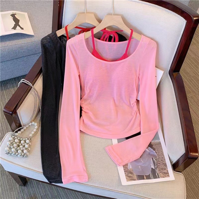 핑크 도파민 자외선 차단 홀터넥 니트 여성 투피스 세트 디자인 감각적인 인기 얇은 긴팔 상의 여름스토어 가기