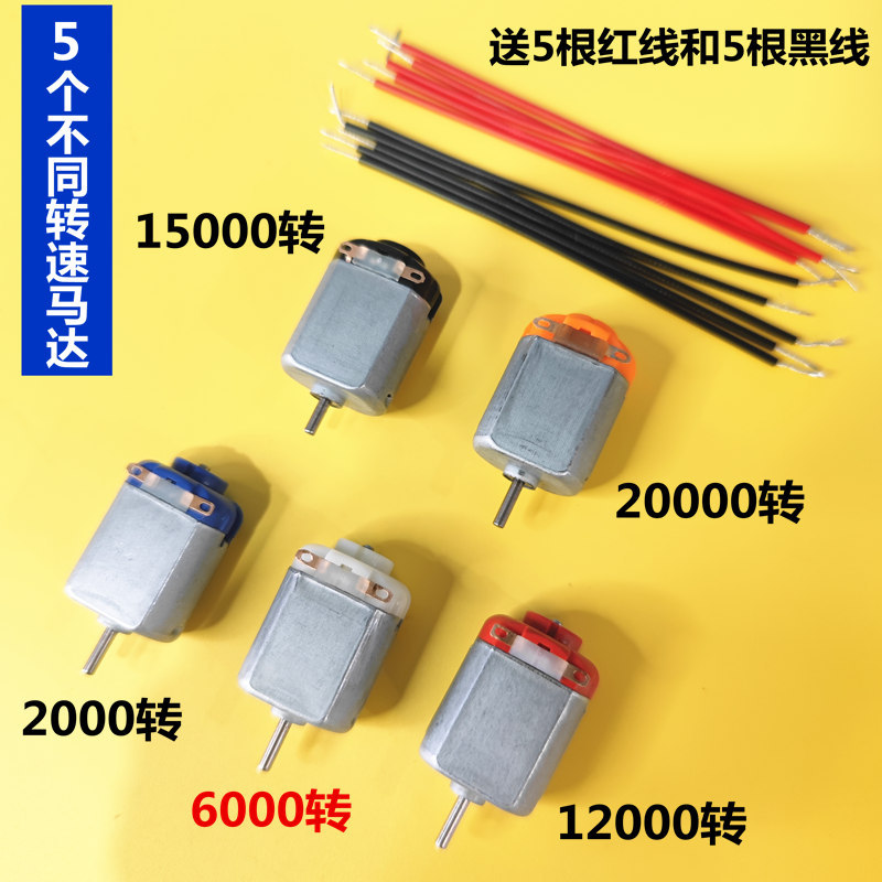 大家好,5个不同转速马达套装来了,套装包含5个不同转速的马达,并配有5根红线和5根黑线。线长是10cm,套餐可以指定你要的转速,需要更换马达跟客服联系。