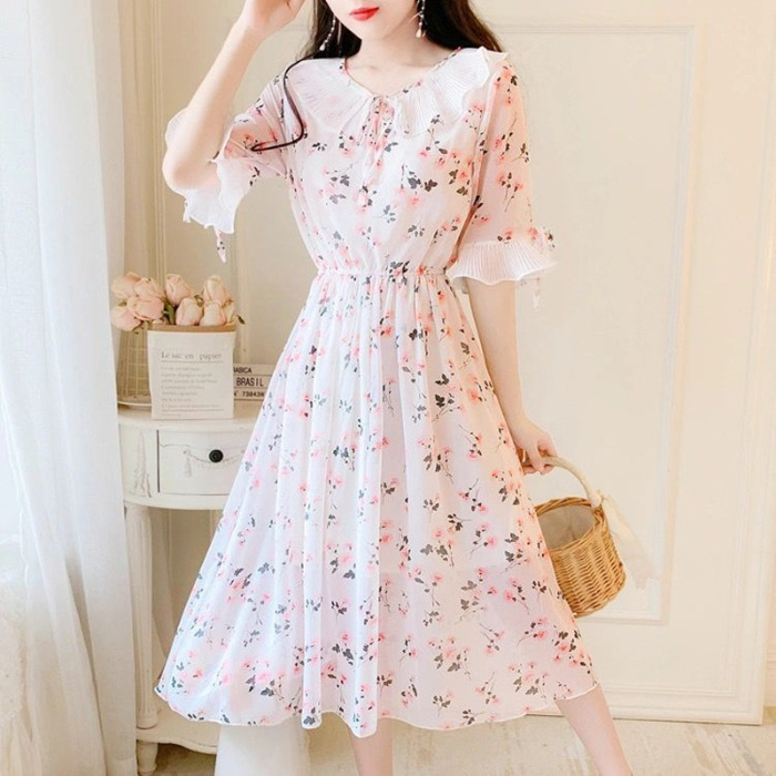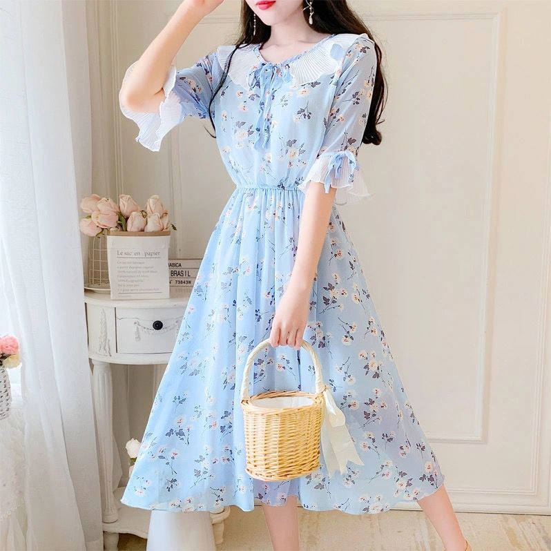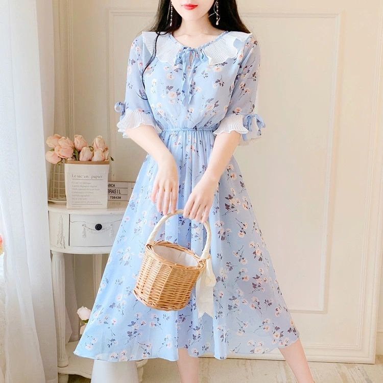 2024 여름 통통녀 여름 중간 길이 원피스 달콤한 인형 칼라 프랑스 꽃 쉬폰 요정 원피스 여성스토어 가기