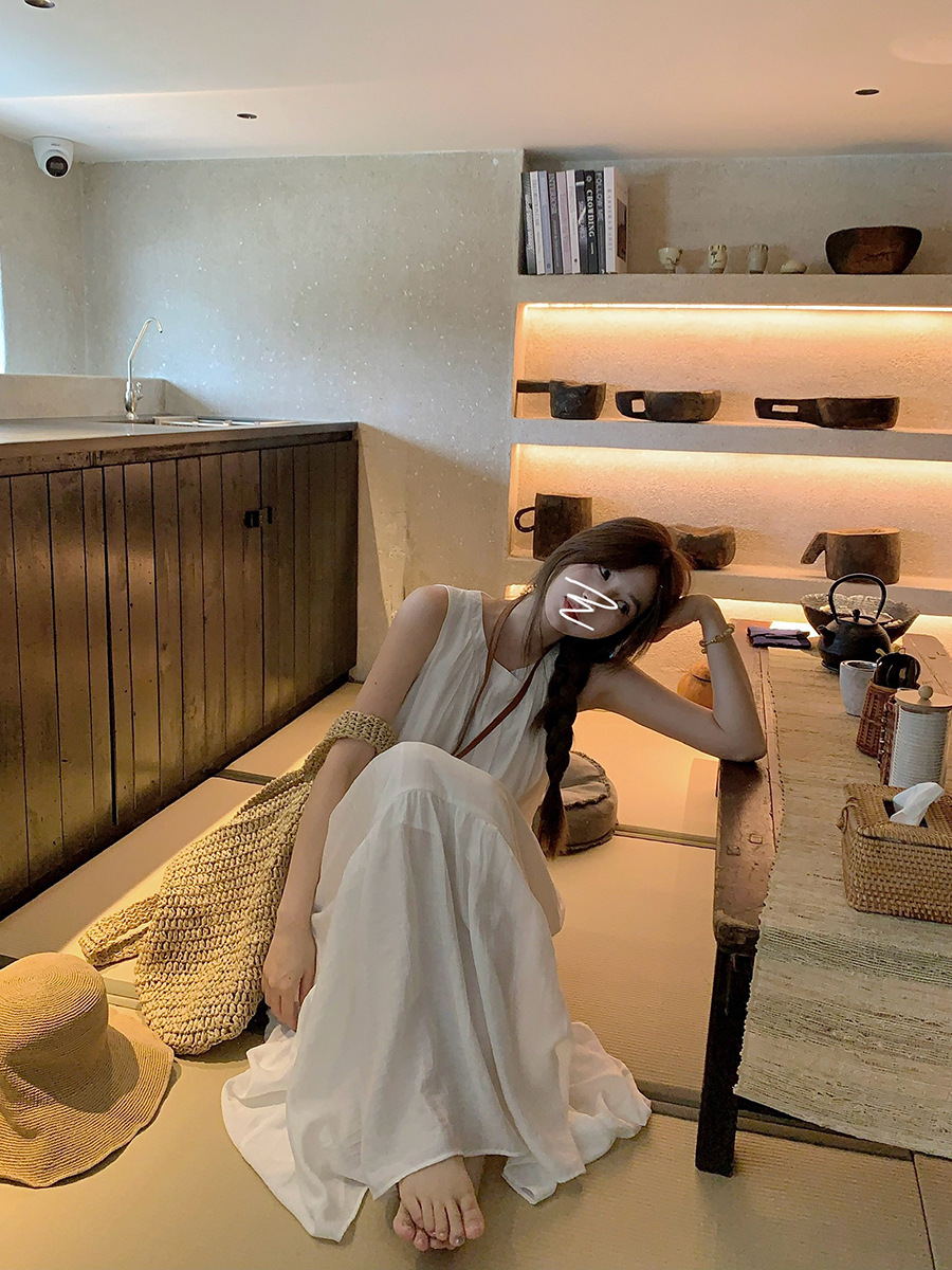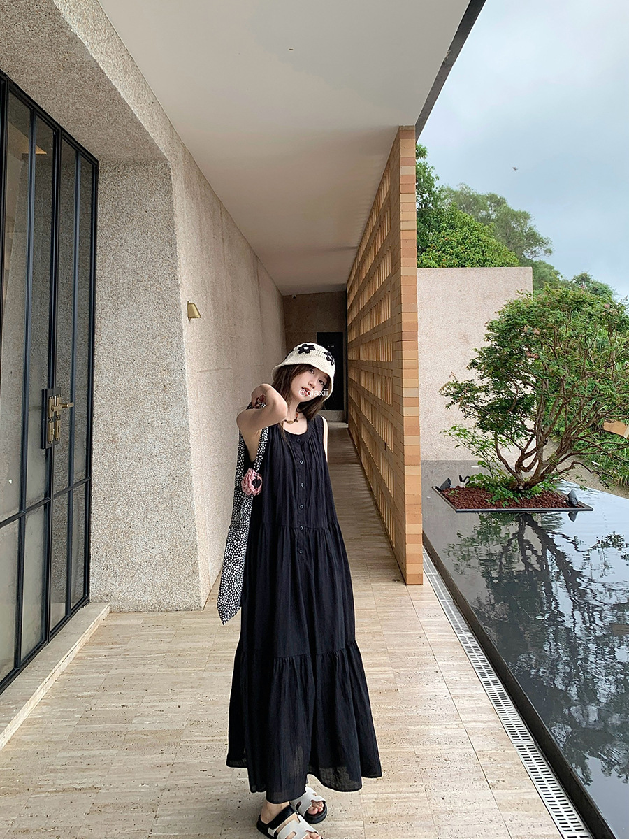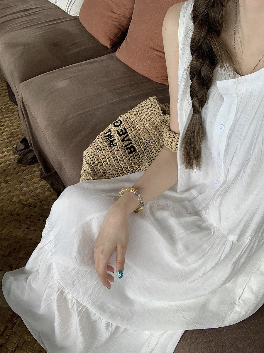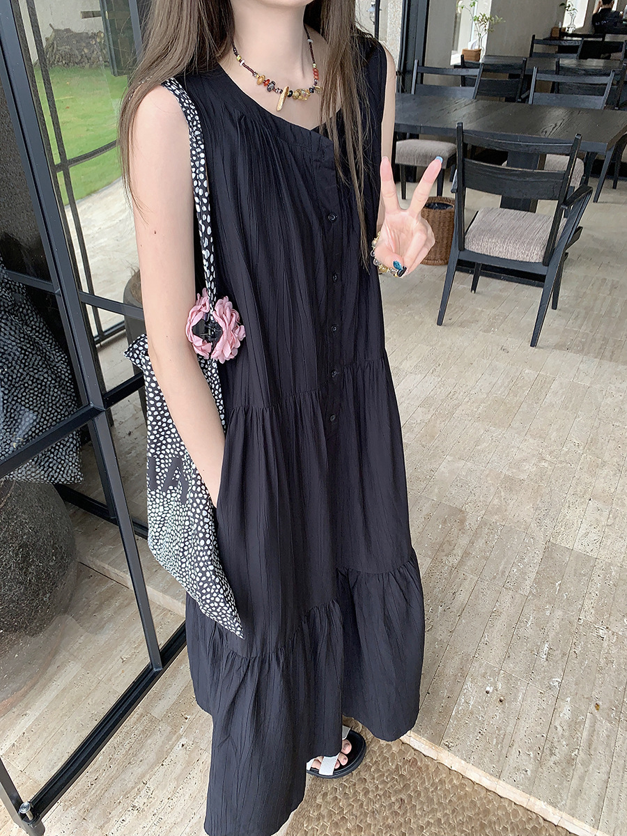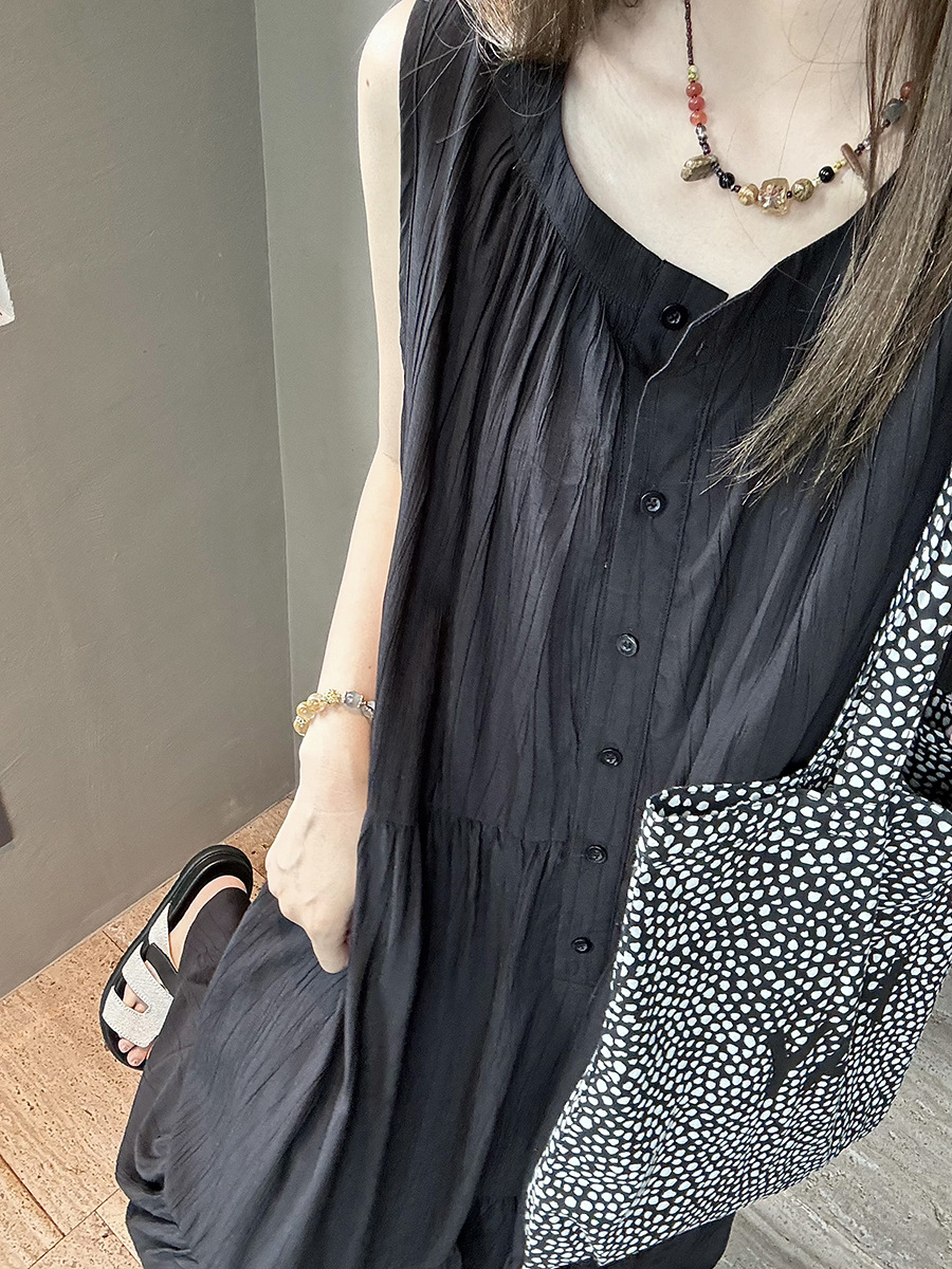 진짜 샷 디자인 감각 틈새 느슨한 슬림 원피스 여성 여름 느슨한 질감 센스 조끼 긴 스커트 66593