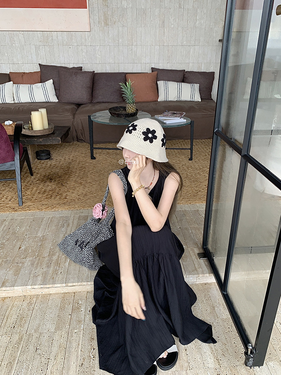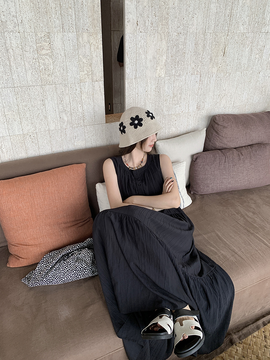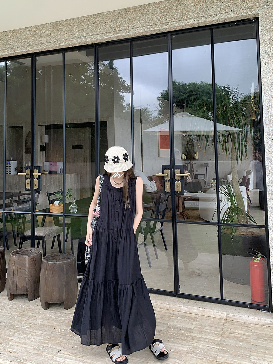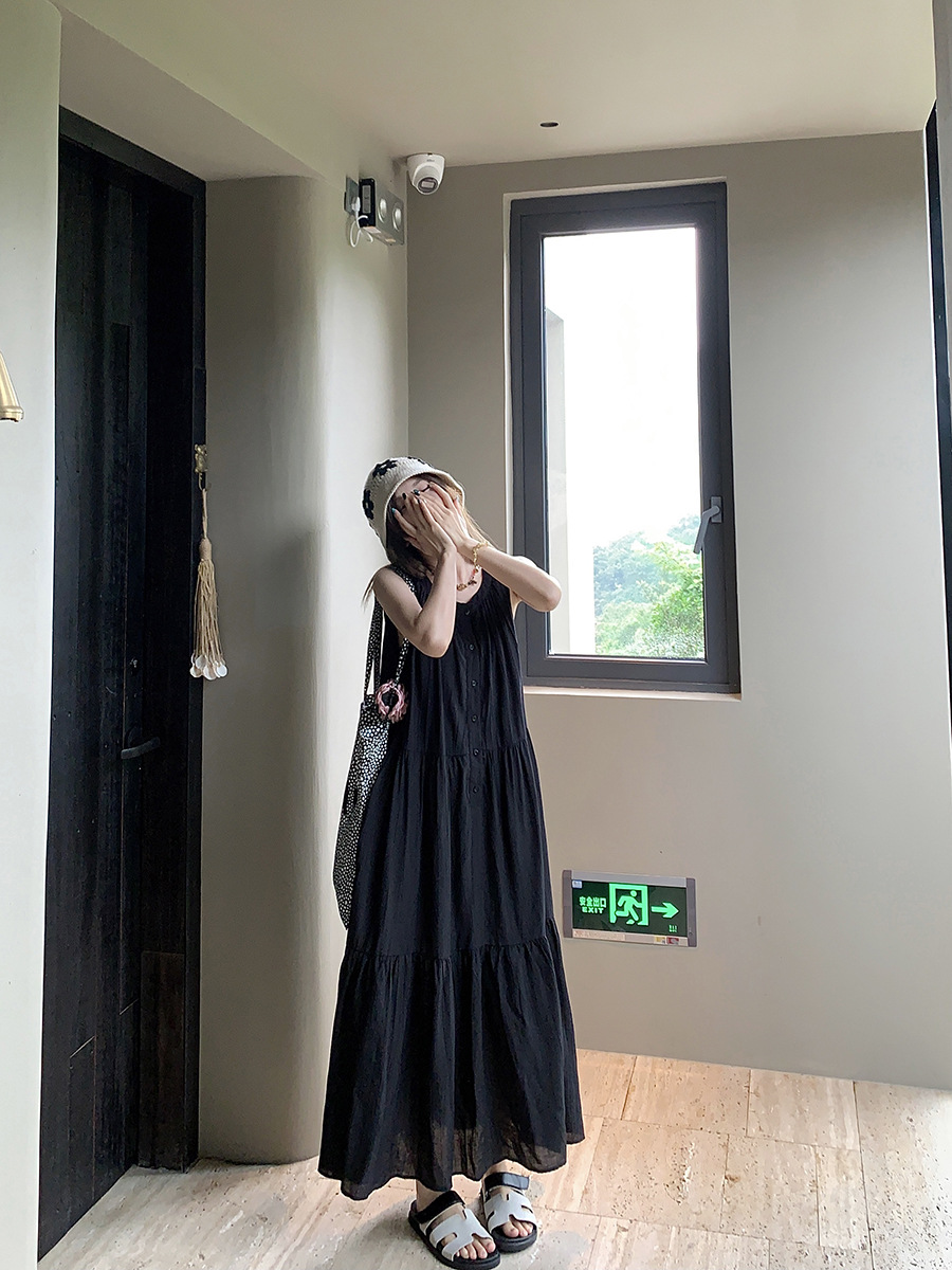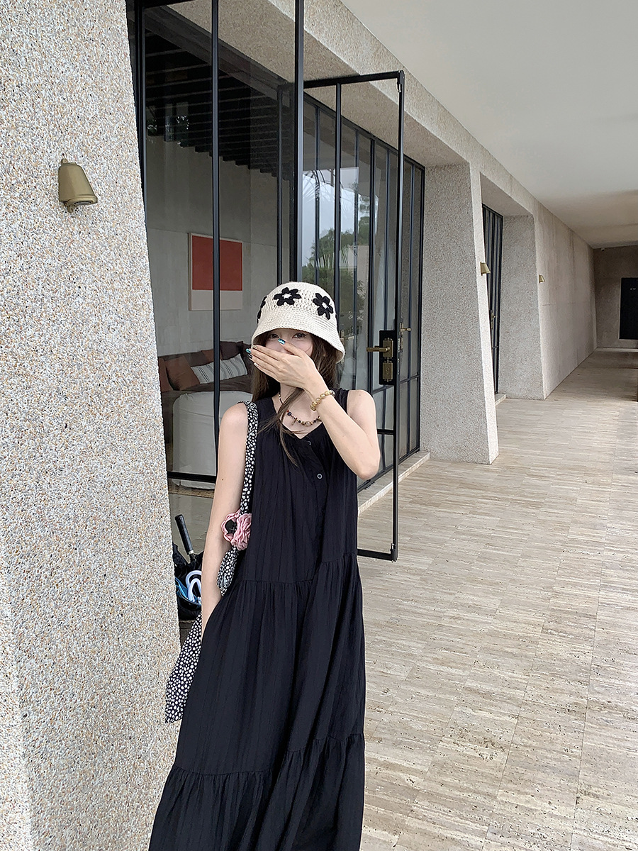진짜 샷 디자인 감각 틈새 느슨한 슬림 원피스 여성 여름 느슨한 질감 센스 조끼 긴 스커트 66593
