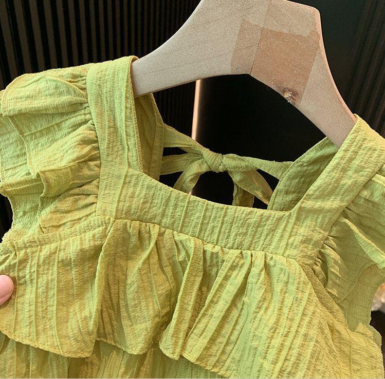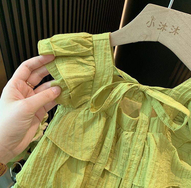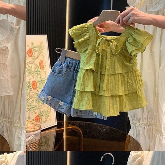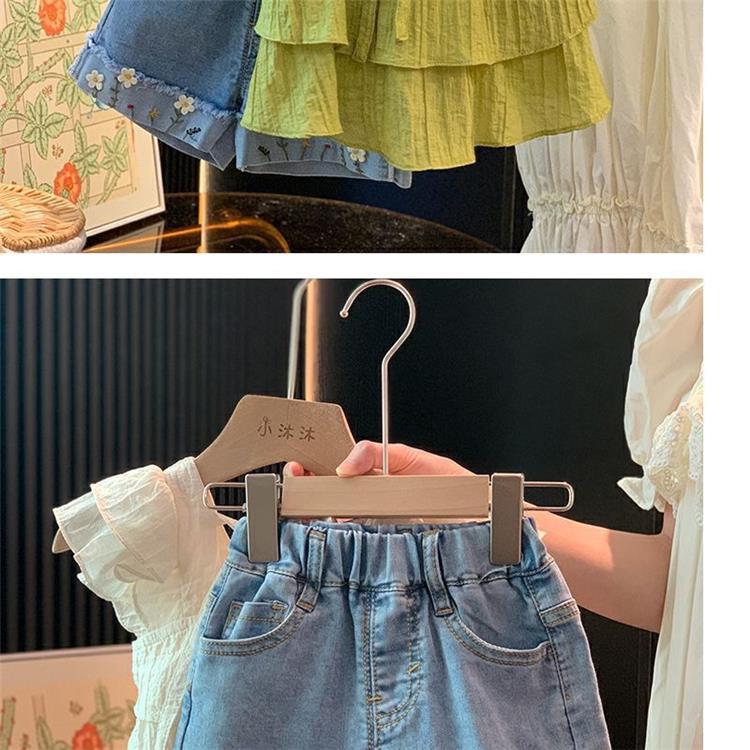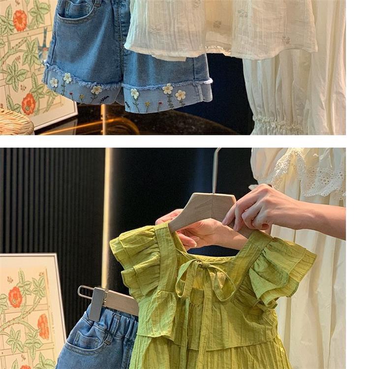소녀 2024 여름 새로운 소 광장 칼라 러플 탑 자수 꽃 데님 반바지 투피스 세트스토어 가기