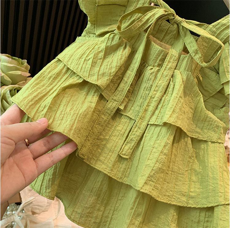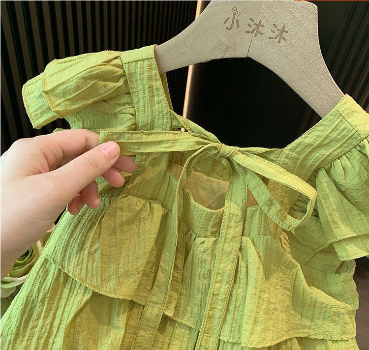 소녀 2024 여름 새로운 소 광장 칼라 러플 탑 자수 꽃 데님 반바지 투피스 세트