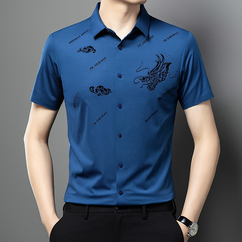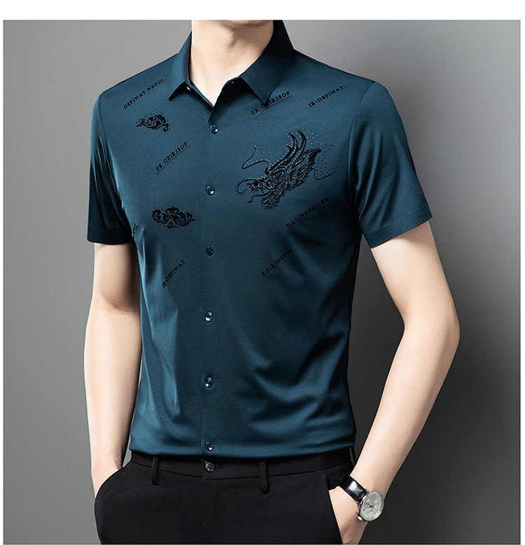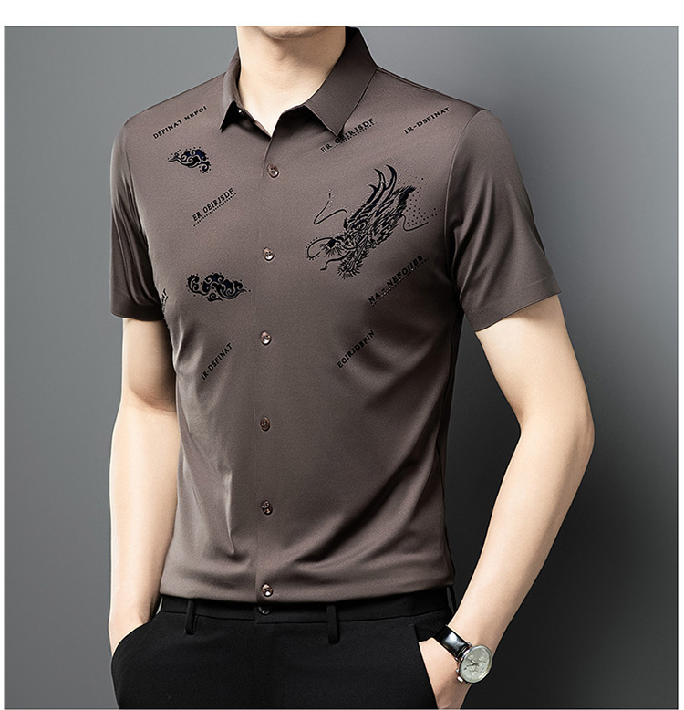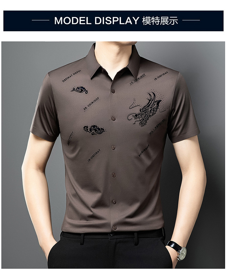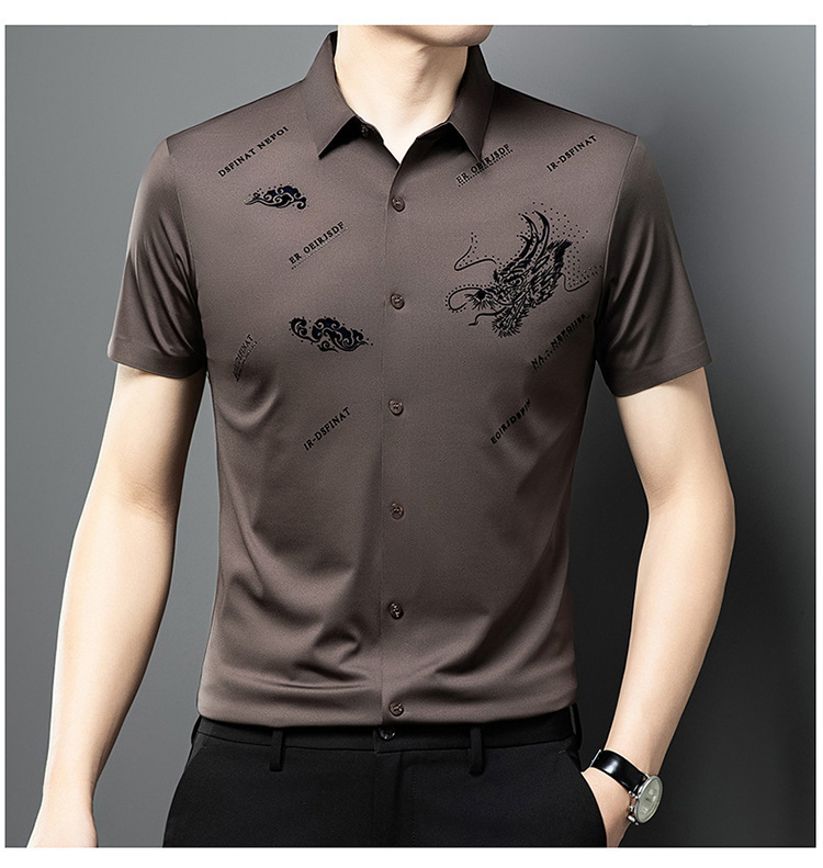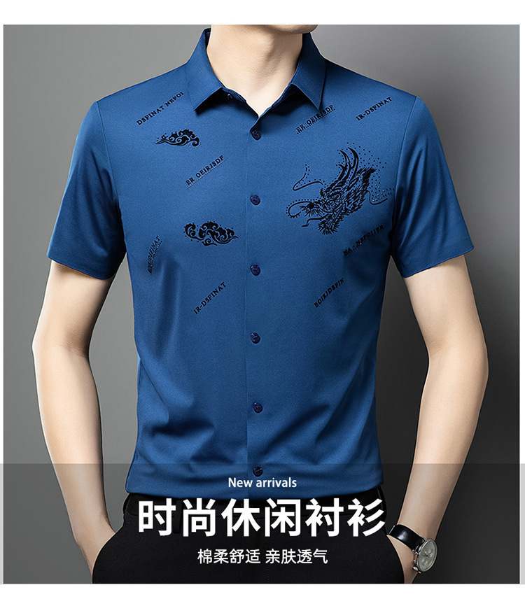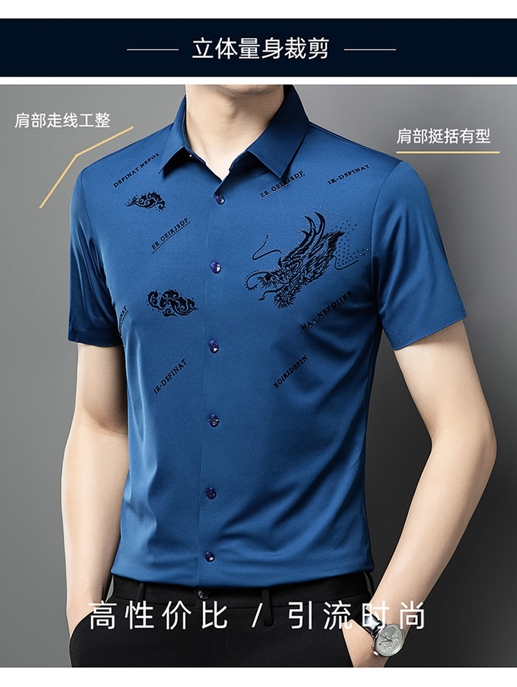 夏季新款男式短袖无痕衬衫休闲男装上衣时尚印花免烫薄款衬衣