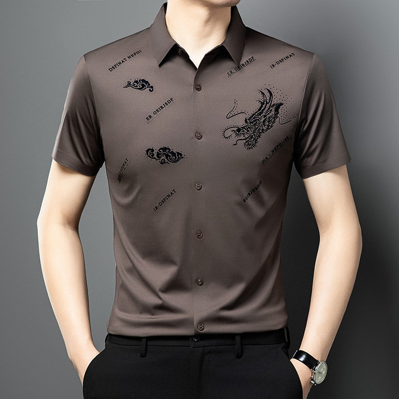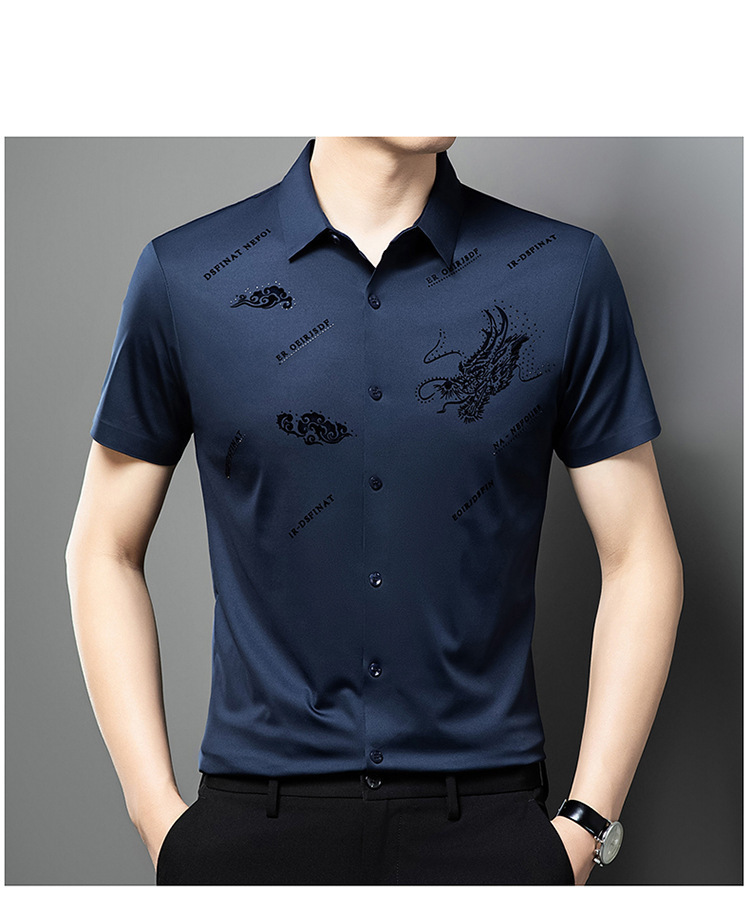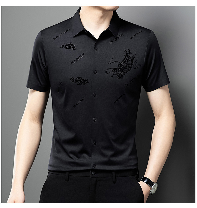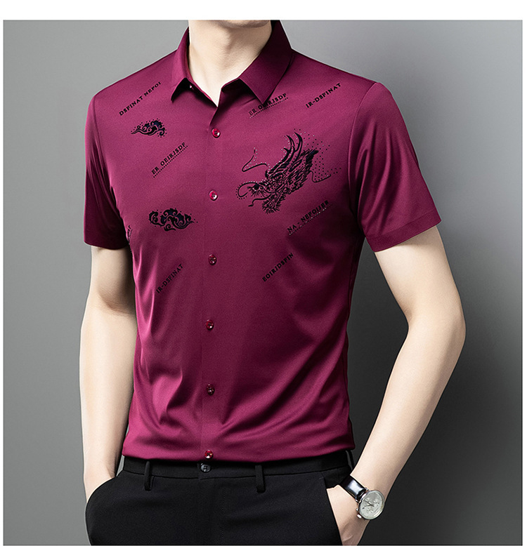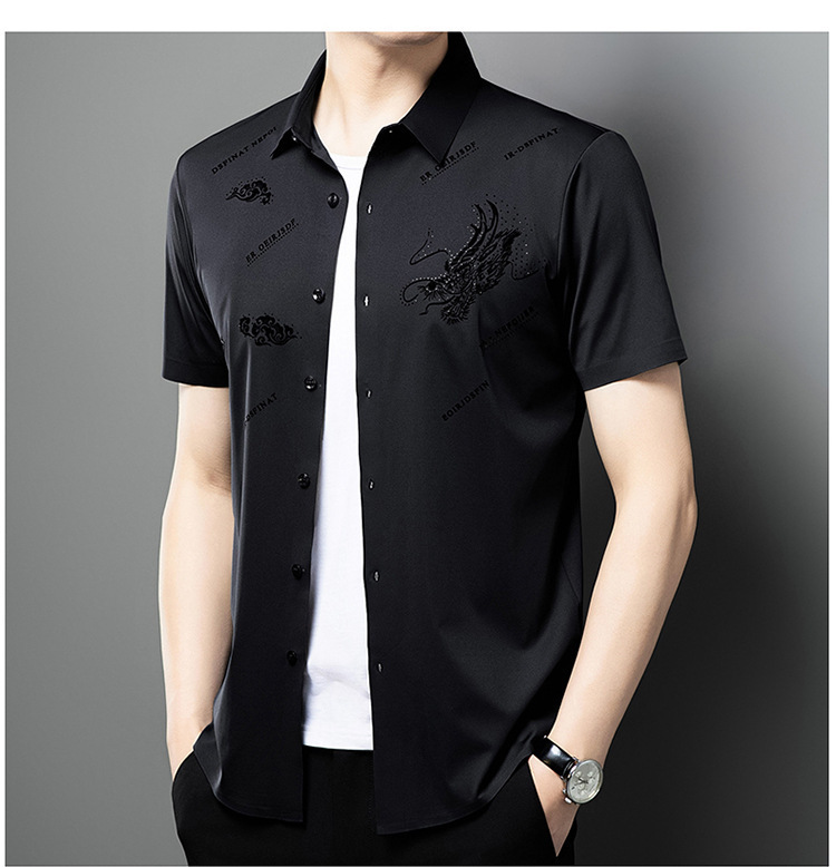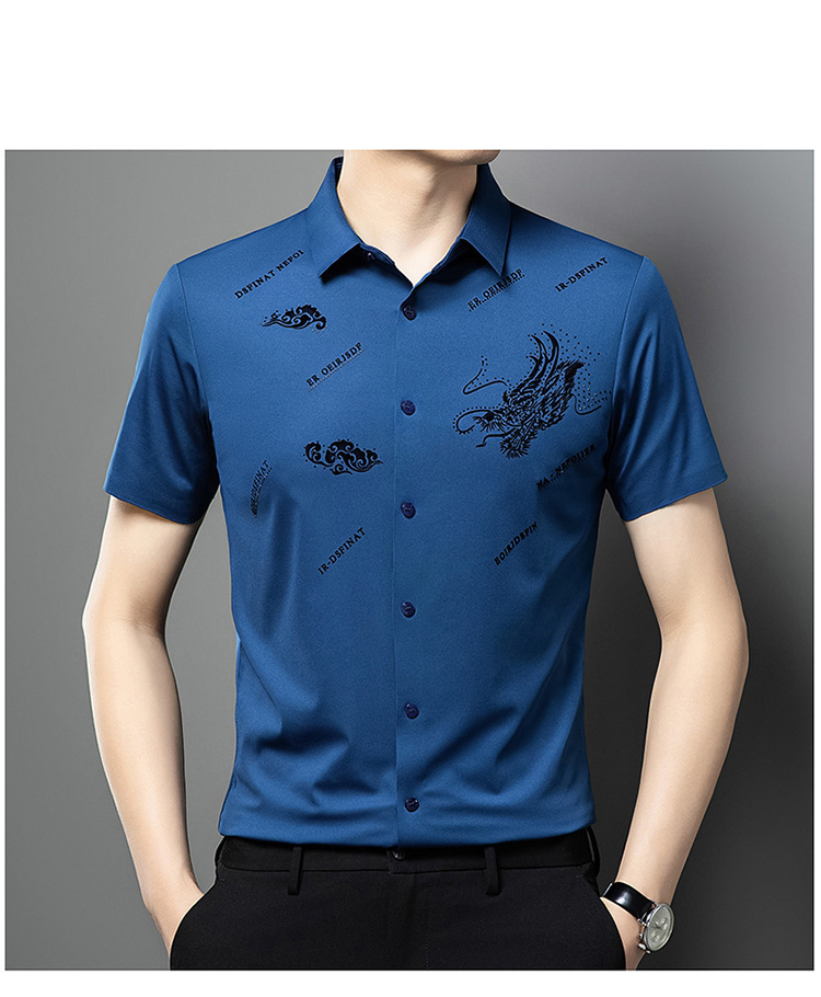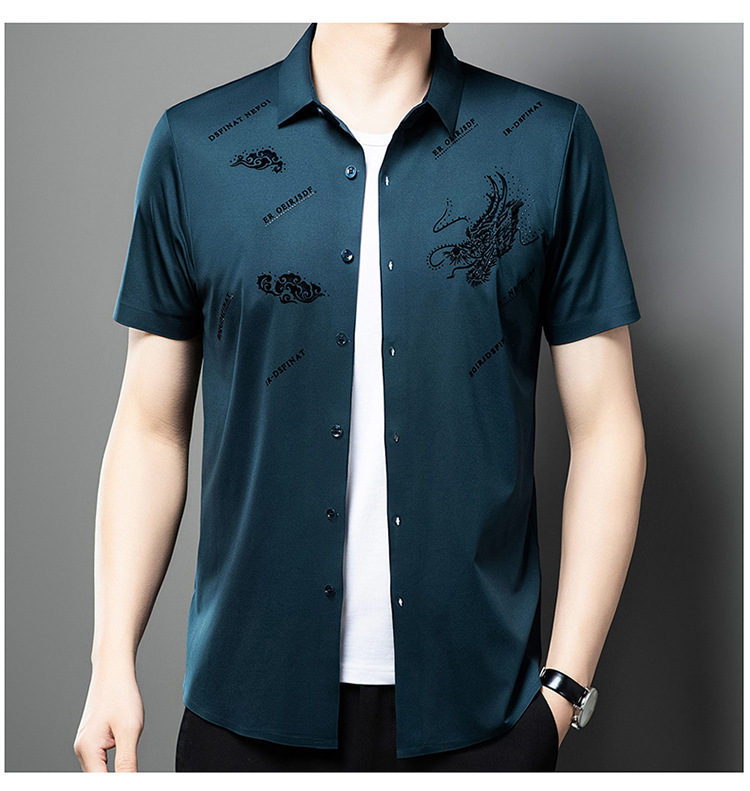 夏季新款男式短袖无痕衬衫休闲男装上衣时尚印花免烫薄款衬衣