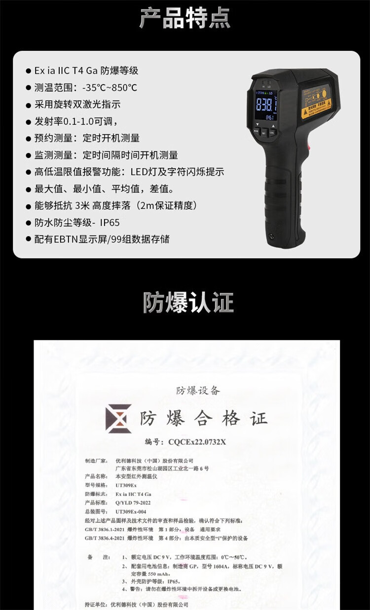 UNI-T Youlide UT309Ex 산업 방폭 온도 측정 총 고정밀 적외선 온도계 전자 온도계