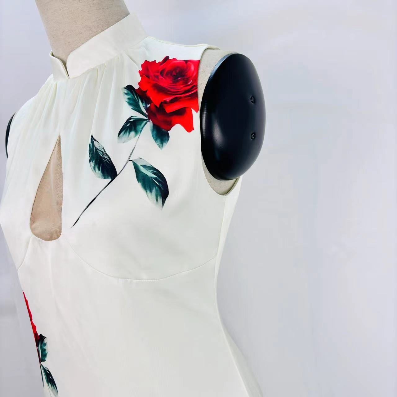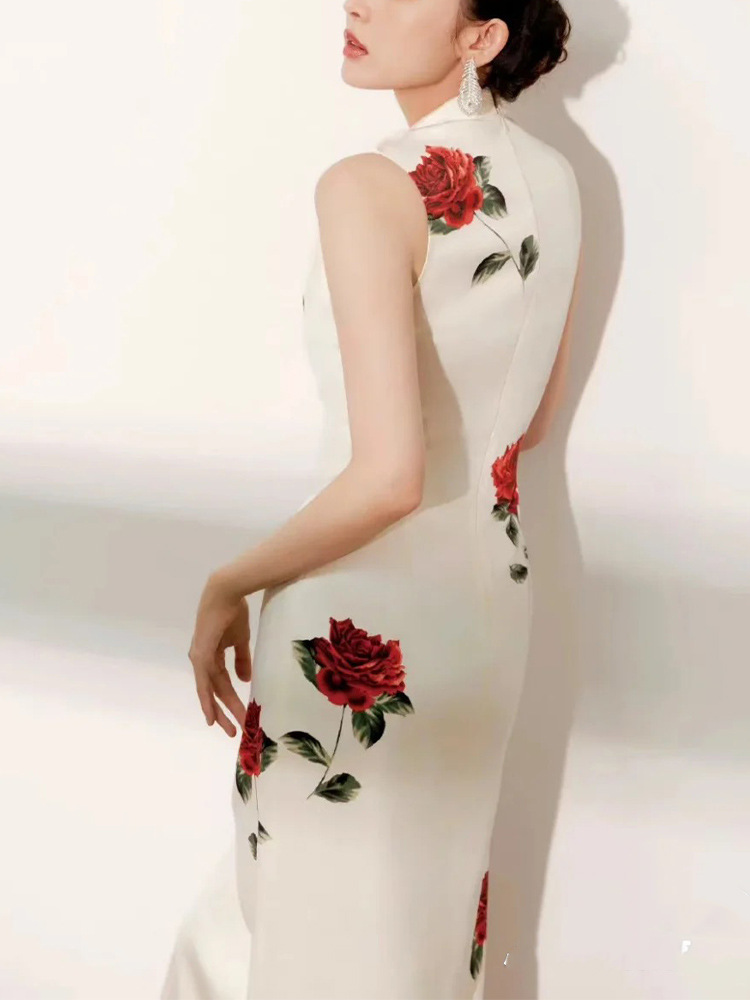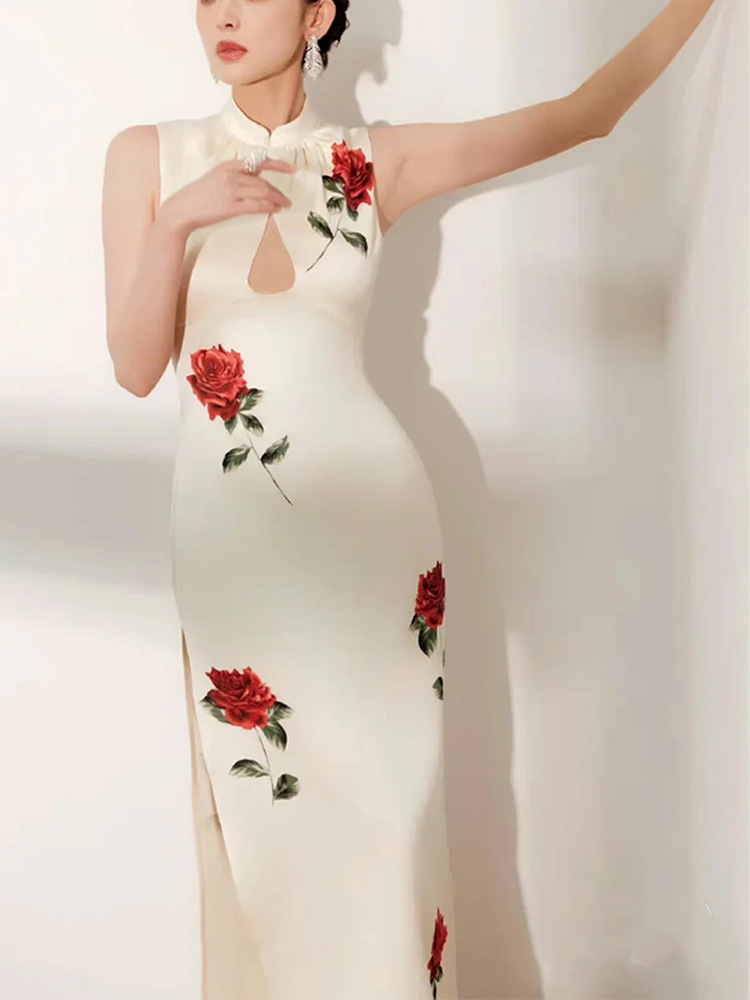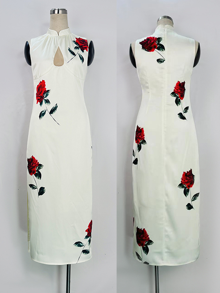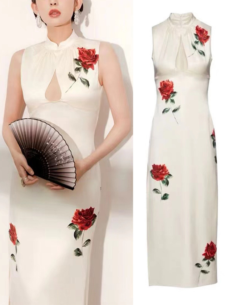 Liu Yifei Guli Naza 같은 스타일 새로운 중국 흰색 중공 분할 수정 청삼 인쇄 민소매 원피스 여름