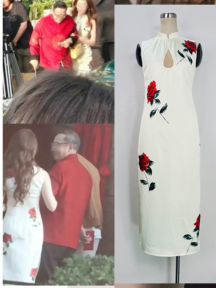 Liu Yifei Guli Naza 같은 스타일 새로운 중국 흰색 중공 분할 수정 청삼 인쇄 민소매 원피스 여름스토어 가기