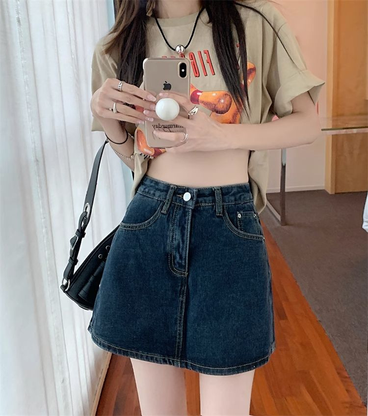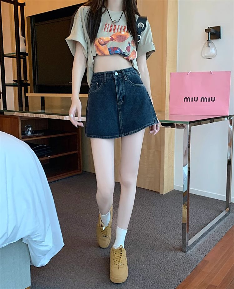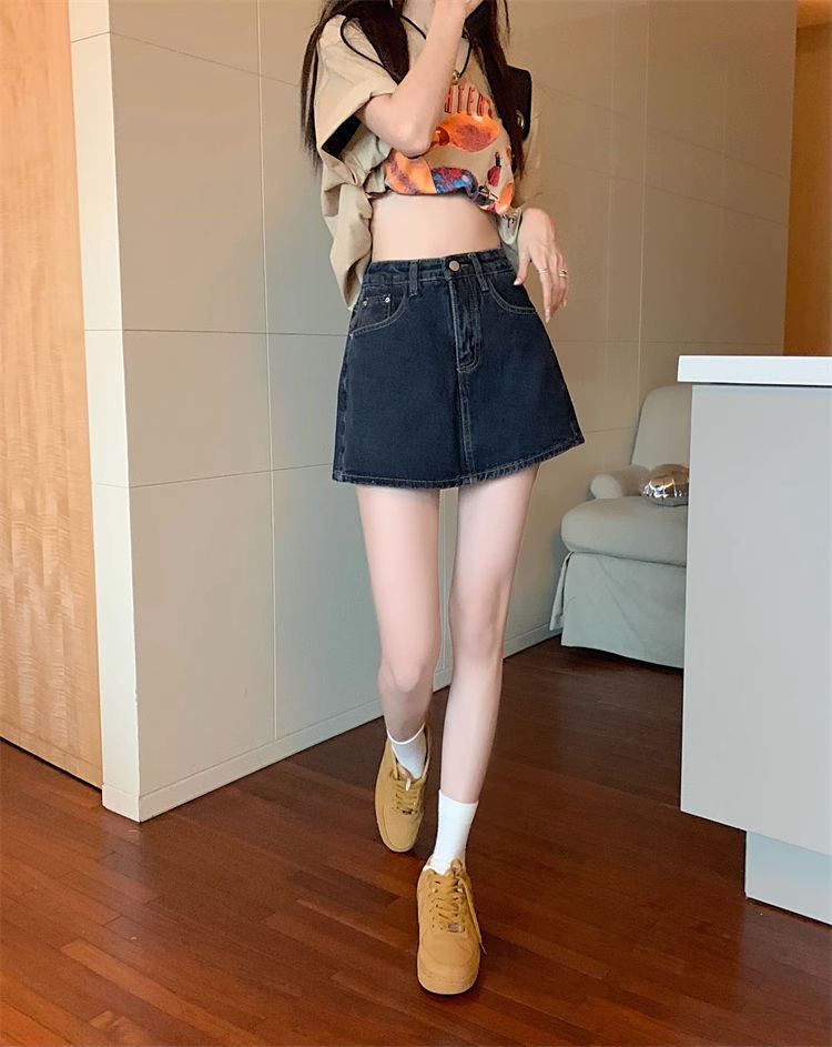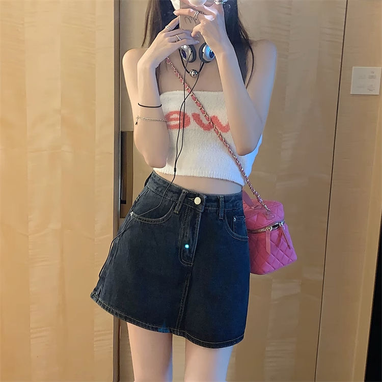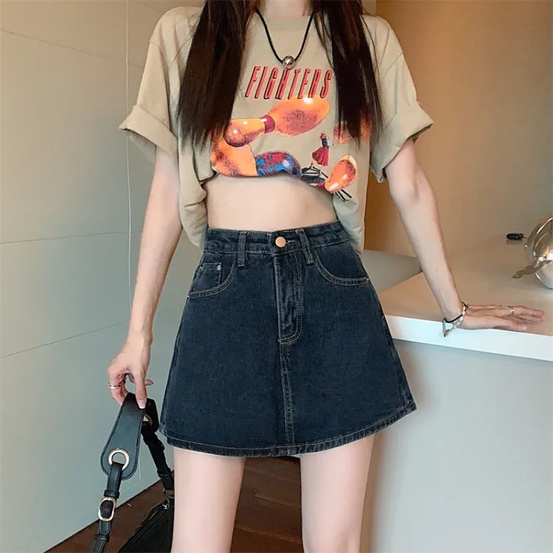 2024 년 여름 다크 블루 작은 치마 여자 새로운 높은 허리 슬리밍 A 라인 엉덩이 올스타 데님 스커트스토어 가기