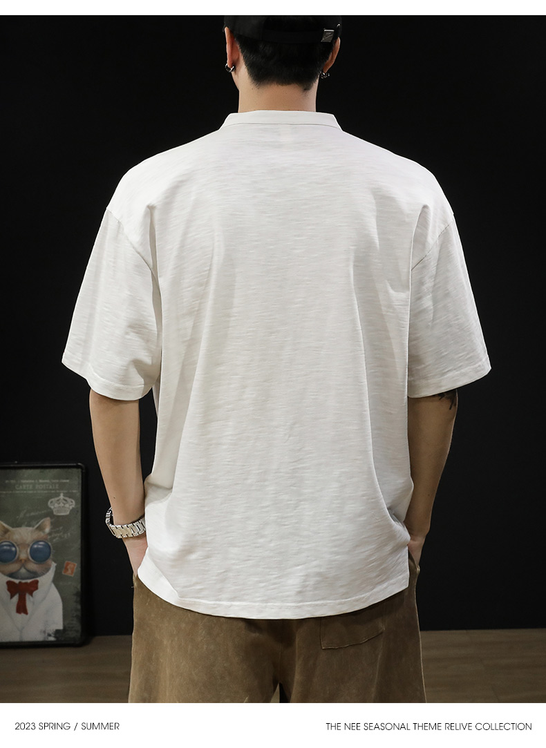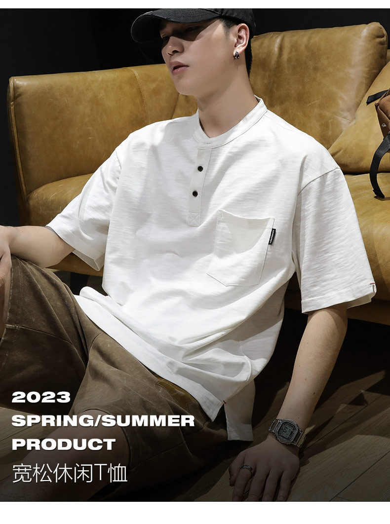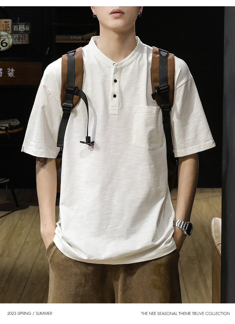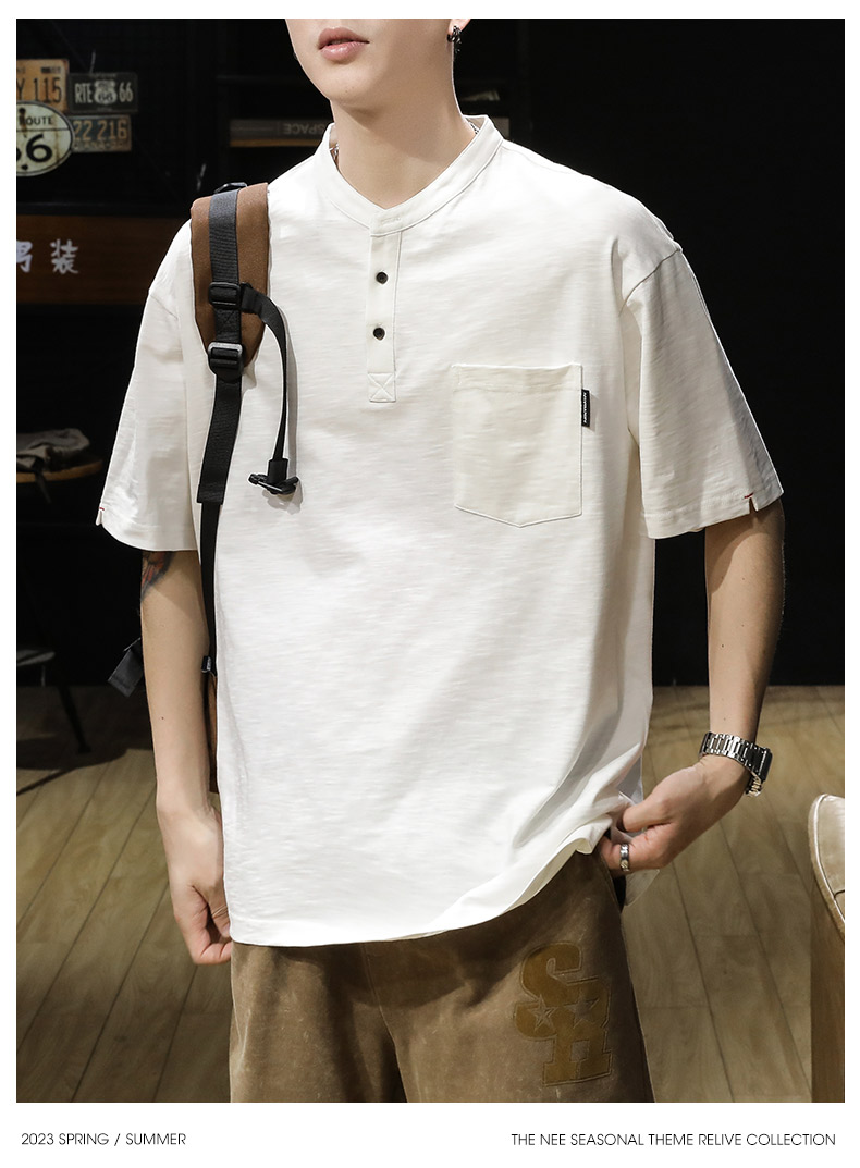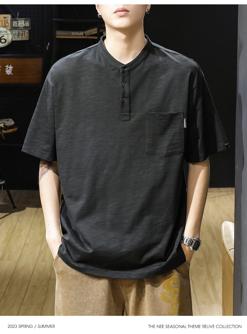 아메리칸 스타일 클래식 레트로 반팔 폴로 셔츠 남자 여름 슬럽 코튼 루즈 헨리 칼라 아미 카키 툴링 티셔츠