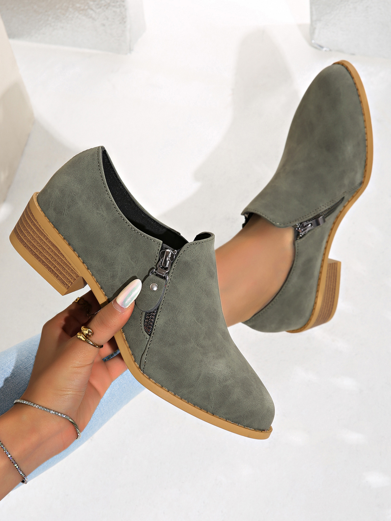 국경 간 대외 무역 플러스 사이즈 두꺼운 뒤꿈치 얇고 벌거 벗은 부츠 여성 영국 스타일의 단색 뾰족한 측면 지퍼 낮은 뒤꿈치 신발 도매스토어 가기