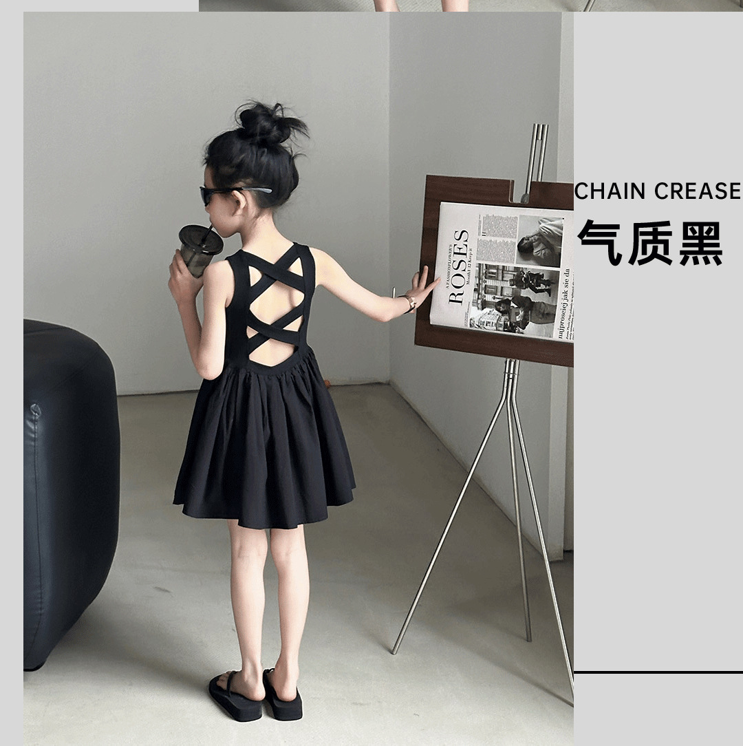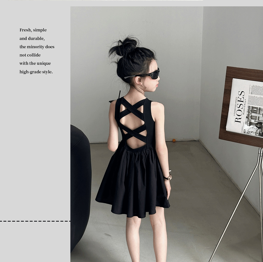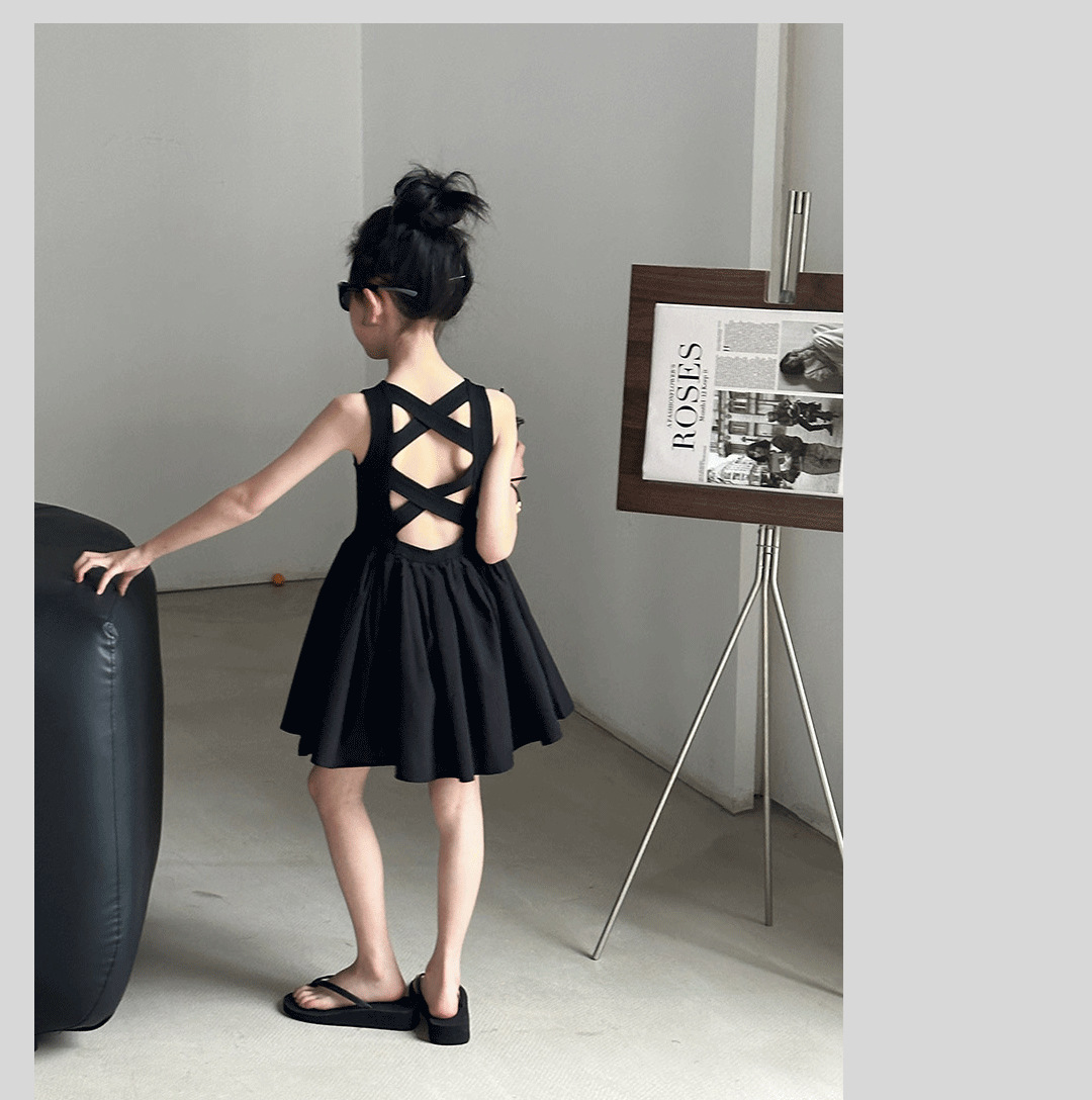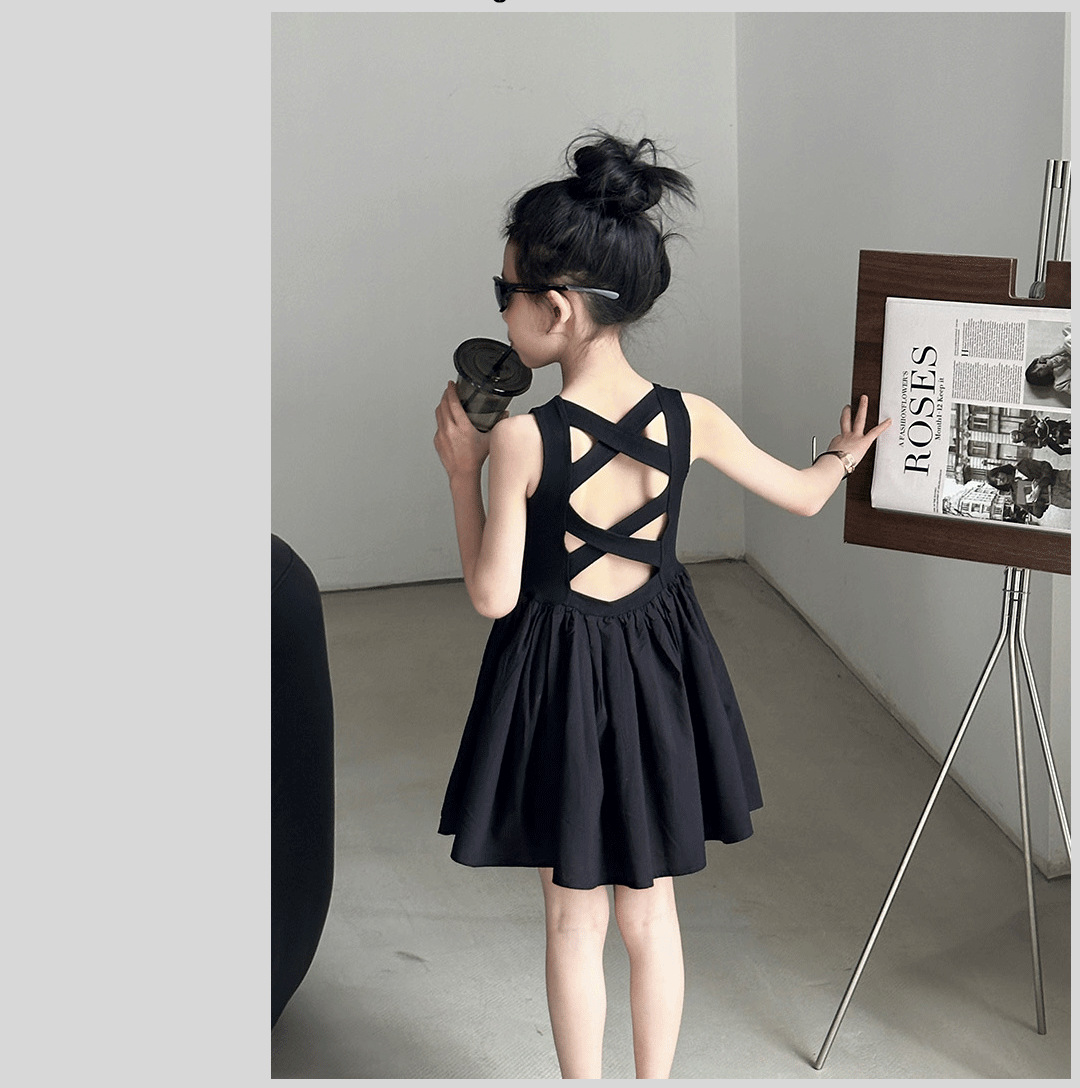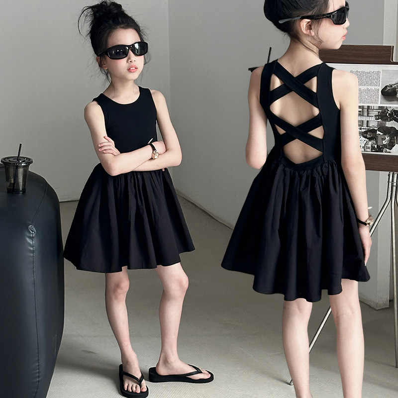 소녀 원피스 여름 2024 새로운 한국 스타일 중대형 키즈 헵번 블랙 스커트 슬립 백 할로우 디자인 트렌디스토어 가기
