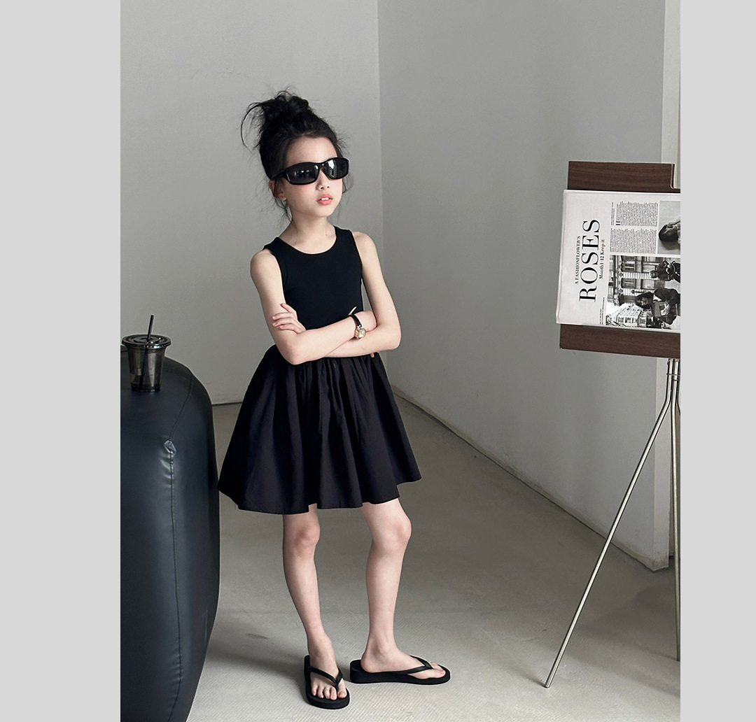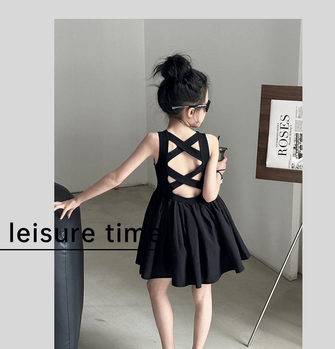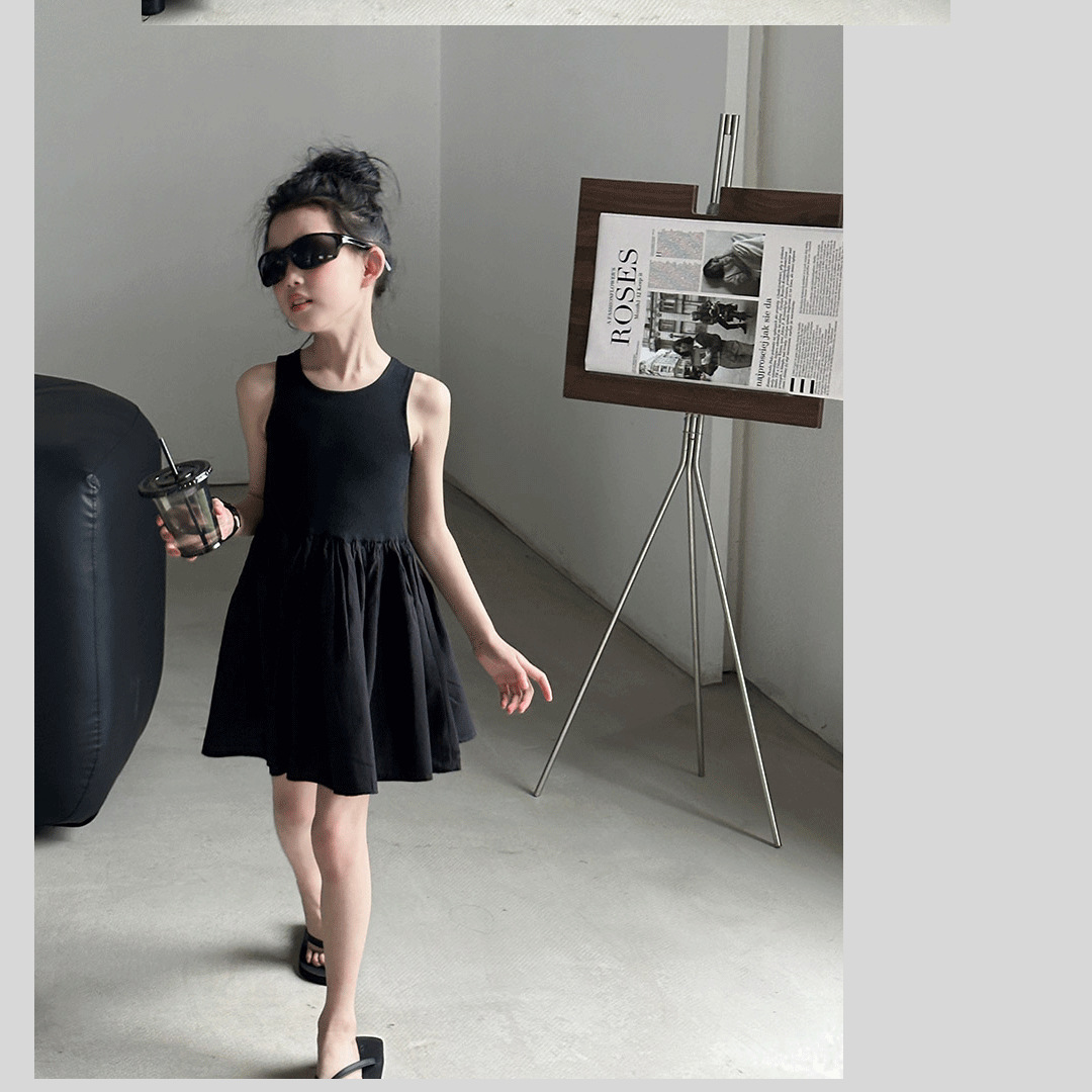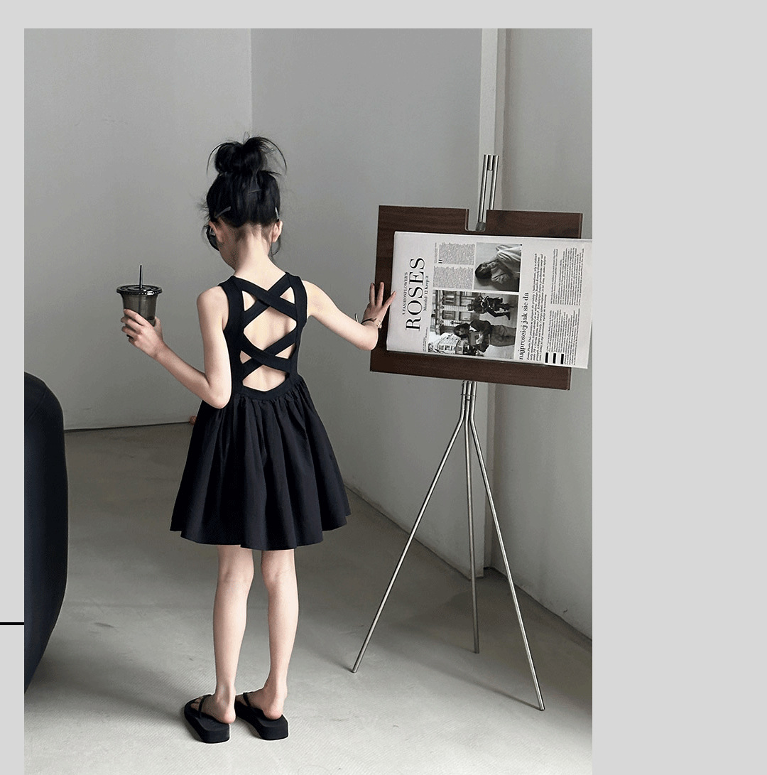 소녀 원피스 여름 2024 새로운 한국 스타일 중대형 키즈 헵번 블랙 스커트 슬립 백 할로우 디자인 트렌디스토어 가기