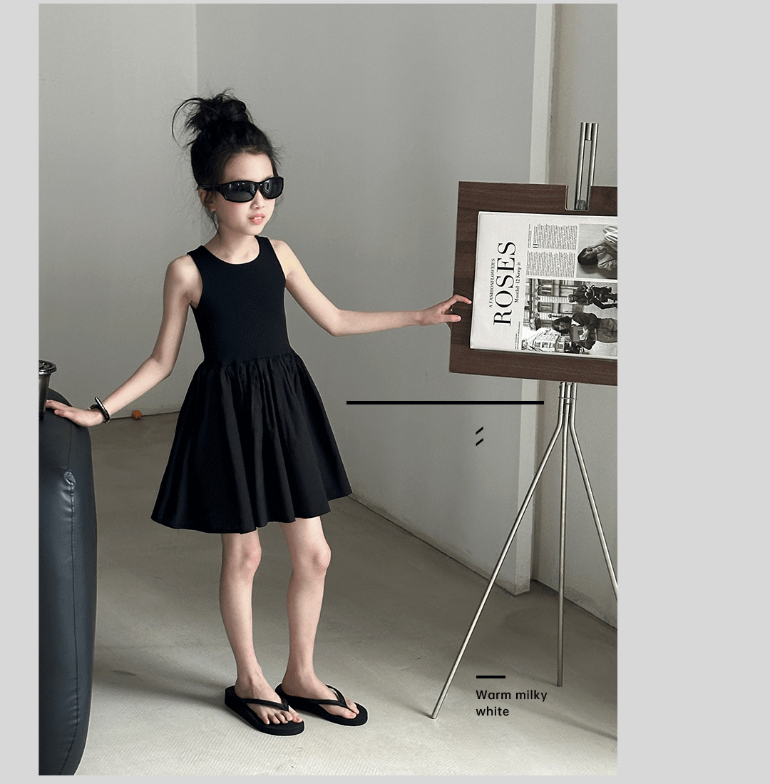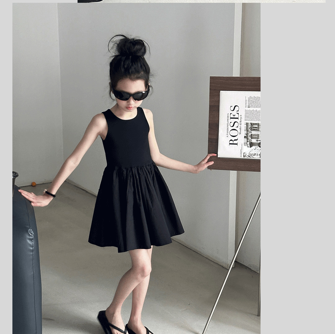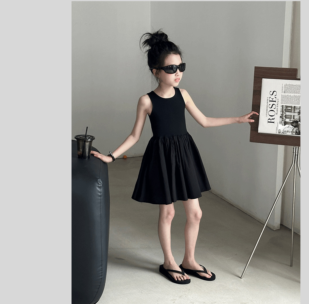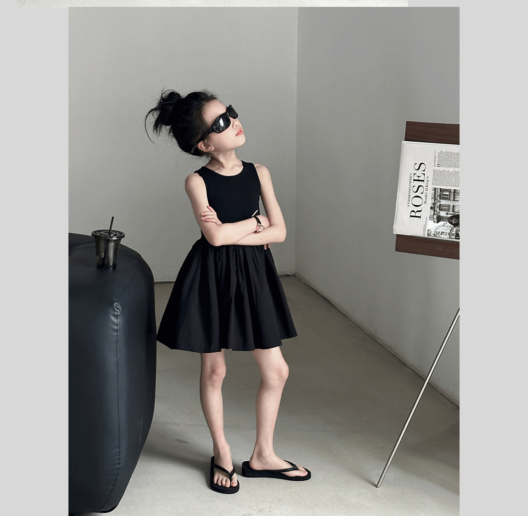 소녀 원피스 여름 2024 새로운 한국 스타일 중대형 키즈 헵번 블랙 스커트 슬립 백 할로우 디자인 트렌디스토어 가기