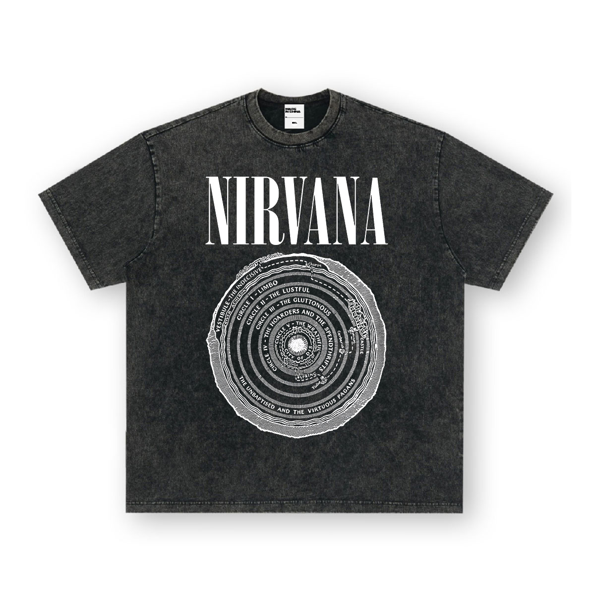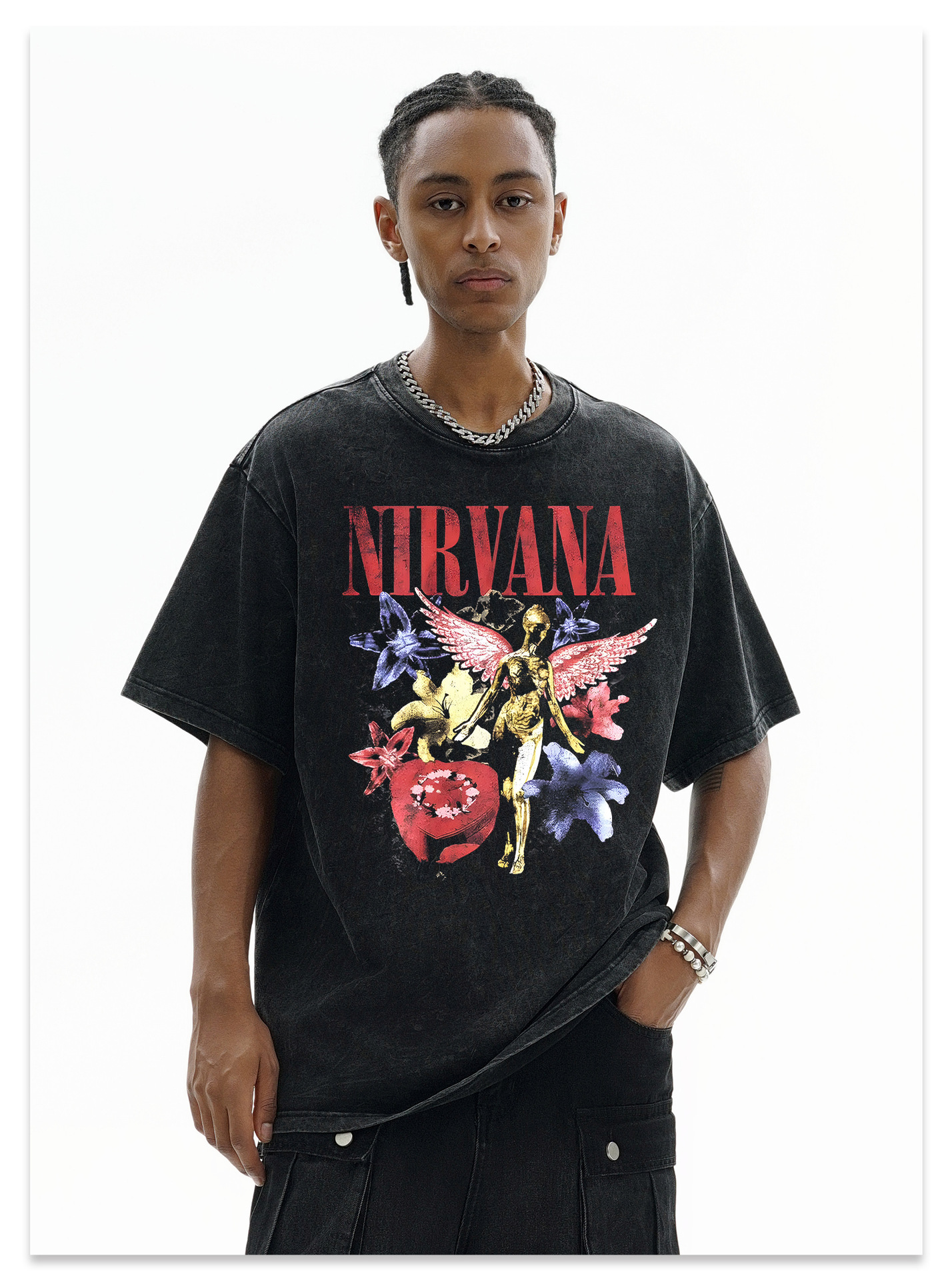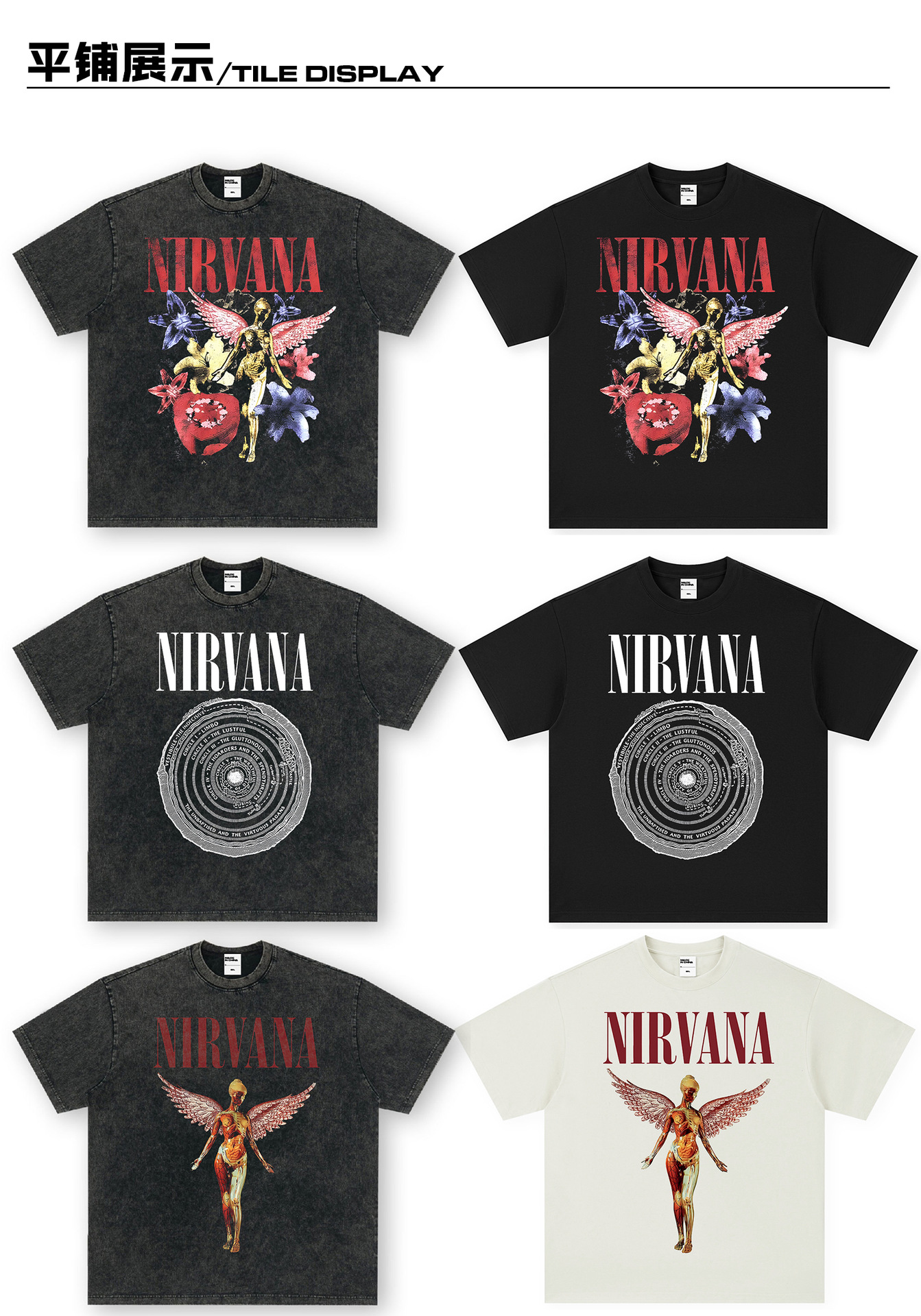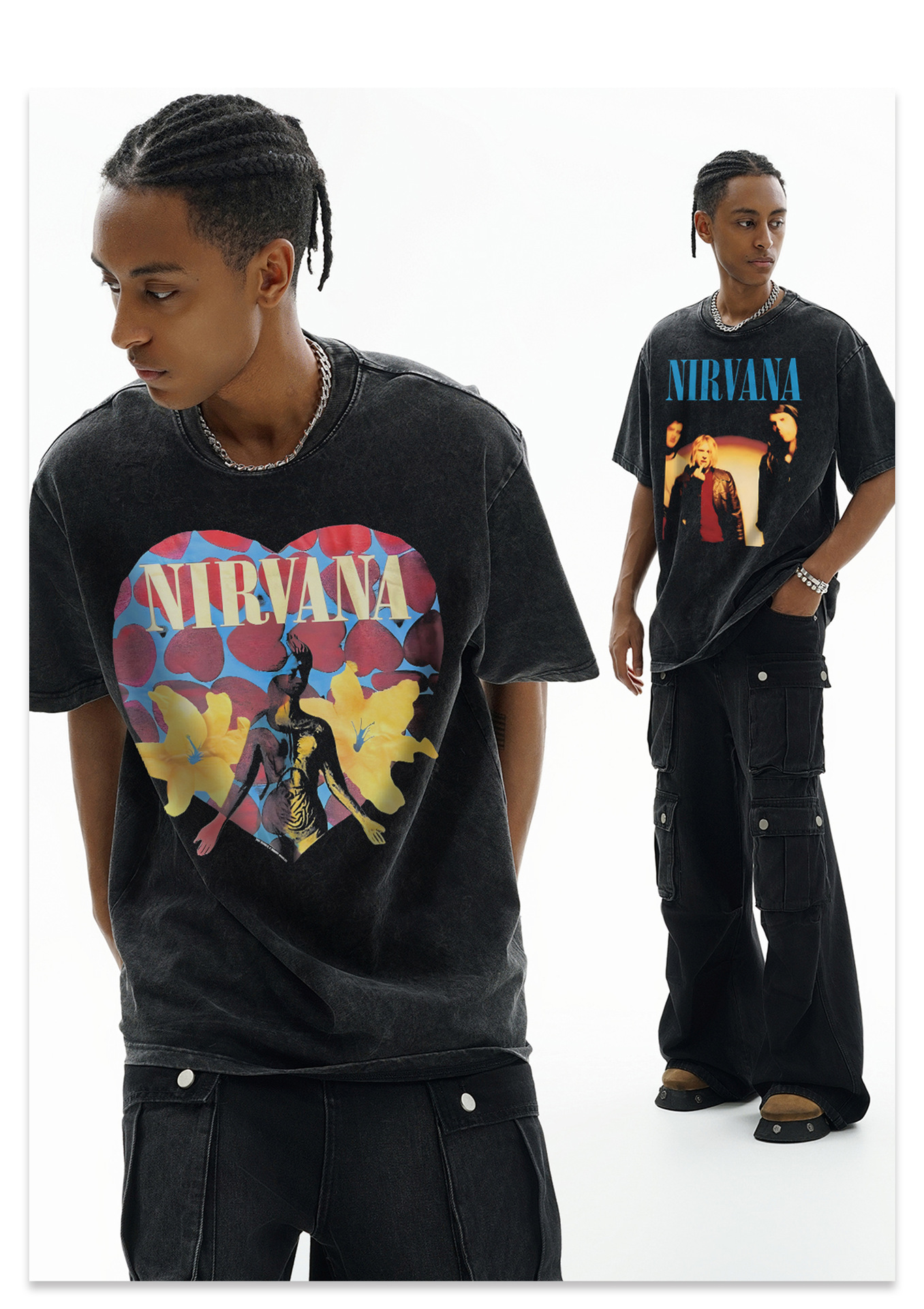 NIRVANA 락 아메리칸 레트로 반팔 티셔츠 워싱 헤비 크로스 보더 프린트 아메리칸 트렌디 퓨어 코튼 빈티지 남성스토어 가기