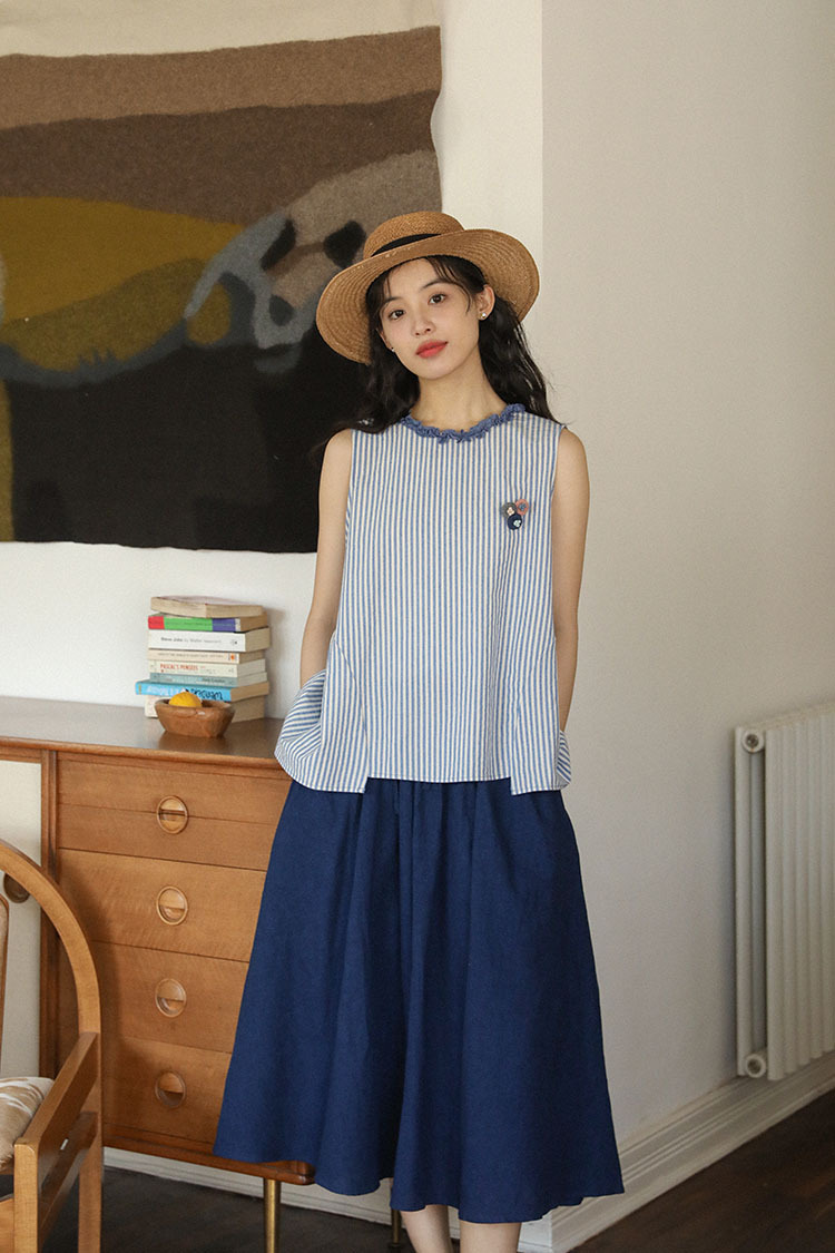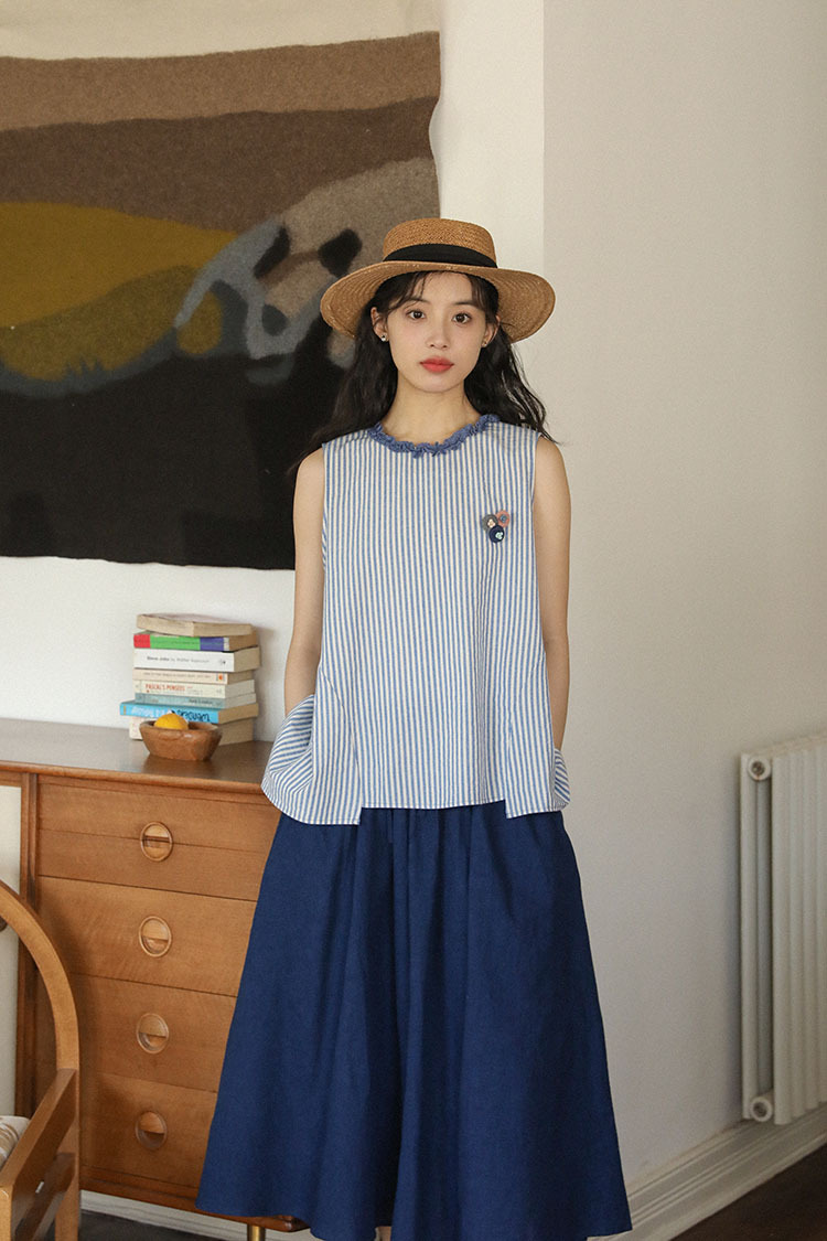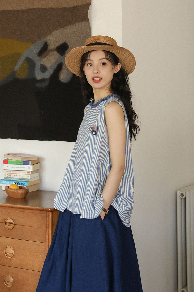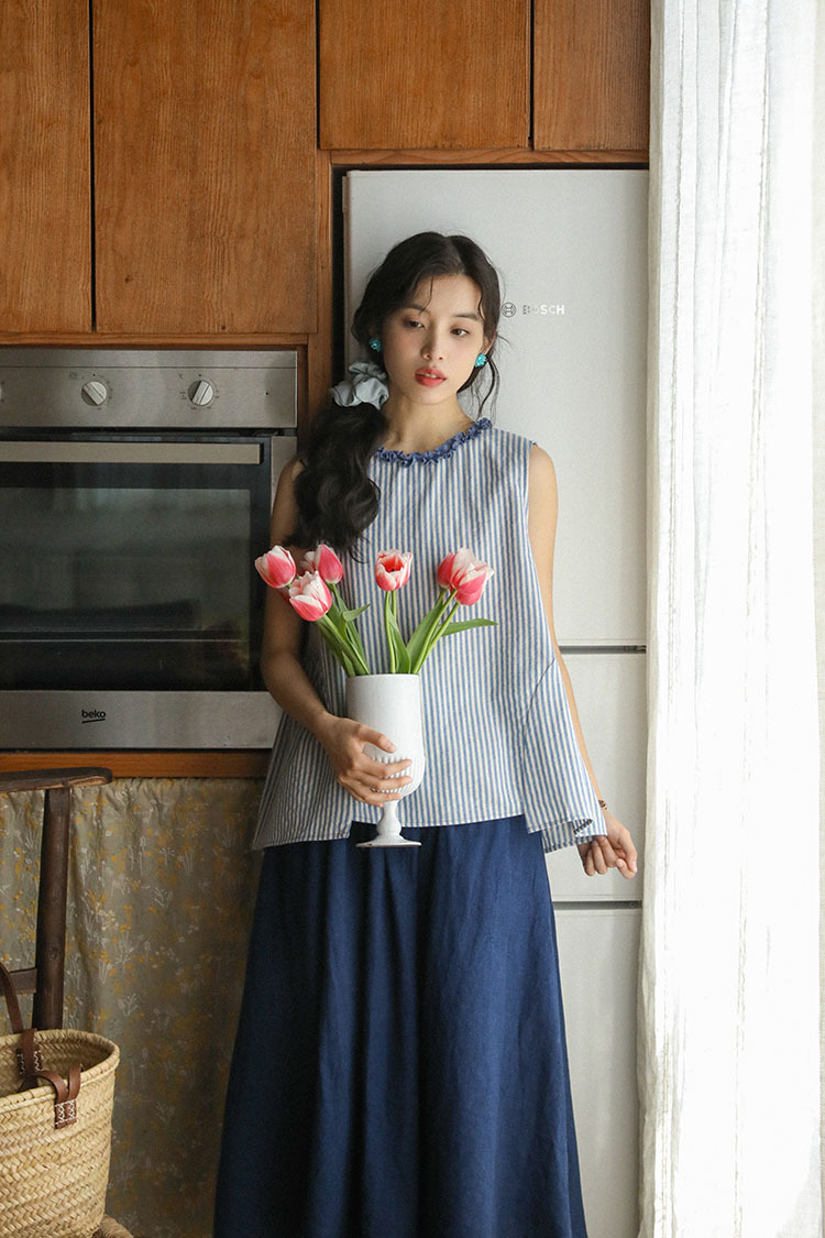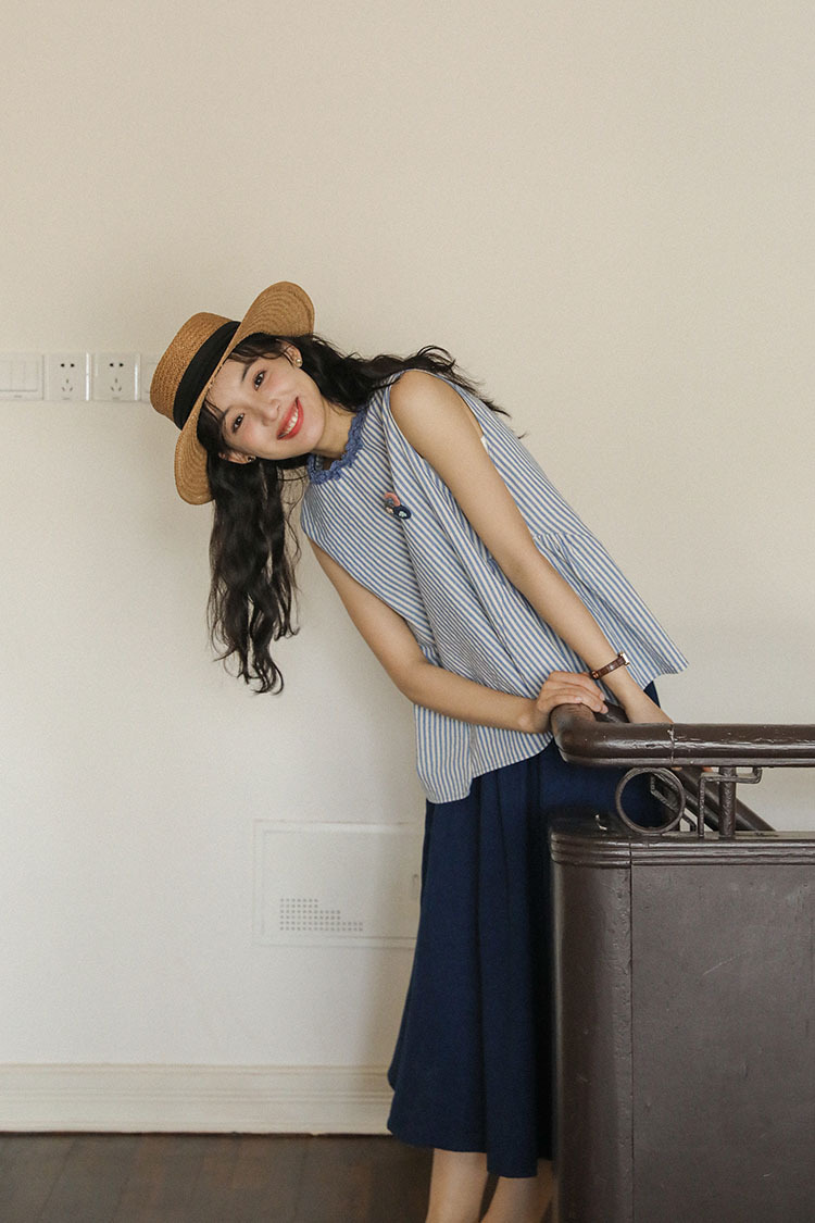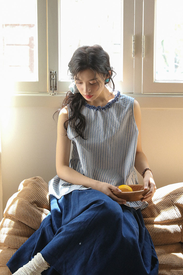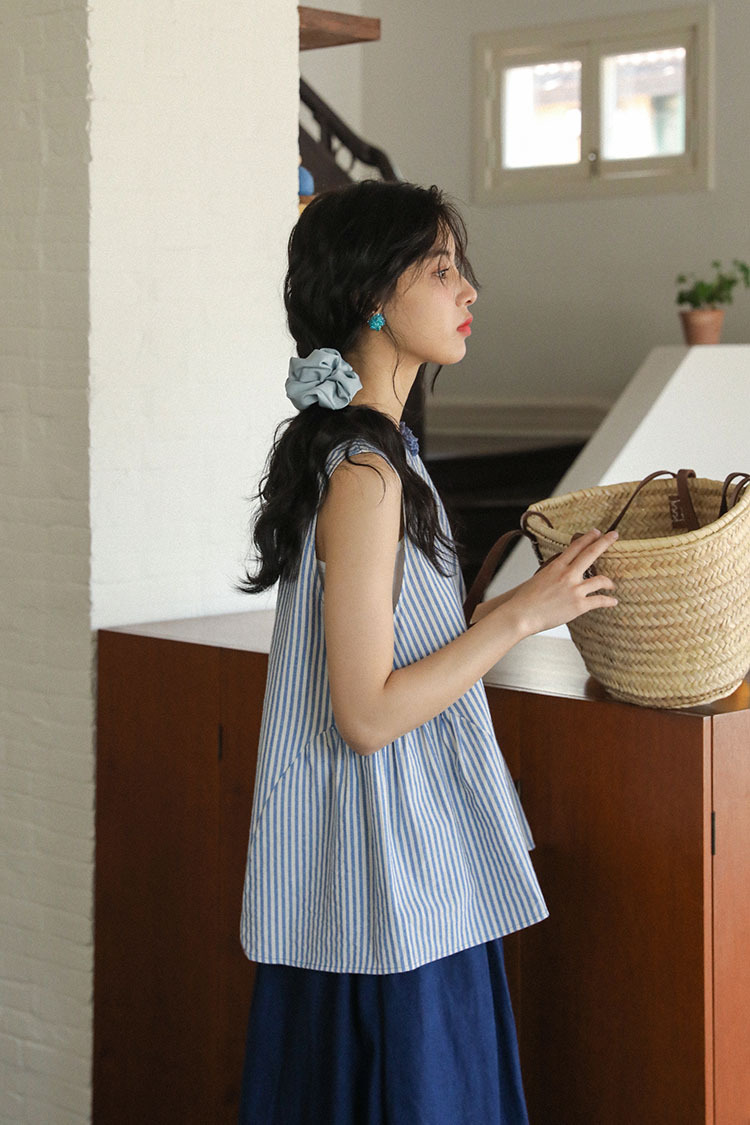 2024 년 여름 여성을위한 새로운 예술적 줄무늬 등 버튼 디자인 감각 풀오버 귀 가장자리 둥근 목 민소매 셔츠