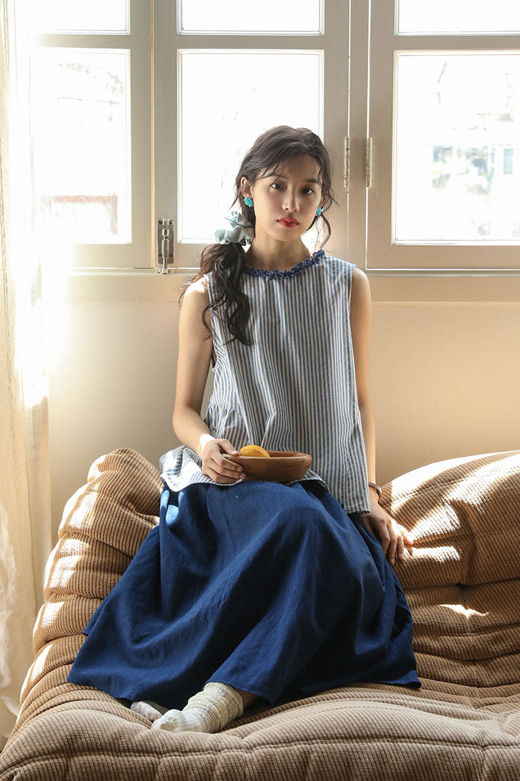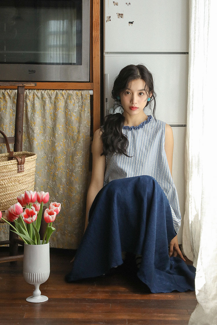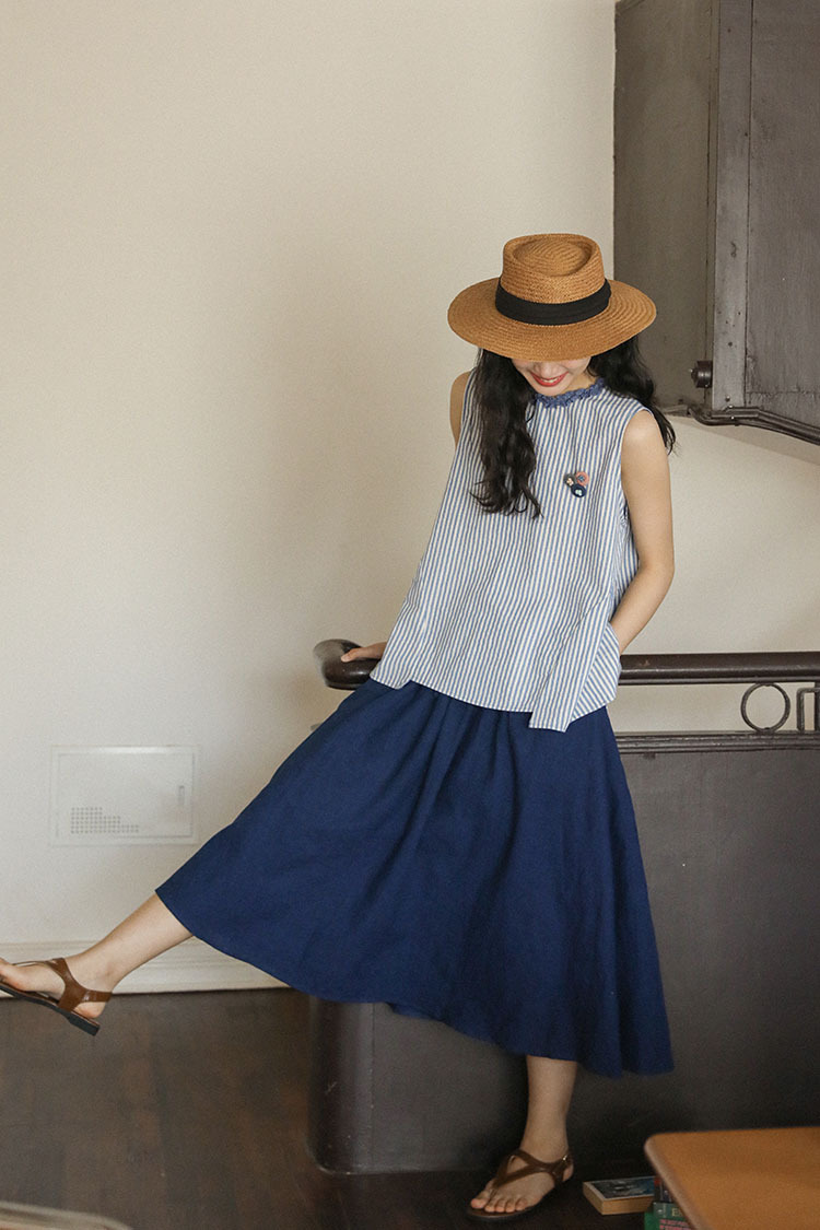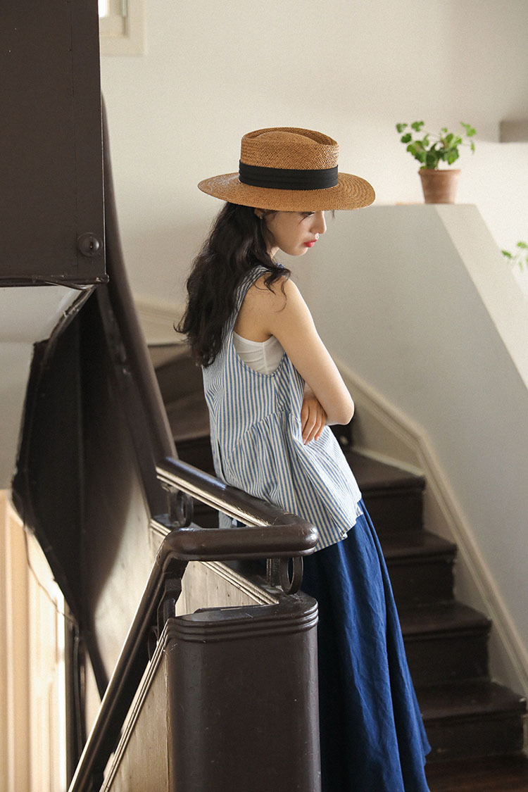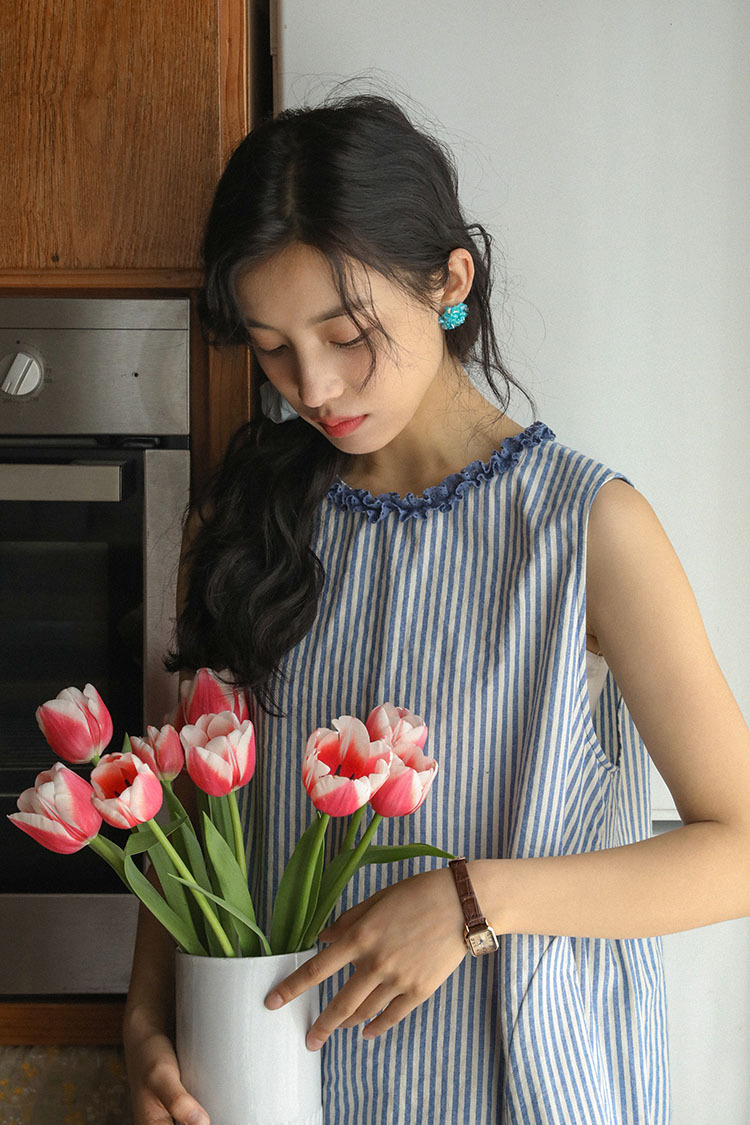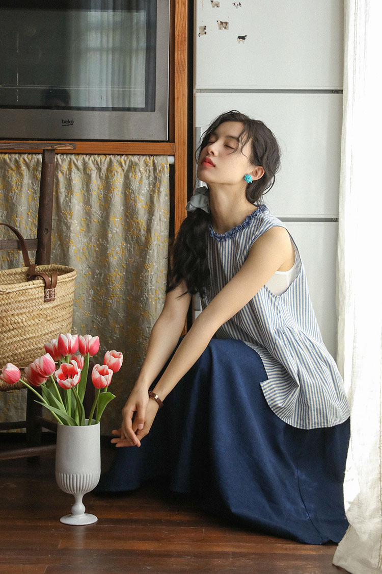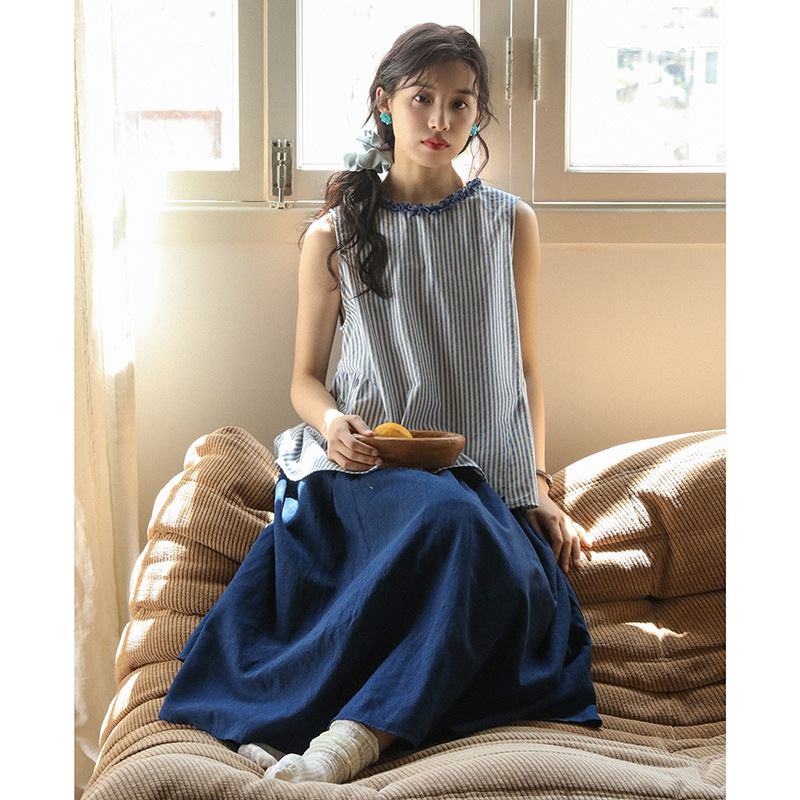 2024 년 여름 여성을위한 새로운 예술적 줄무늬 등 버튼 디자인 감각 풀오버 귀 가장자리 둥근 목 민소매 셔츠