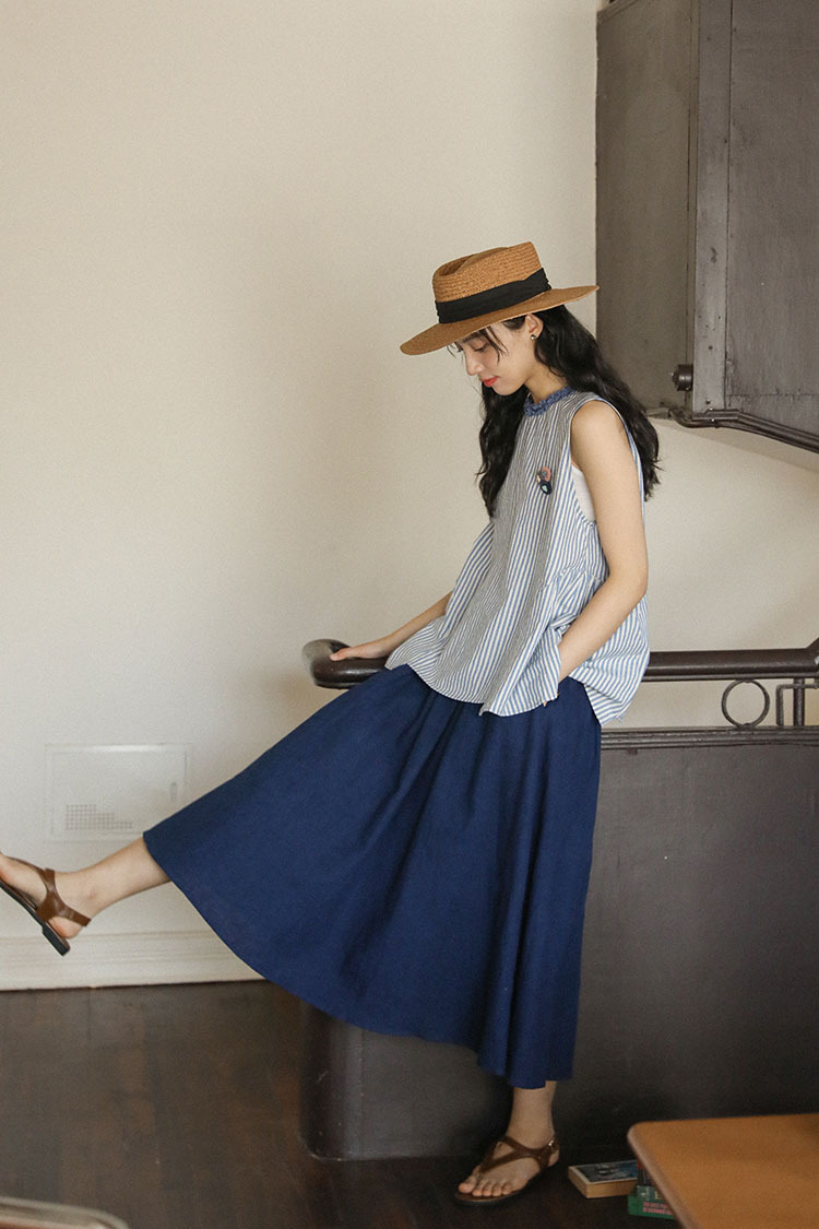 2024 년 여름 여성을위한 새로운 예술적 줄무늬 등 버튼 디자인 감각 풀오버 귀 가장자리 둥근 목 민소매 셔츠스토어 가기