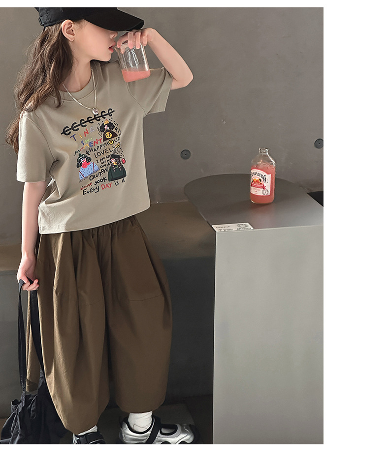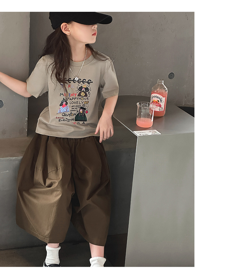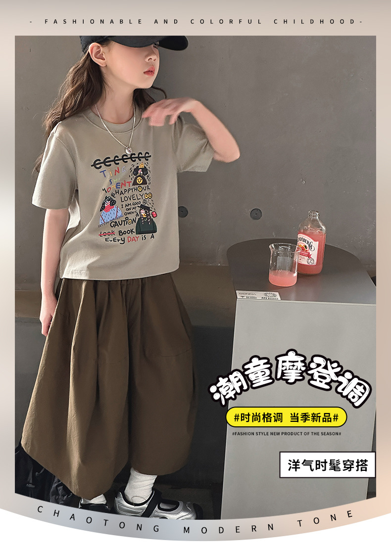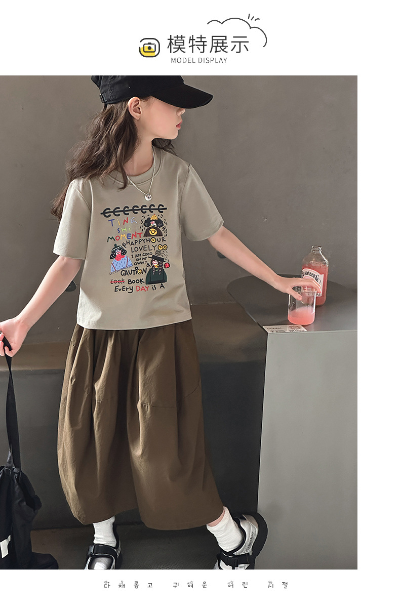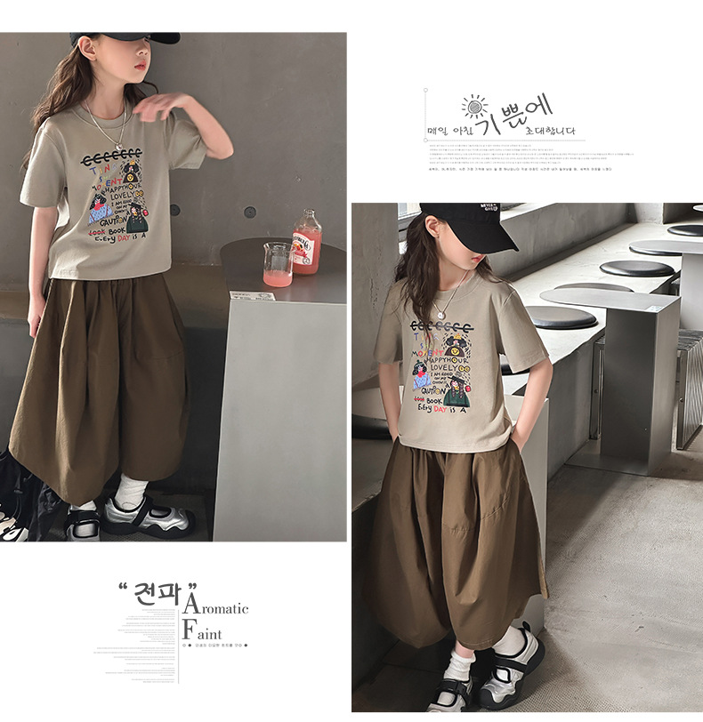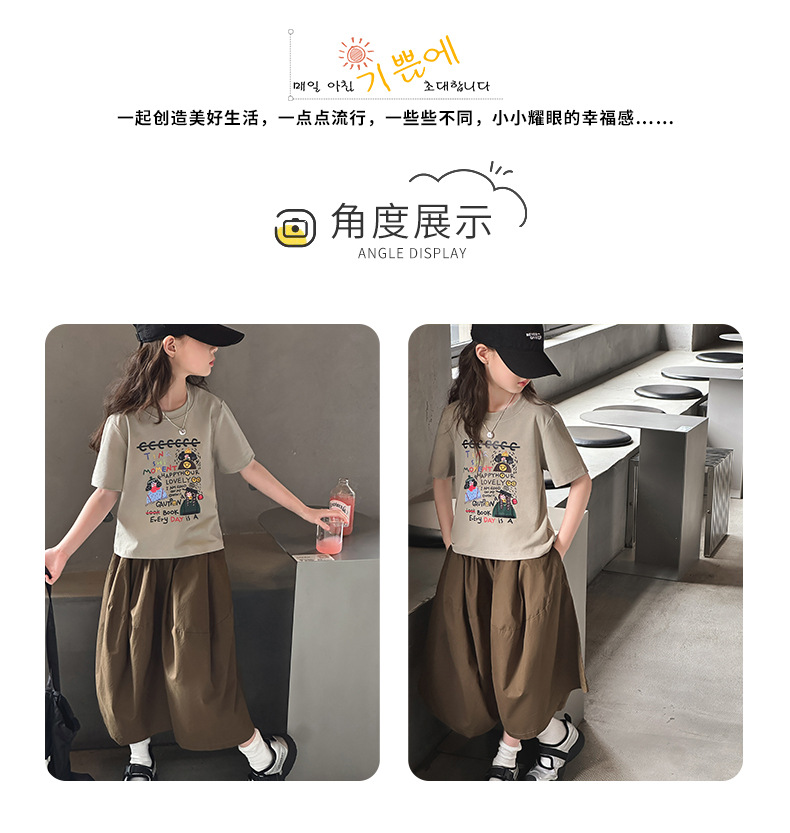 여자 여름 세트 2024 새로운 어린이 유행 서양식 여름 원피스 어린이 반팔 티셔츠 와이드 레그 바지 투피스 세트스토어 가기