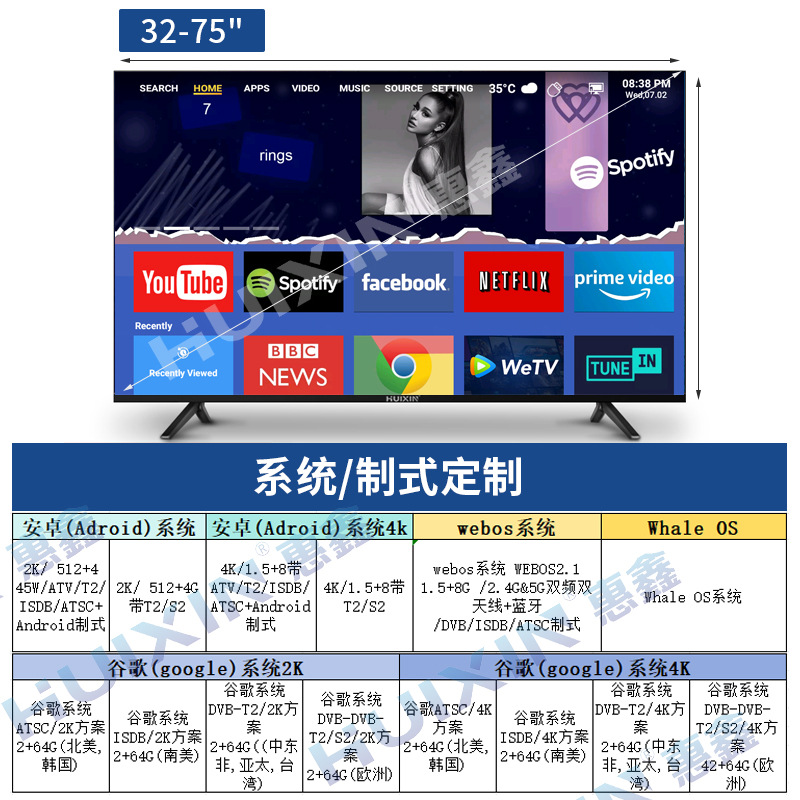 Hui Xin 스마트 TV 43/55/ 65inch 네트워크 TV 초박형 고화질 LCD 가정용 호텔 디스플레이 TV스토어 가기