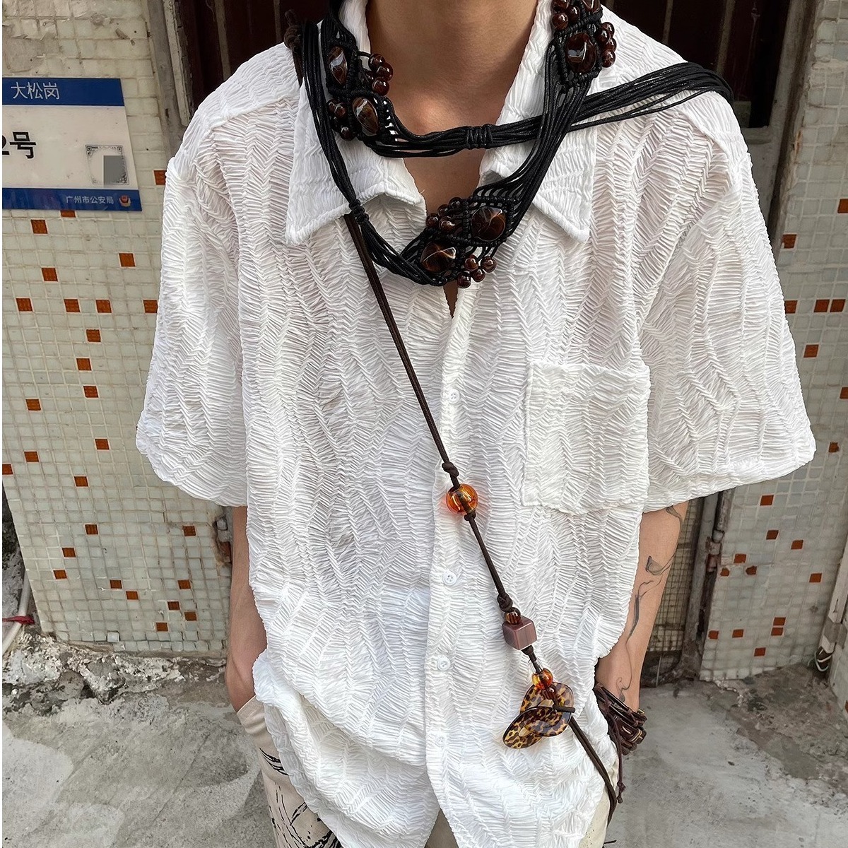 새로운 레트로 2024 틈새 하이 엔드 캐주얼 얇은 자카드 디자인 더피 잘 생긴 남성과 여성 통근 반팔 셔츠