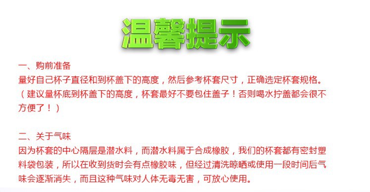 一:关于味道r因为杯套的中心隔层是潜水料,而潜水料属于合成橡胶,我们的杯套都有密封塑料袋包装,所以在收到货时会有点橡胶味,但经过清洗晾晒或使用一段时间后气味会逐渐消失,而且这种气味对人体无毒无害,可放心使用。(完美主义者慎拍)r二:关于杯套底部的透气孔r杯套底部的透气孔是为了套入杯子或者取出杯子有空气流通更加方便取存而留,并不是瑕疵或者残次品。r三:关于尺寸r量好自己杯子直径和到杯盖下的高度,然后参考杯套尺寸,正确选定杯套规格。(建议量杯底到杯盖下的高度,杯套最好不要包住盖子!否则喝水拧盖都会很不方便了!)。每款产品都是人工生产,所以不同批次杯套高度尺寸可能有所偏差,误差0.5CM~2CM内(完美主义者慎拍)四:关于颜色r产品图片都是实拍的,不同批次的颜色可能会有一点点差别(要求高的要和杯子颜色一模一样的慎拍)杯套颜色是选项图片里面的颜色 实物拍摄的,批次颜色不一样的这边会在详情页说明或者选项文字说明(完美主义者慎拍)