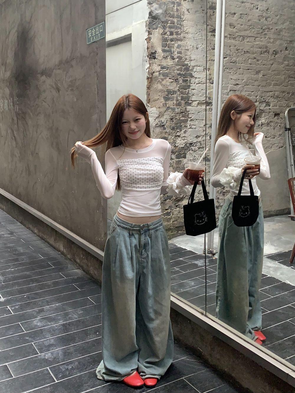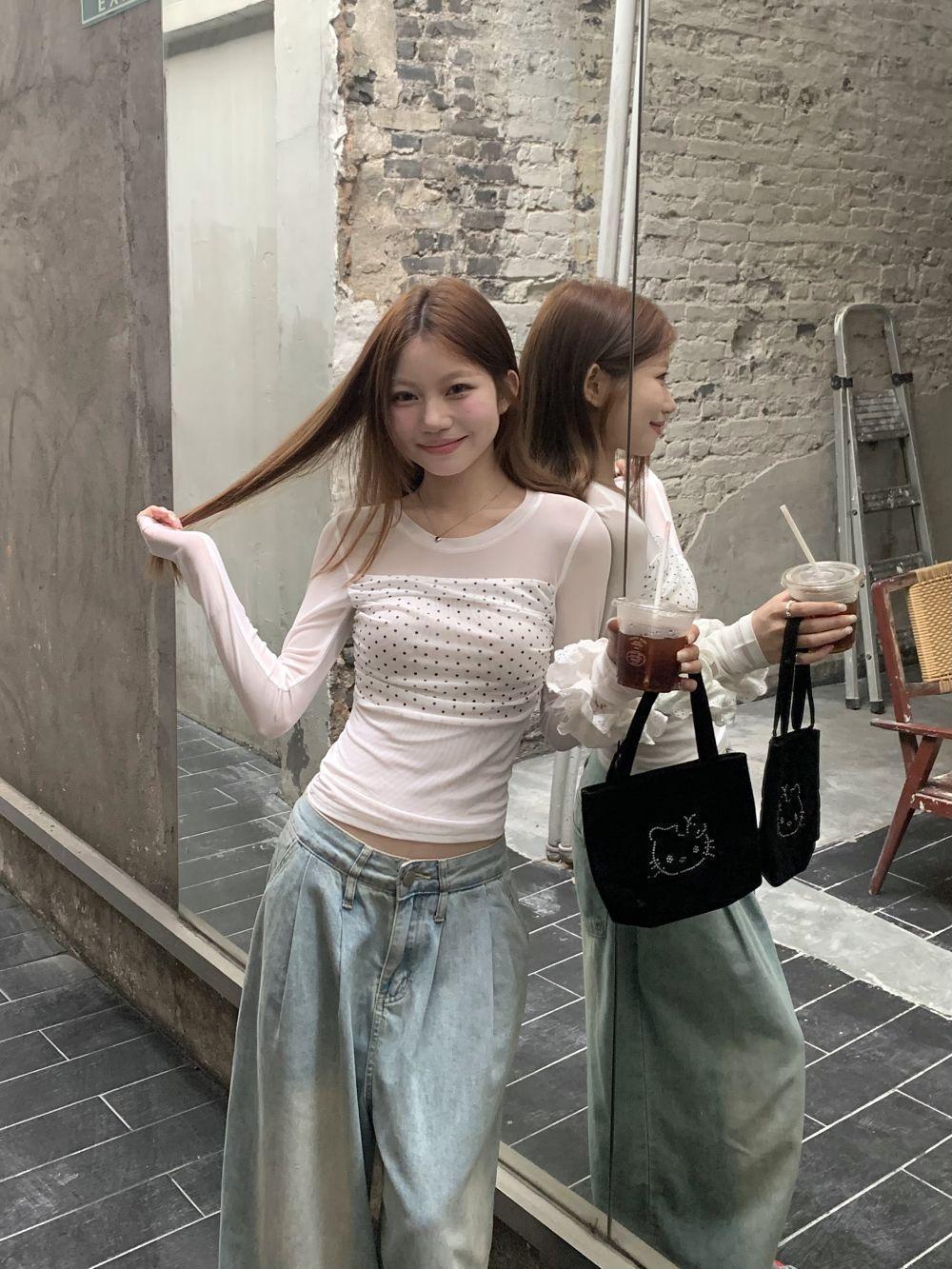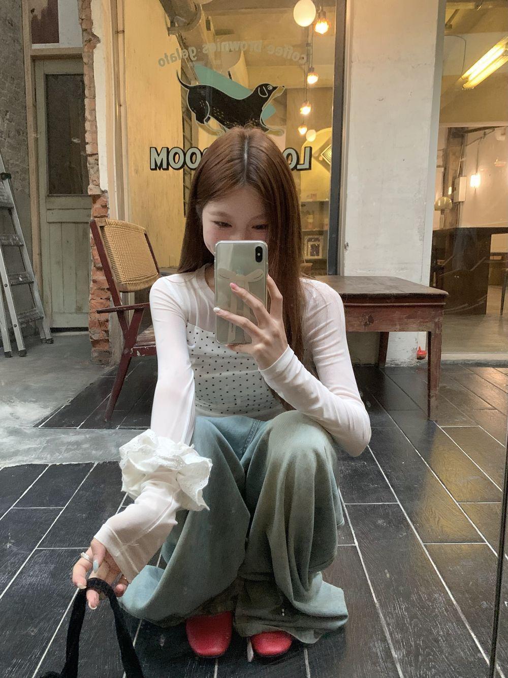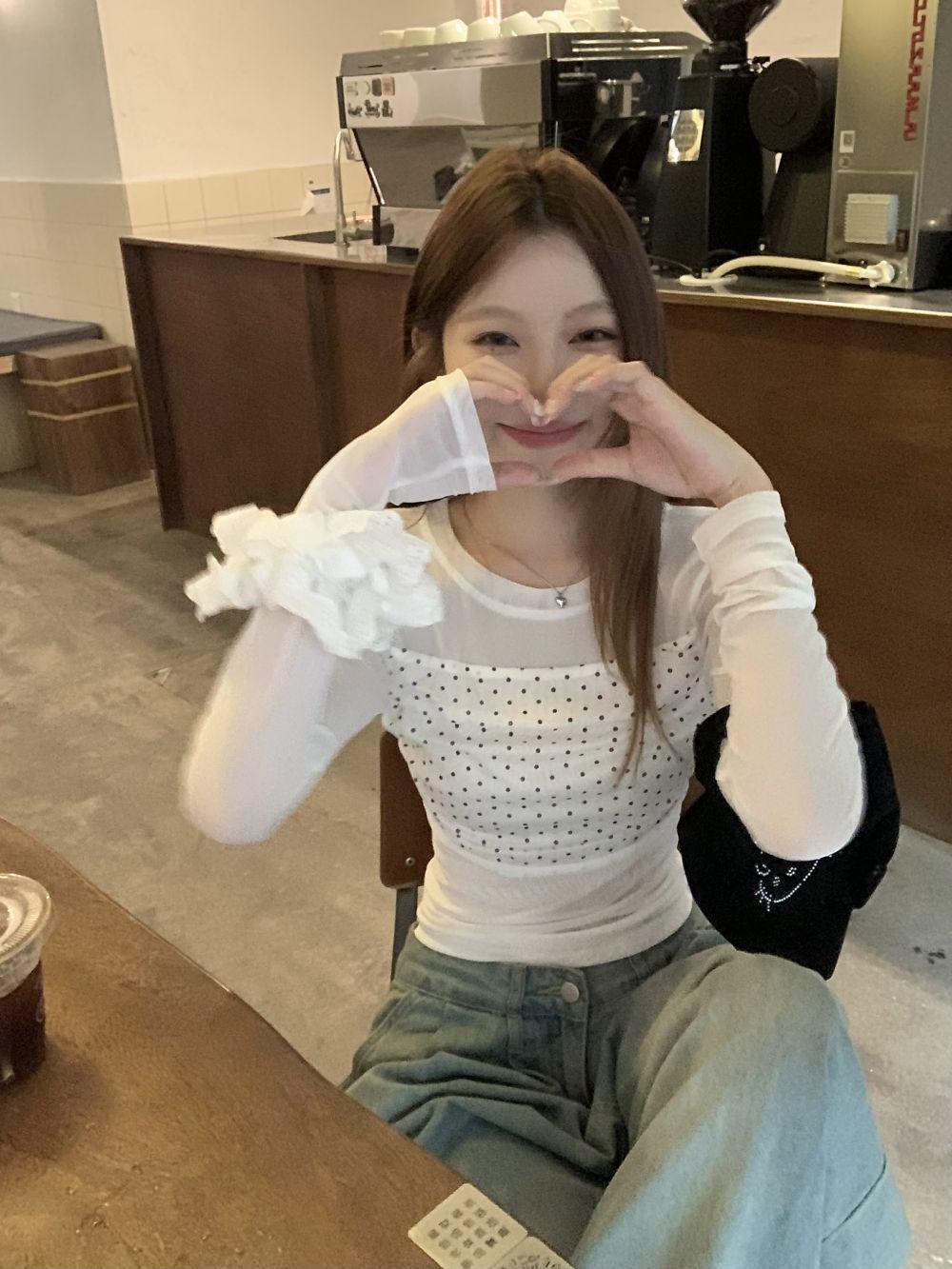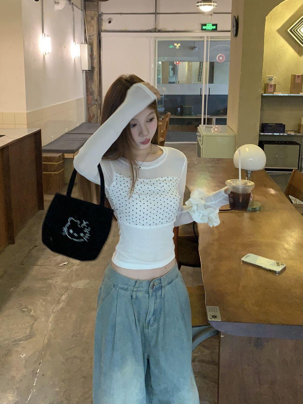 스파이스 걸스 화이트 폴로 도트 메쉬 긴팔 티셔츠 여성용 여름 디자인 센스 니쉬 슬림 핏 슬리밍 짧은 선 스크린 탑스토어 가기
