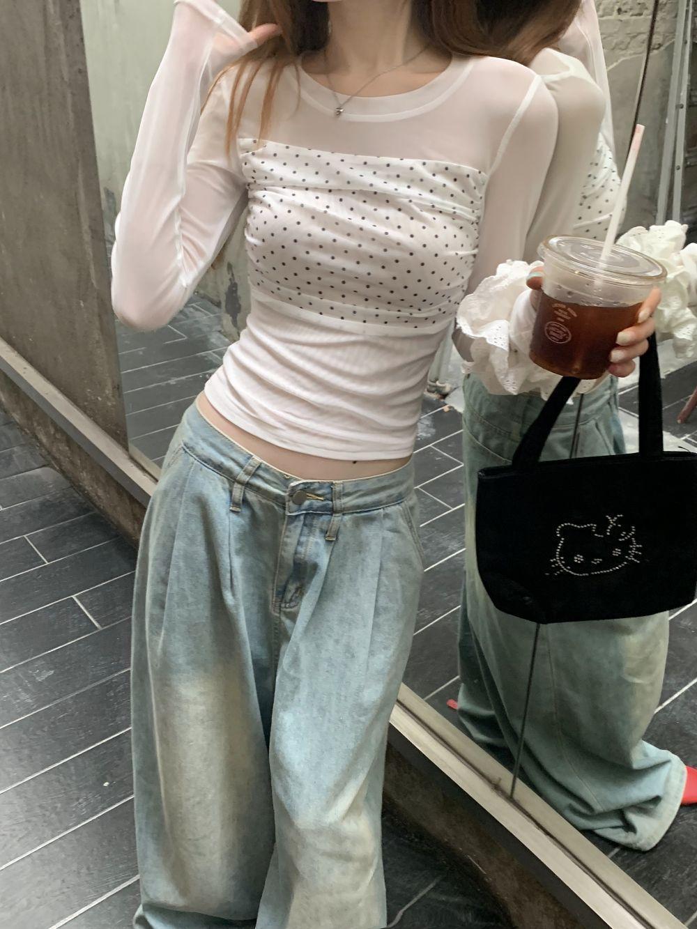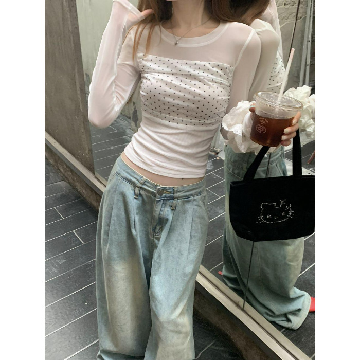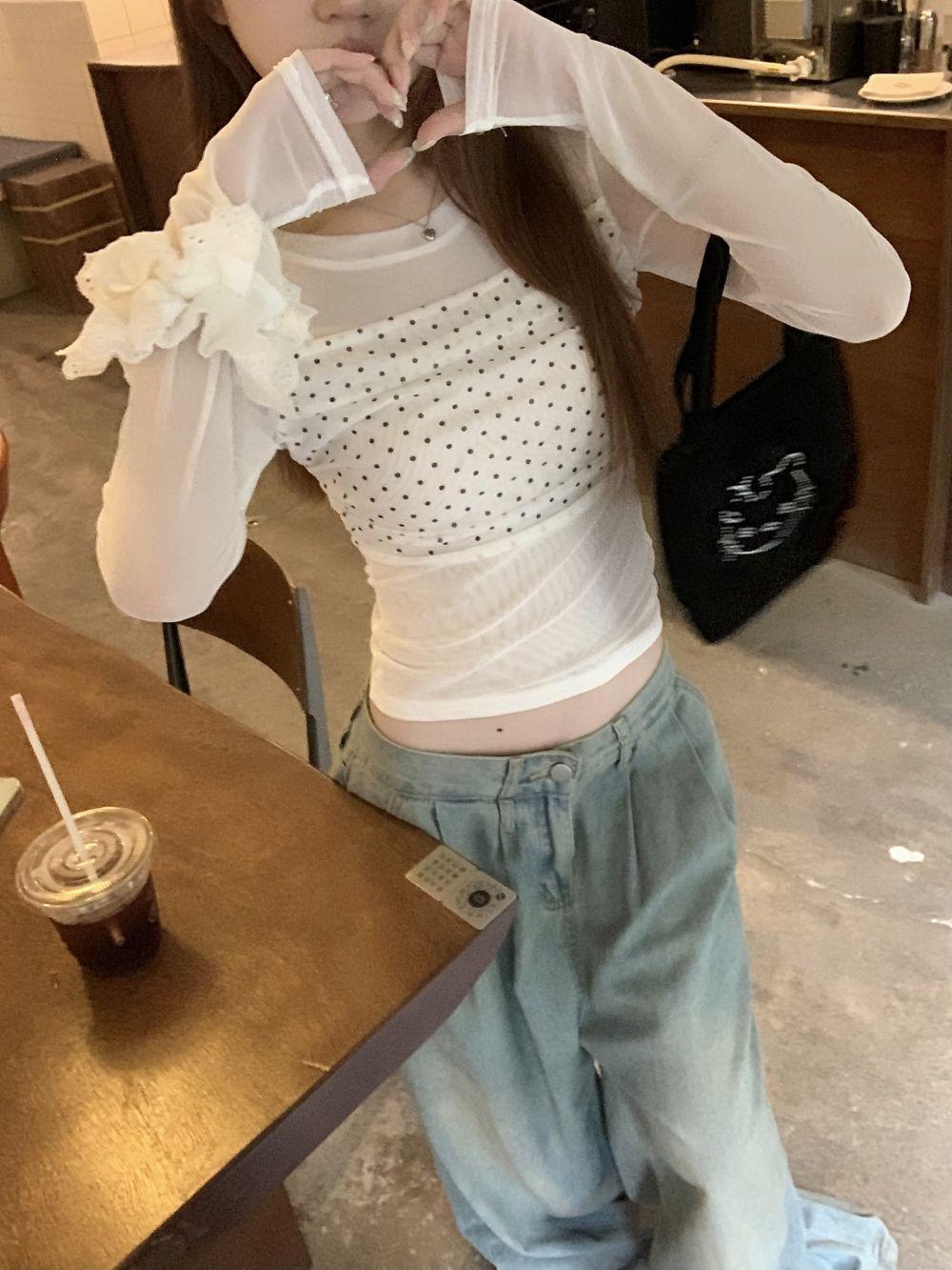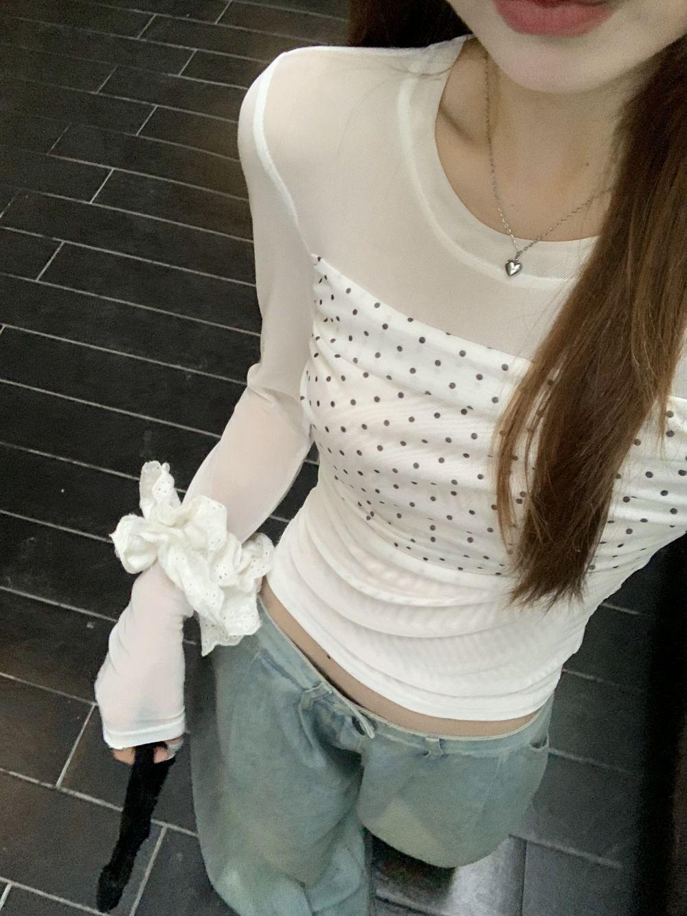 스파이스 걸스 화이트 폴로 도트 메쉬 긴팔 티셔츠 여성용 여름 디자인 센스 니쉬 슬림 핏 슬리밍 짧은 선 스크린 탑