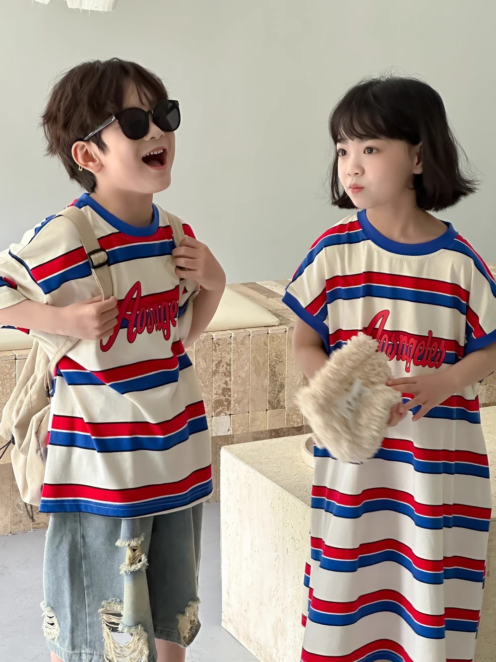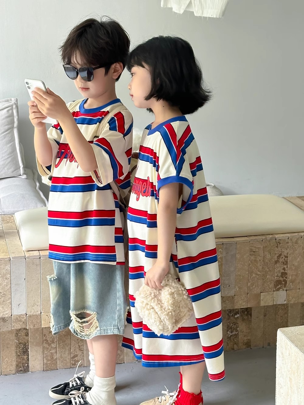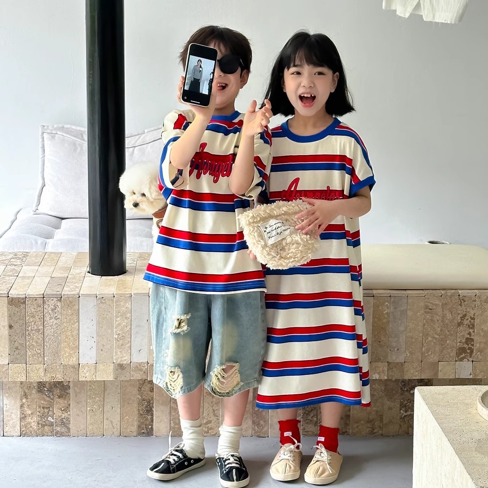 형제 자매 어린이 반팔 티셔츠 소년 소녀 다채로운 줄무늬 중간 길이 드레스 여름 아기 스타일 탑