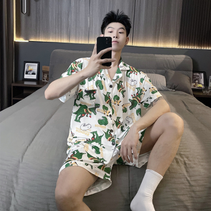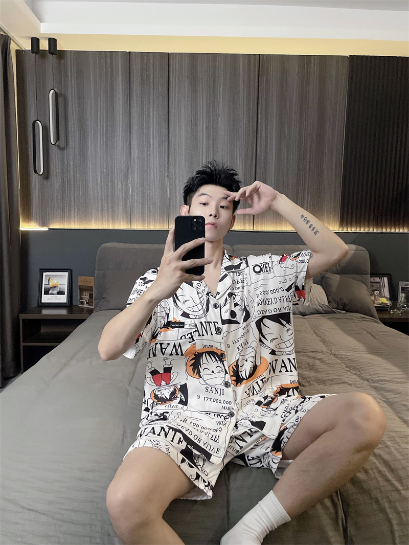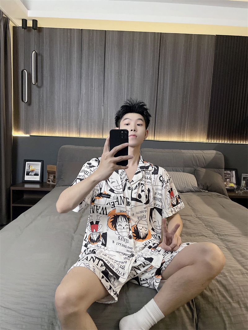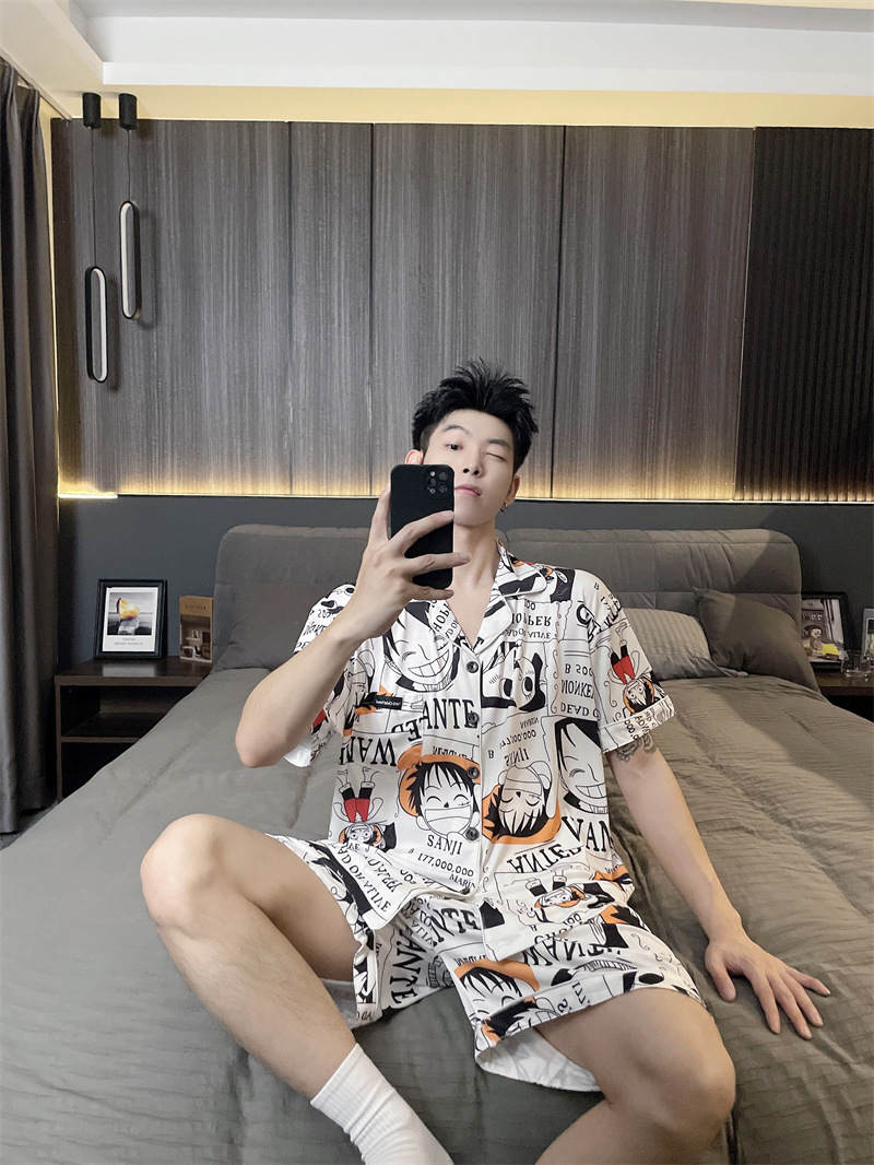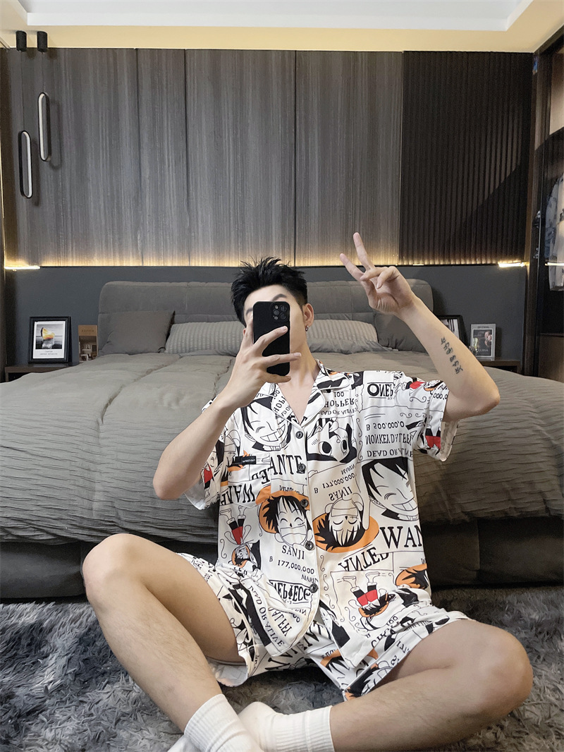 아이스 실크 잠옷 남자 여름 하이 엔드 반소매 지방 플러스 사이즈 100.00 kg-150.00 kg 유행 브랜드 만화 홈 의류 세트스토어 가기