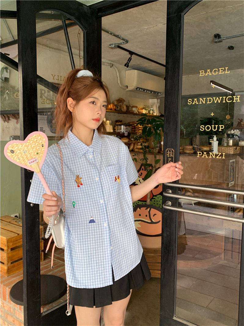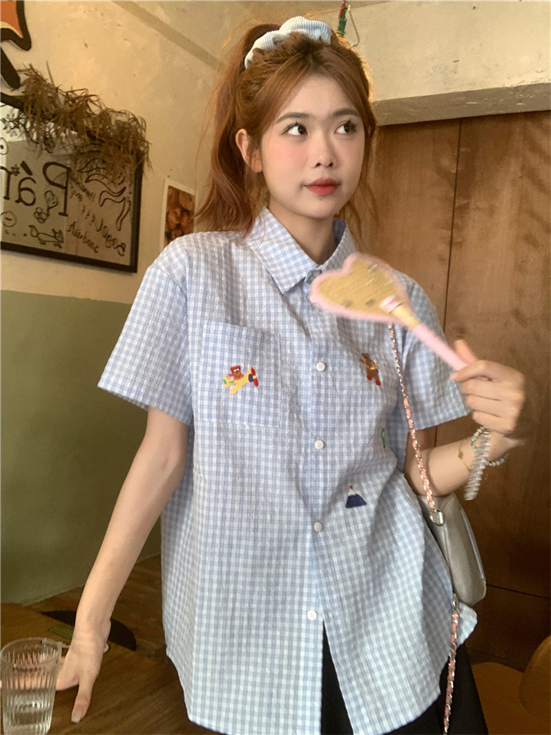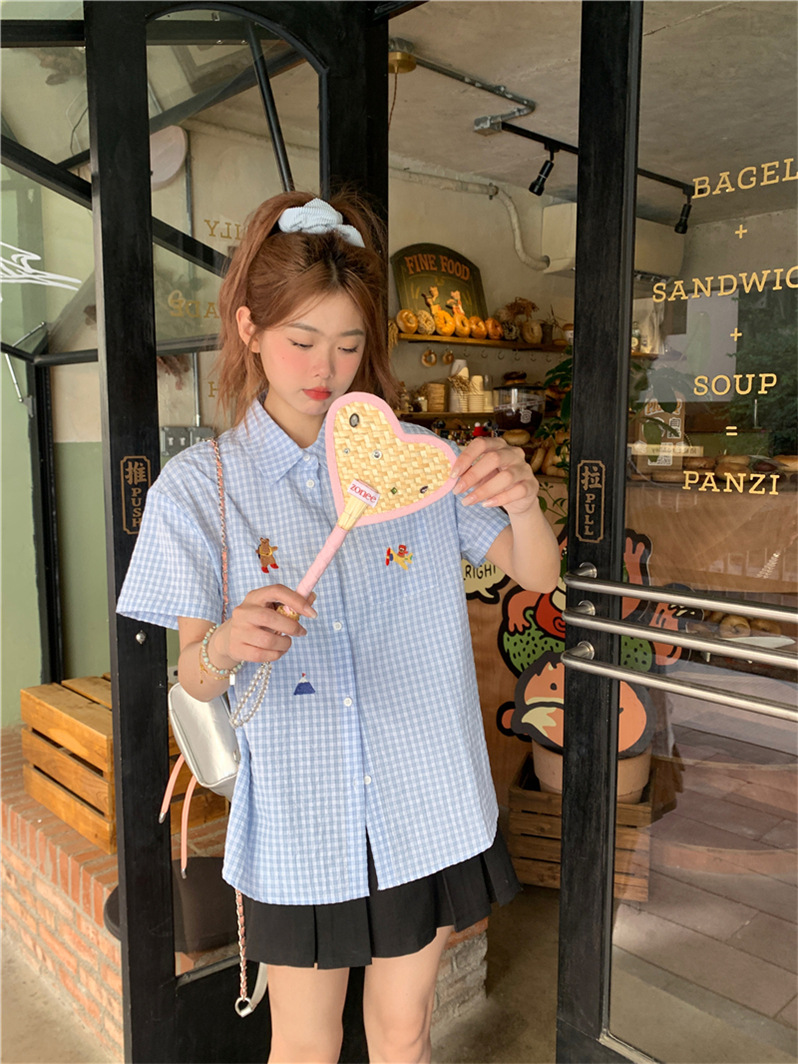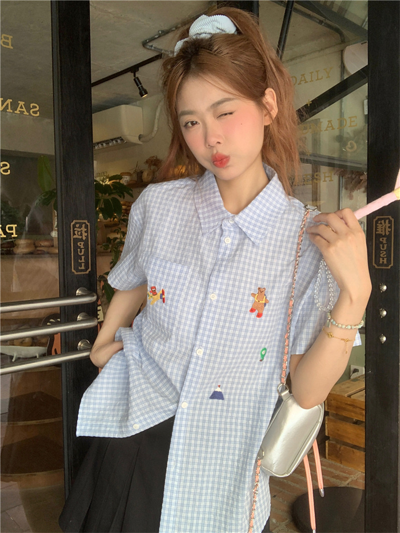 여름 새로운 패션 레트로 반팔 체크 셔츠 여성용 루즈 셔츠 니치 아웃웨어 탑 트렌디 카디건스토어 가기
