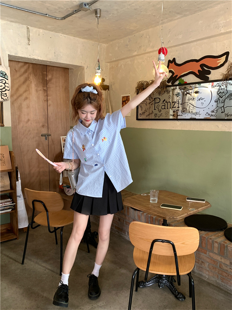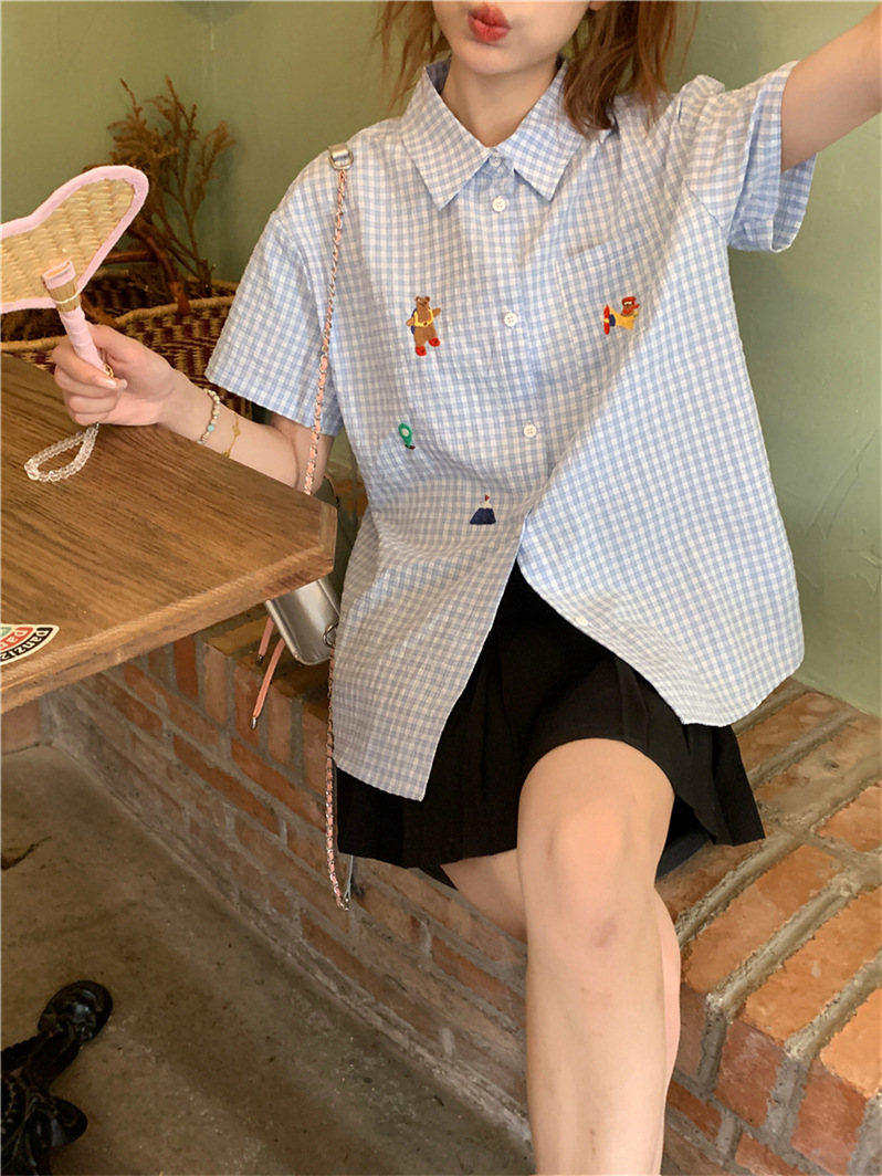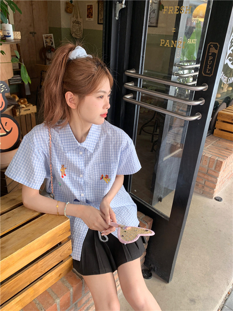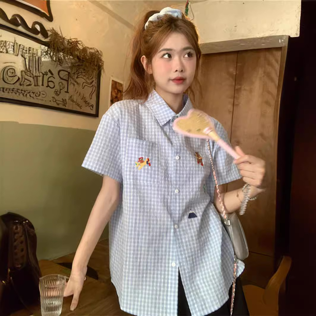 여름 새로운 패션 레트로 반팔 체크 셔츠 여성용 루즈 셔츠 니치 아웃웨어 탑 트렌디 카디건스토어 가기