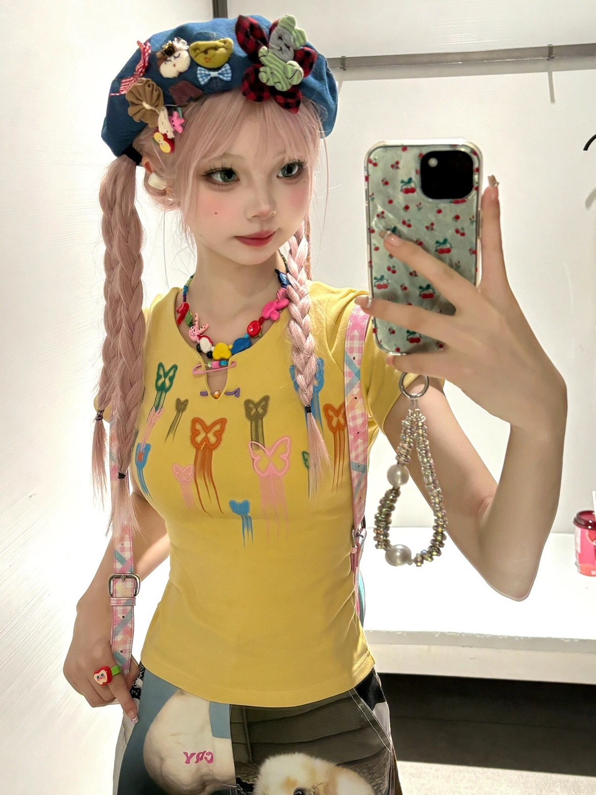 여름 도파민 티셔츠 여성의 여름 나비 인쇄 어깨 반팔 디자인 센스 틈새 쇼트 탑 Ins