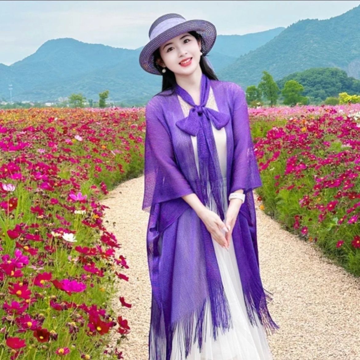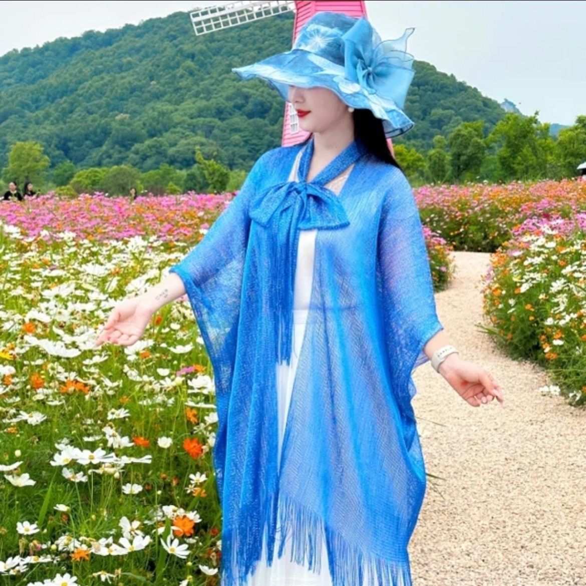[Wei Yi] 봄과 여름 2024 새로운 금과 실버 실크 밝은 실크 긴 술 코트 외국 스타일 여행 사진 밝은 색상