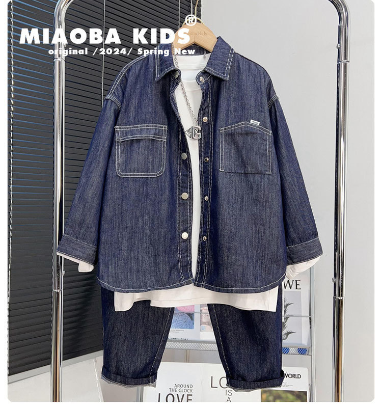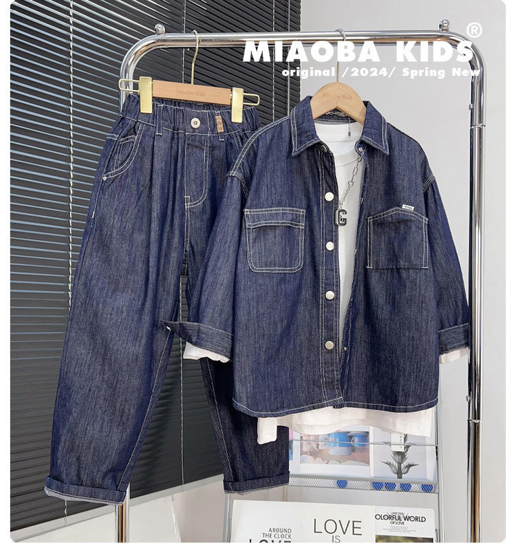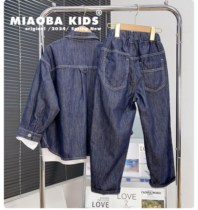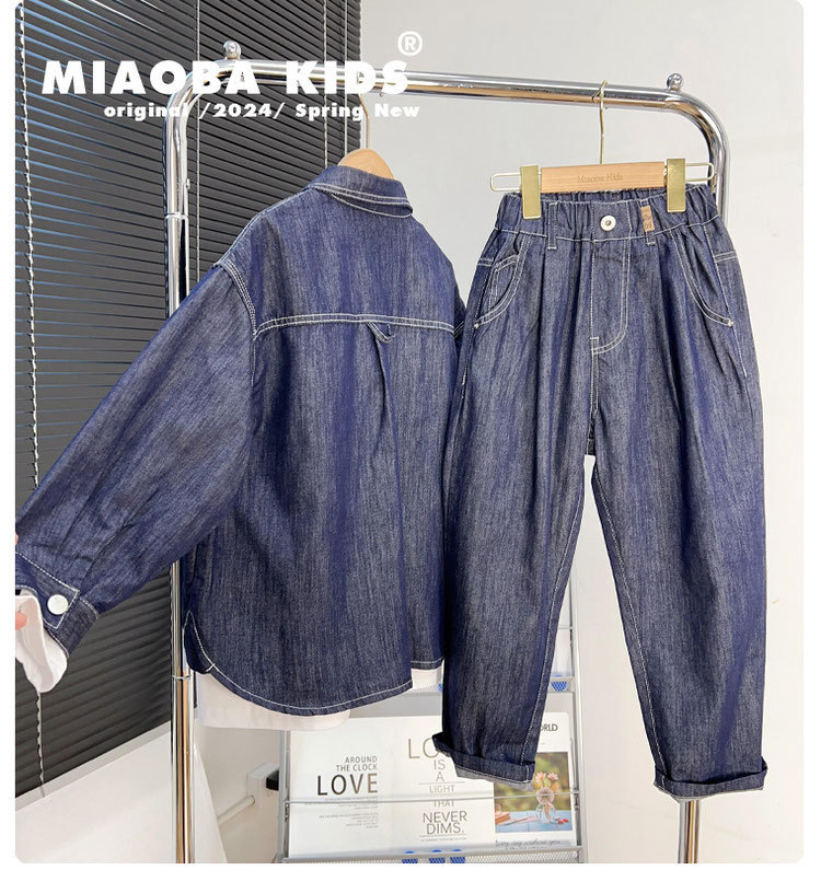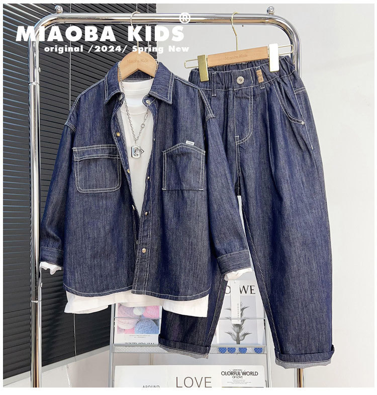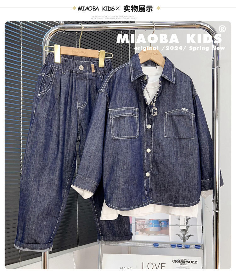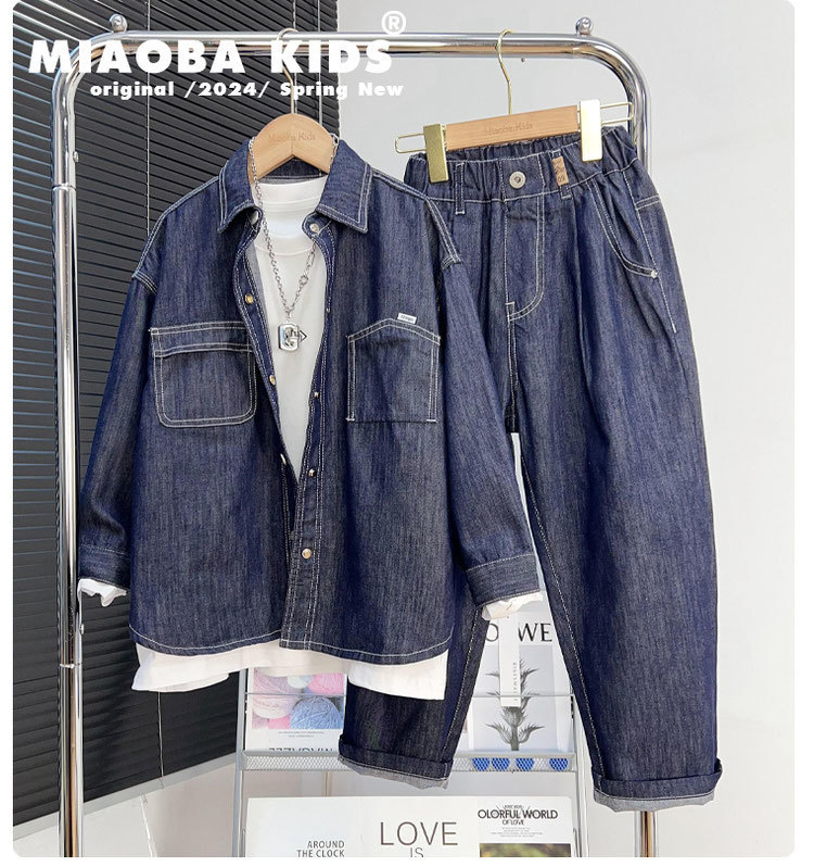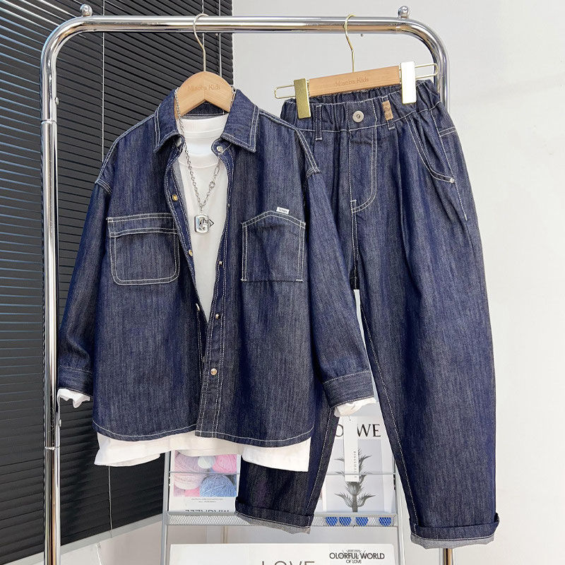 소년 데님 세트 2024 새로운 어린이 잘 생긴 유행 거리 탑 넓은 다리 바지 2 조각 세트 트렌디스토어 가기