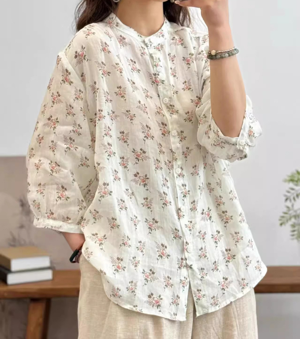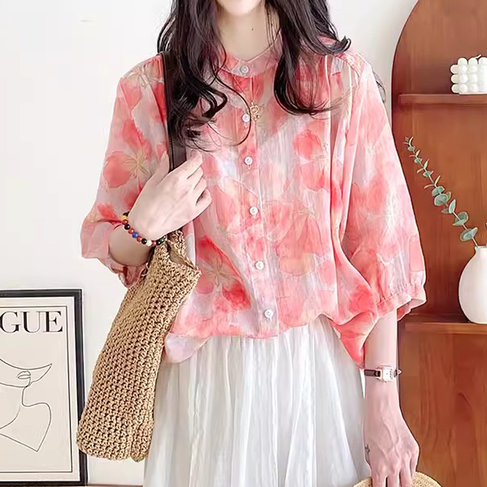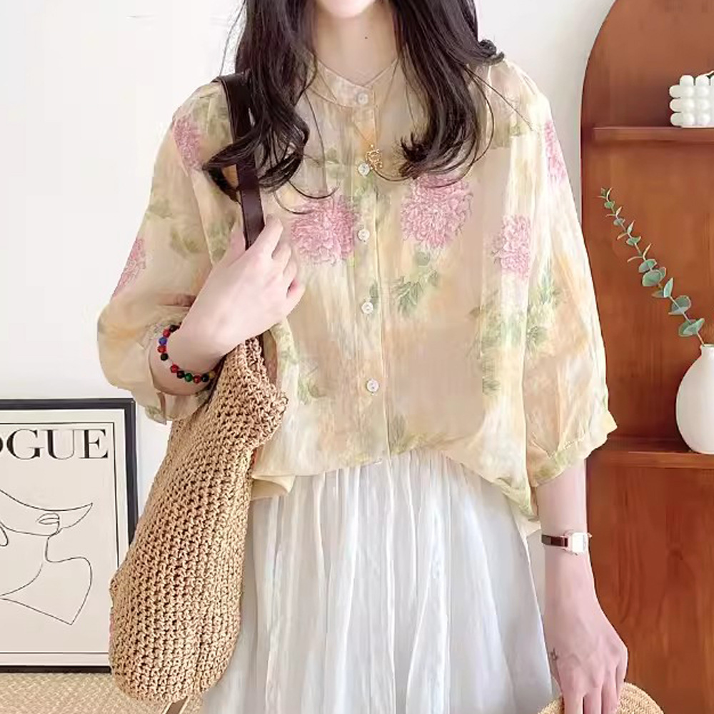 Qi 새겨진 인형 셔츠 최고의 여성 여름 2024 새로운 느슨한 예술적 달콤한 둥근 목 꽃 라미 셔츠스토어 가기
